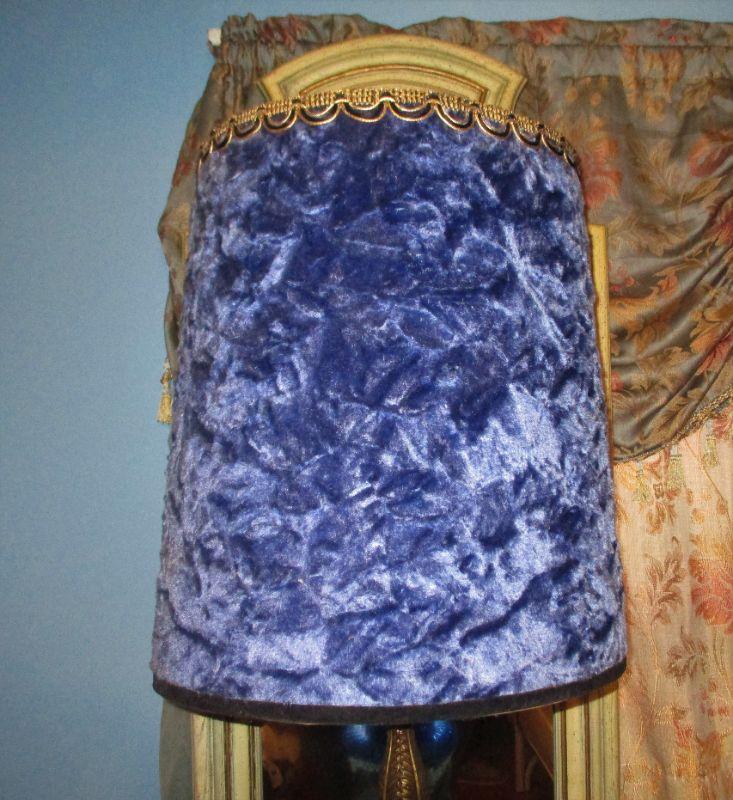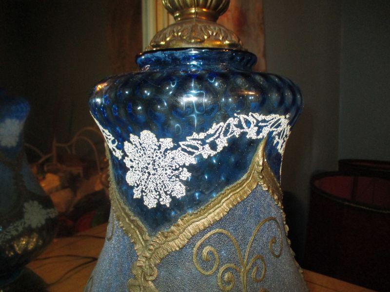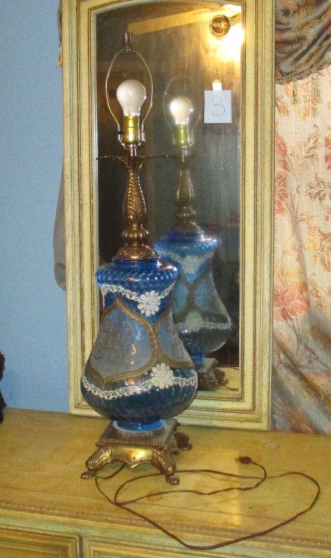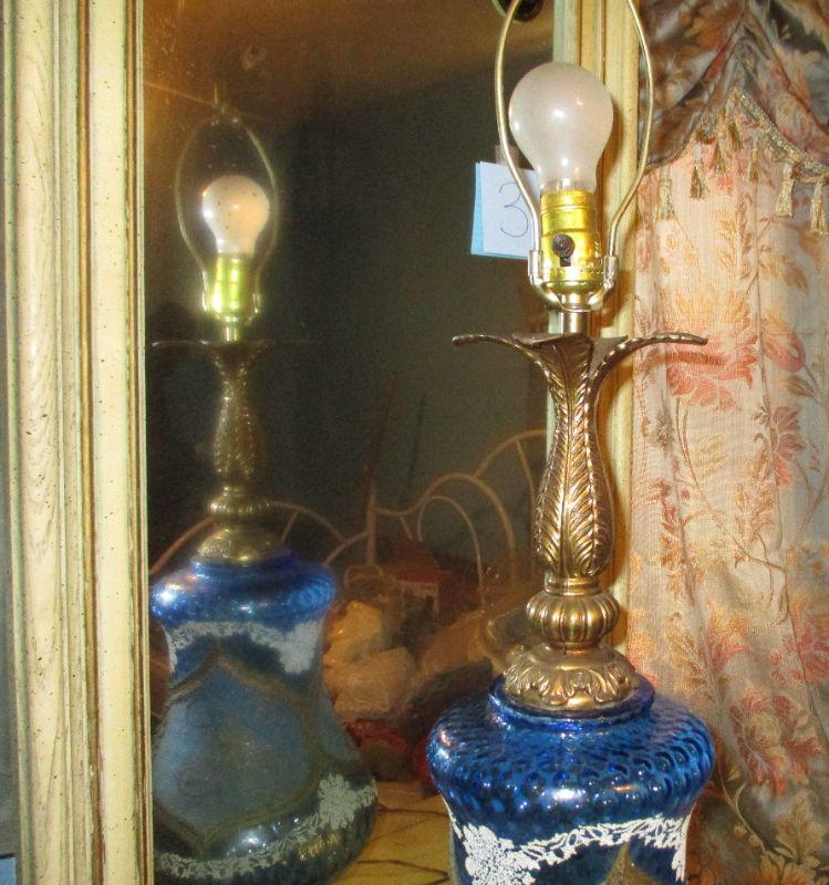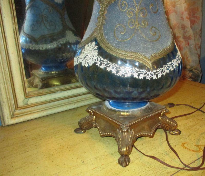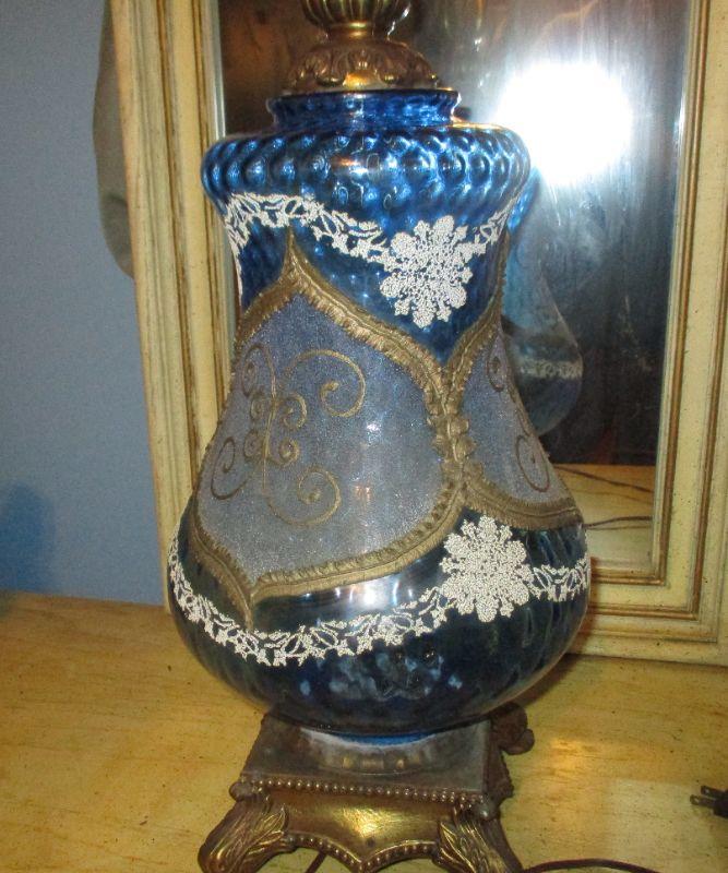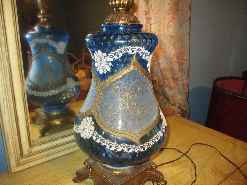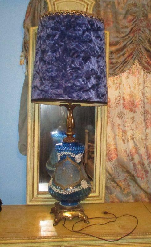 This lamp is stunning! It has a blue glass base that is embellished with white and gold paint. It has brass on the bottom and the top to finish it off. It does work (three way switch), but the pieces need to be tightened. Check out the blue velvet shade - yeah baby! (in my best Austin Powers voice). The lamp (without the shade) is about 35.5" tall.
