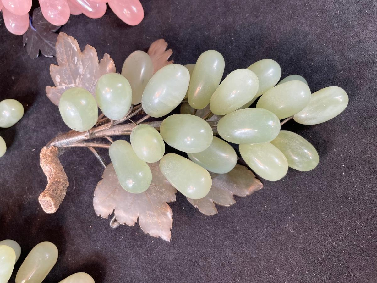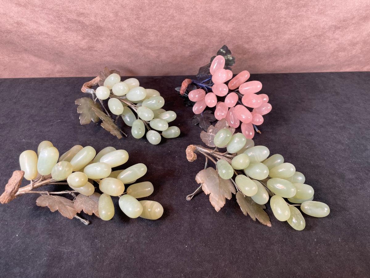 Four bunches of grapes made of carved alabaster with jade leaves. High quality and in perfect condition