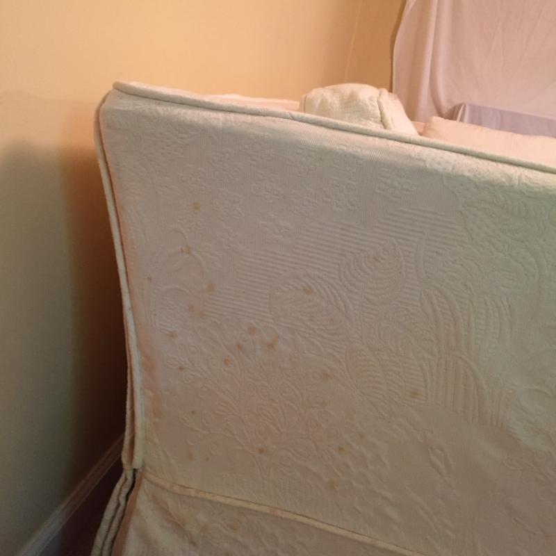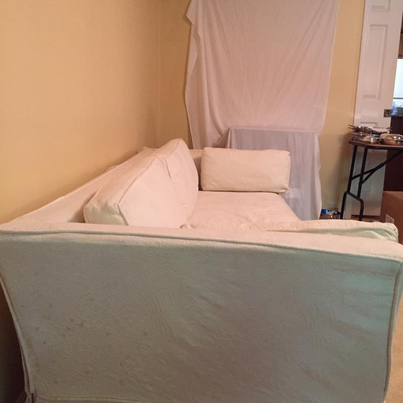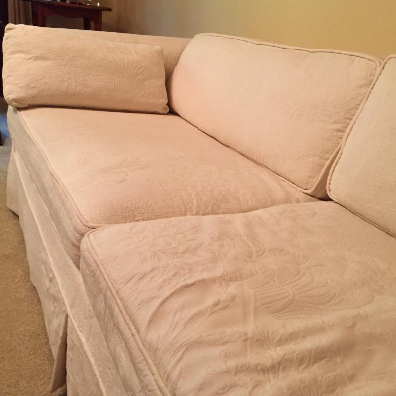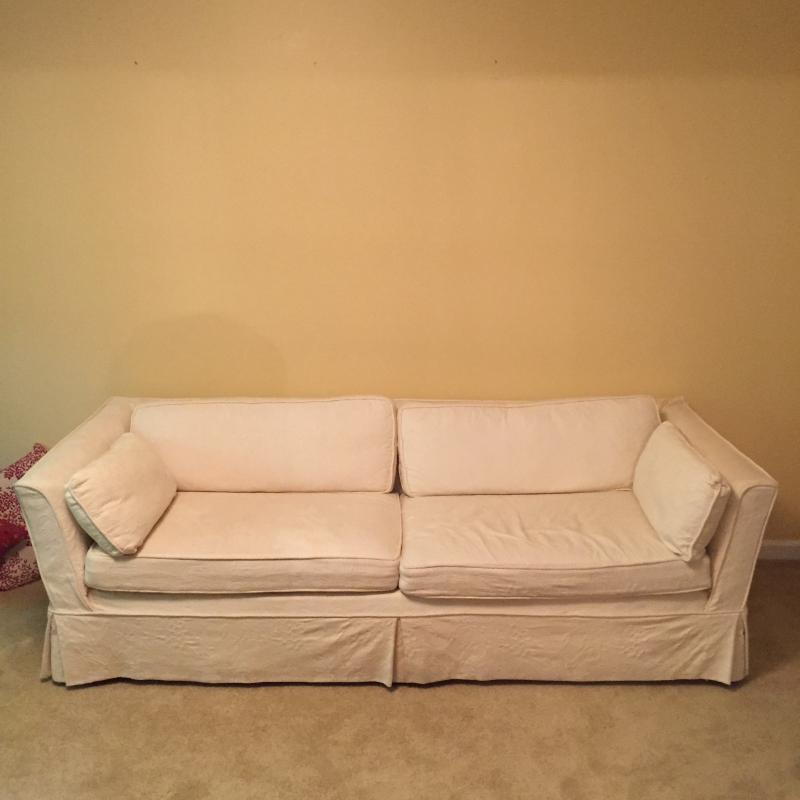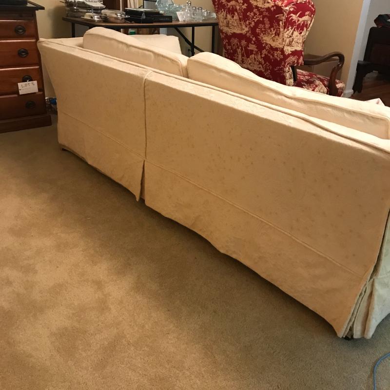 Large Heritage Brand cloth sofa with White Slip Cover. Slip cover has some stains on back and side that could possibly be removed in wash. The original fabric seems to be in great condition but we did not take the slip cover completely off. Photos show original beige floral design of sofa. Measures Approximately 85”x33.5”x26”. Local Pickup Only