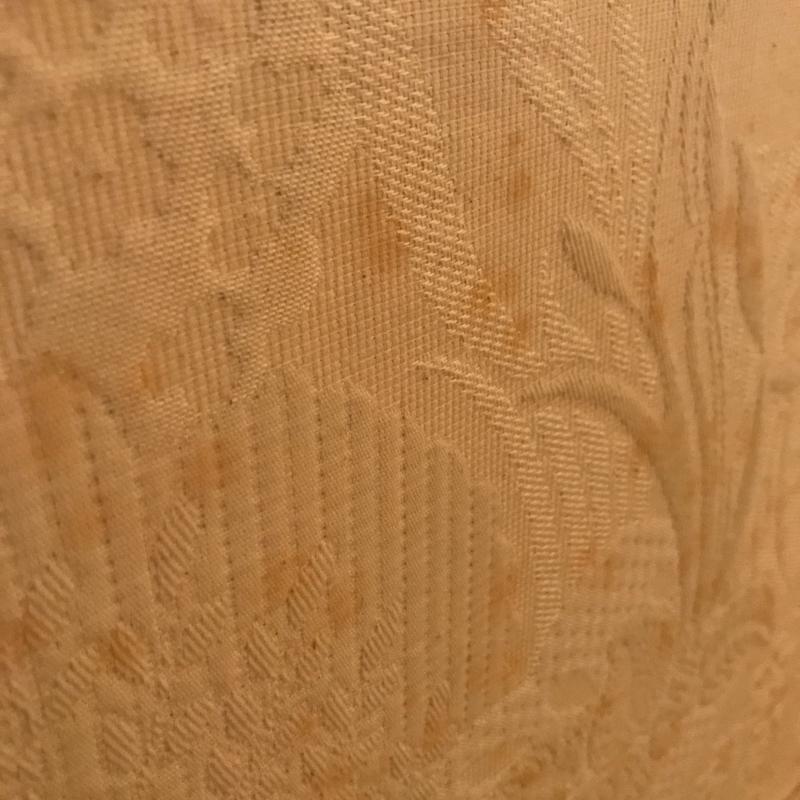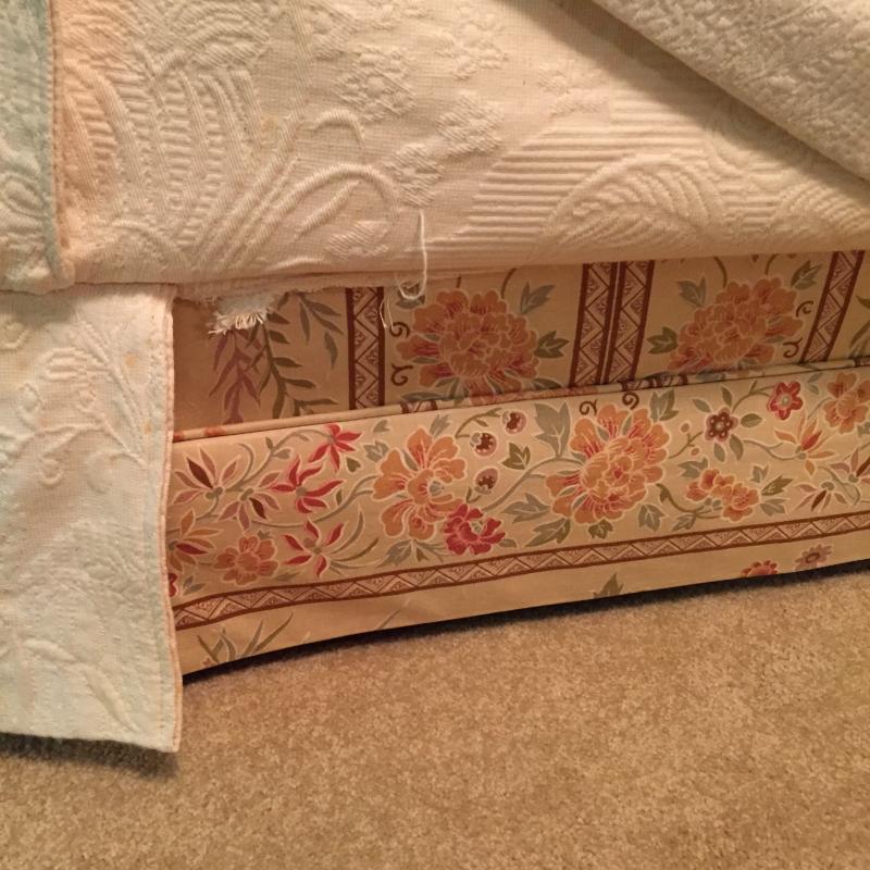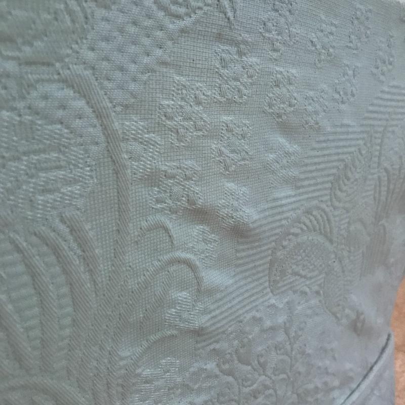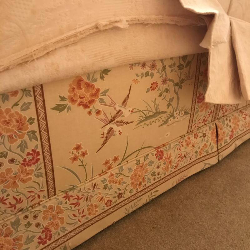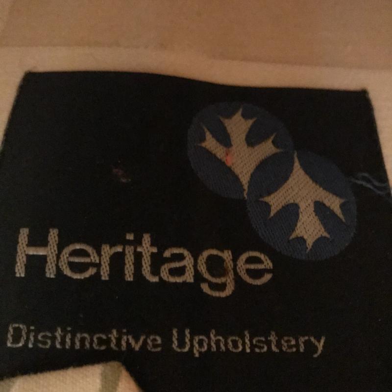 Large Heritage Brand cloth sofa with White Slip Cover. Slip cover has some stains on back and side that could possibly be removed in wash. The original fabric seems to be in great condition but we did not take the slip cover completely off. Photos show original beige floral design of sofa. Measures Approximately 85”x33.5”x26”. Local Pickup Only