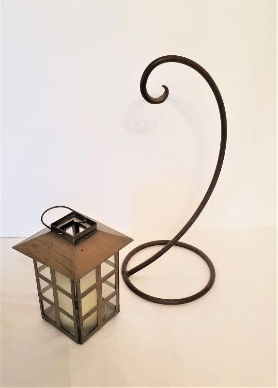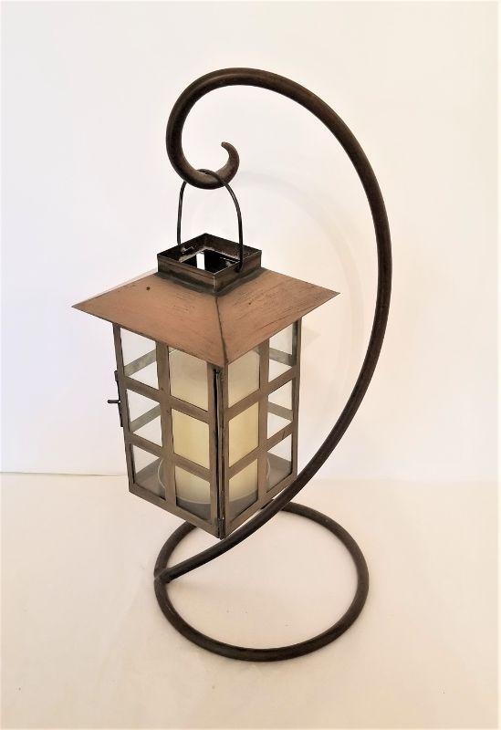 Nice indoor/outdoor/patio decorative metal candle lantern (includes candle) on curved iron stand. Good condition - stands 16" tall. Lantern is 6.5" tall.