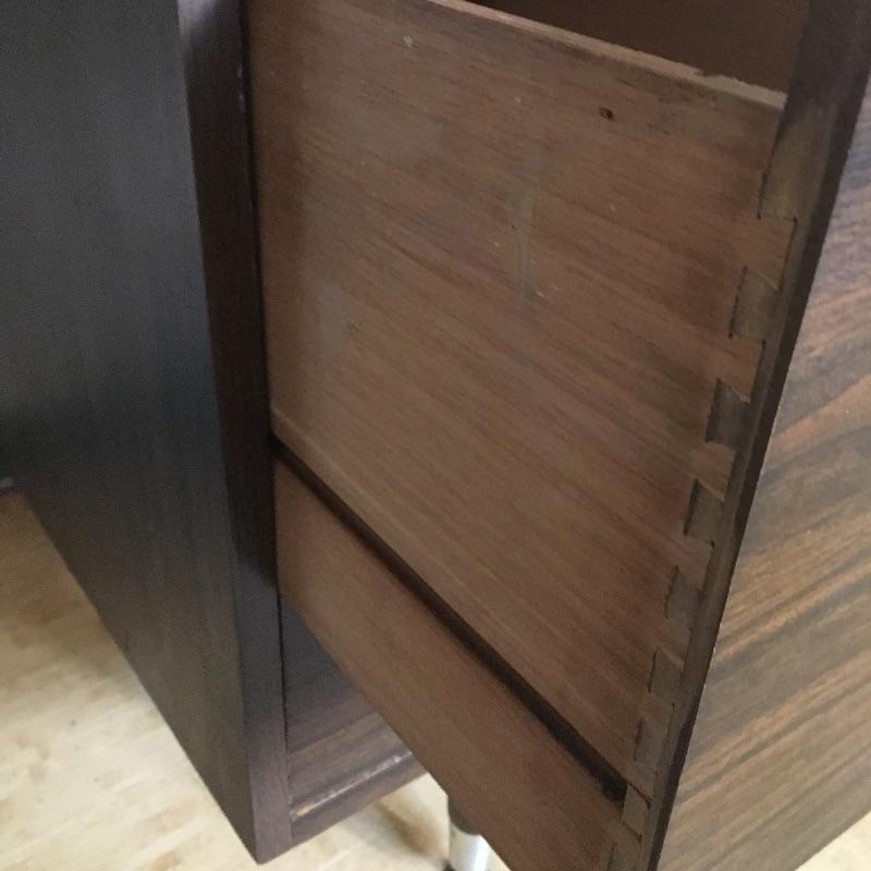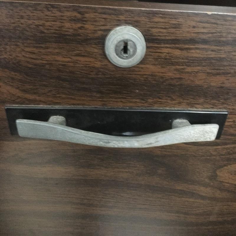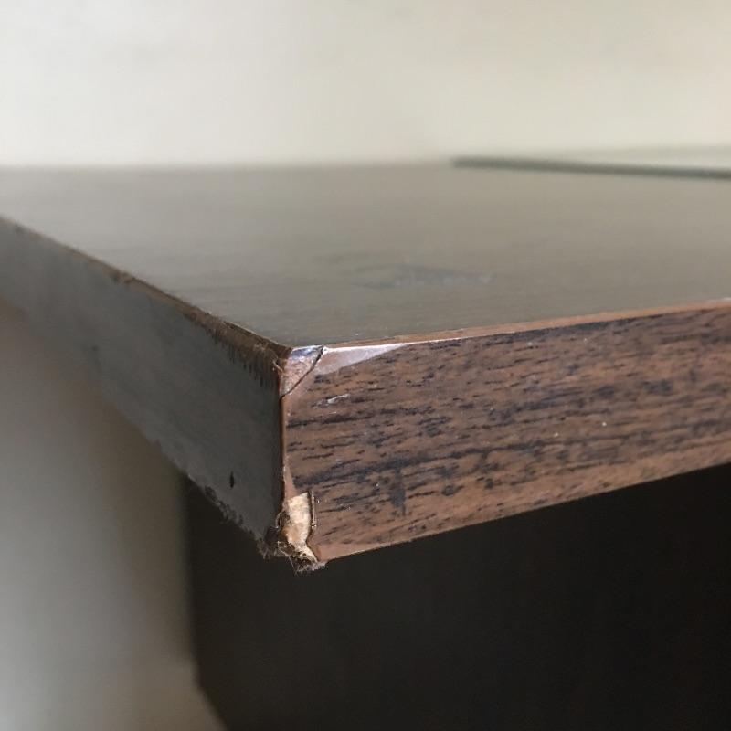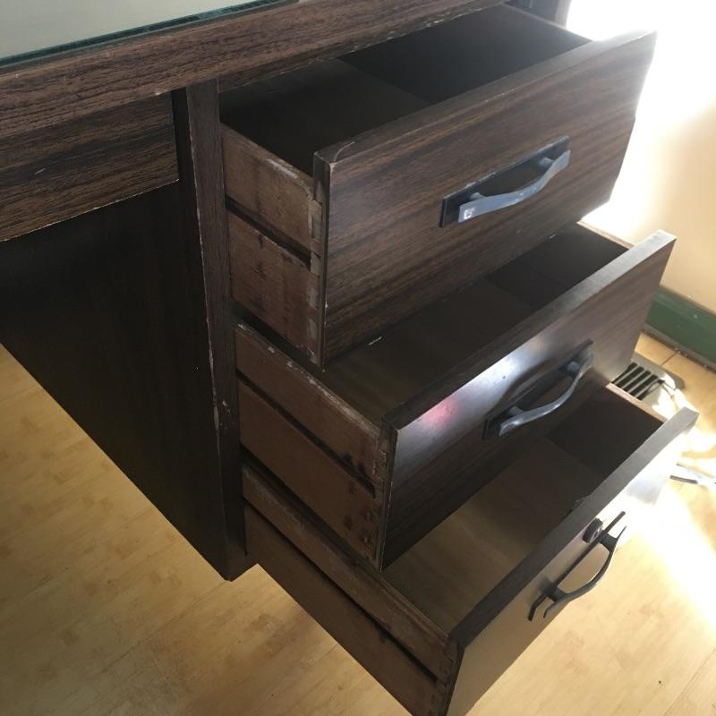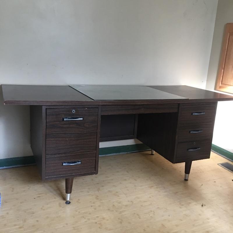 Large desk with six dovetailed drawers and a 28” x 30 piece of glass sitting on top. Desk is in good condition with a few defects on top and no key, see pictures. Desk measures 28.25” x 72” x 29.5”. Bring help item is substantial.