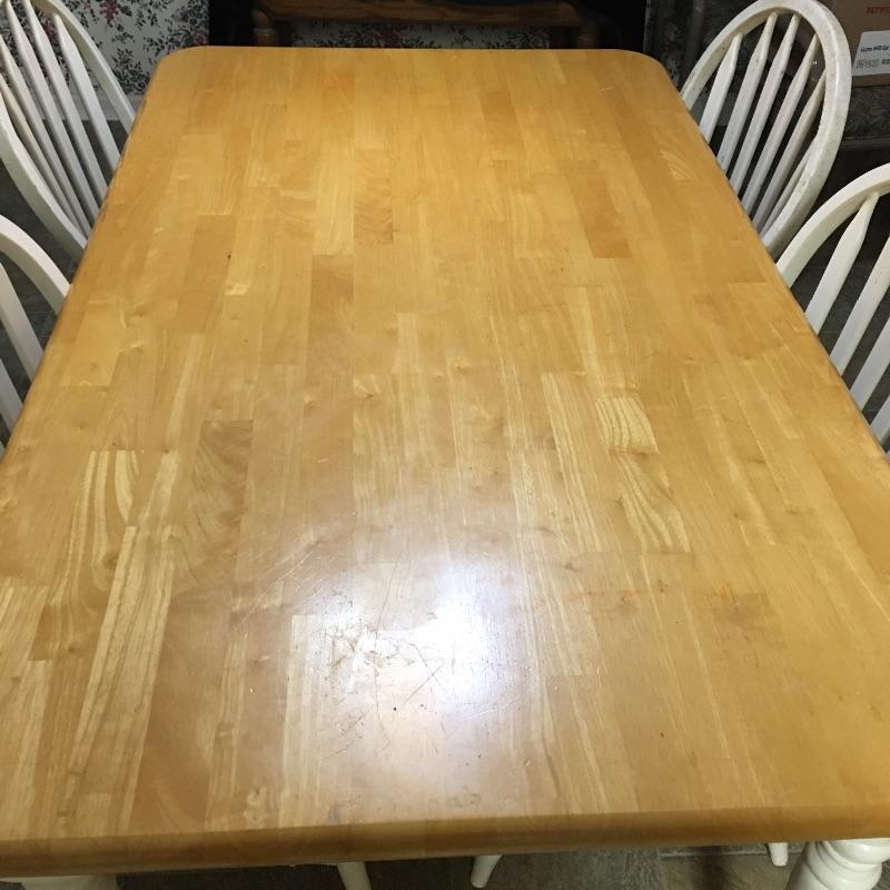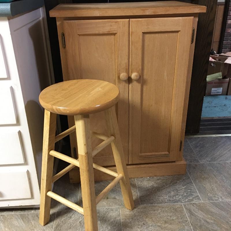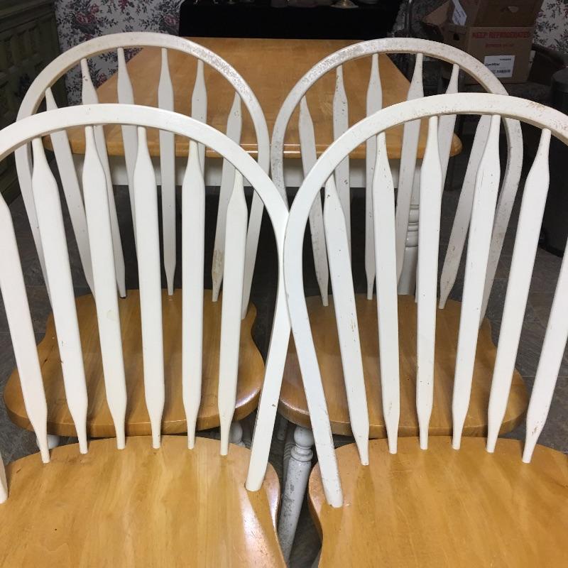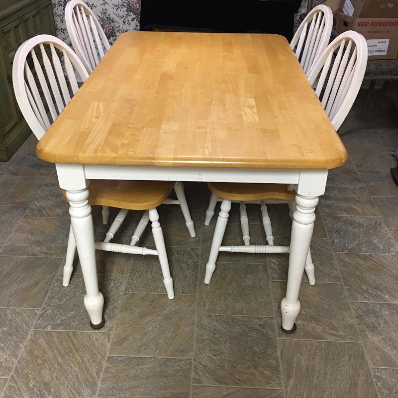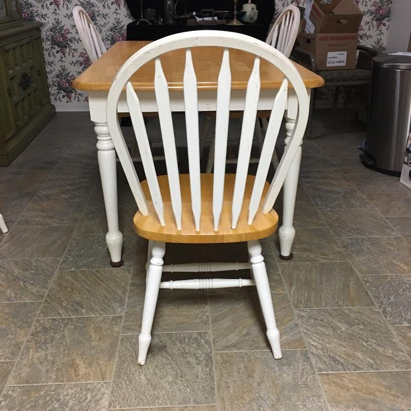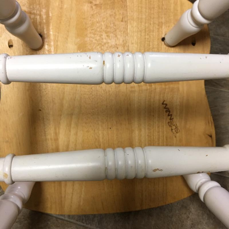 Finish your home with this selection of wooden furniture. Lot includes painted white and natural wood farm type table with four chairs, wood stool and an unfinished cabinet with an adjustable shelf. Table and chairs have scratches and wear, see pictures. Table measures 36” x 60” x 30” and cabinet measures 16.75” x 25.5” x 34.5”.