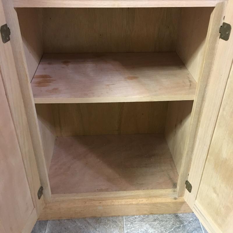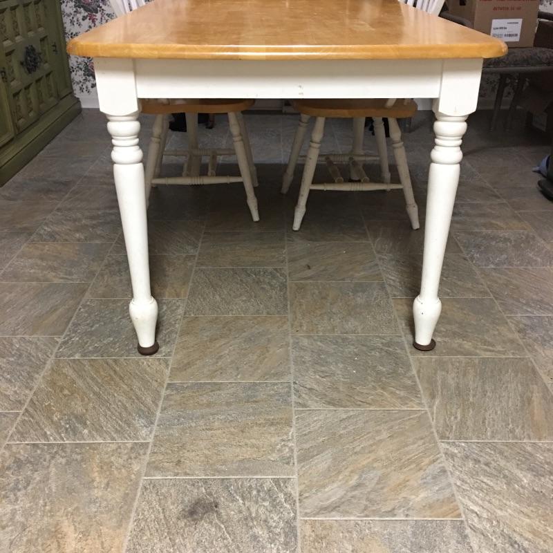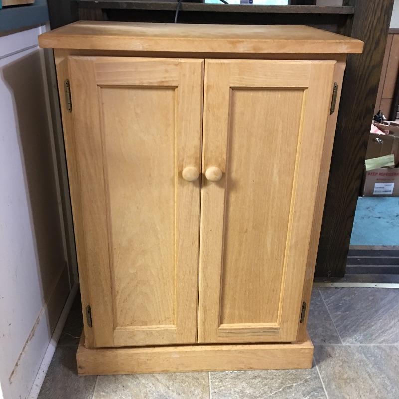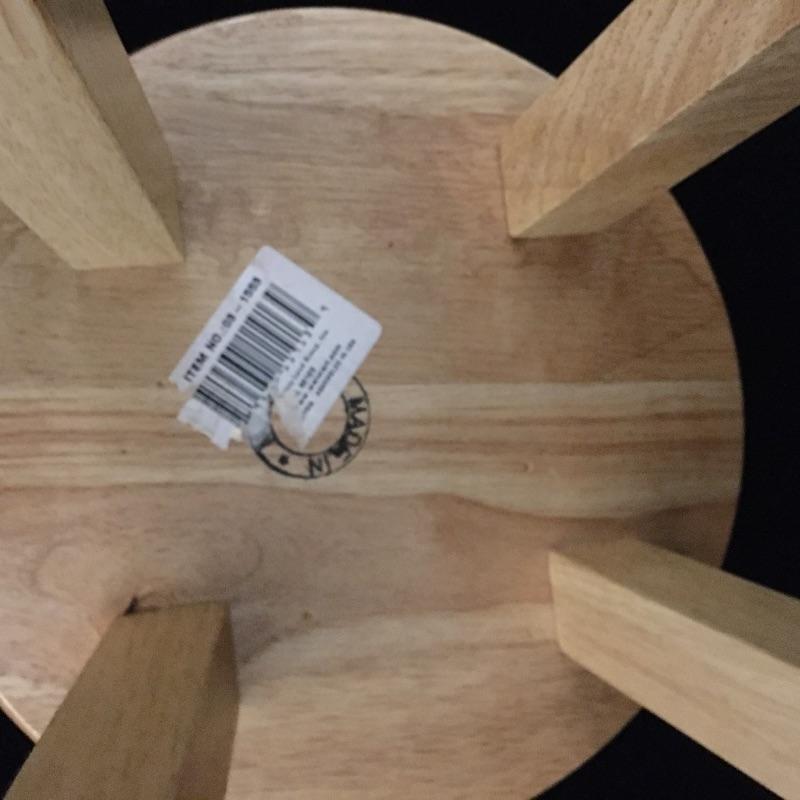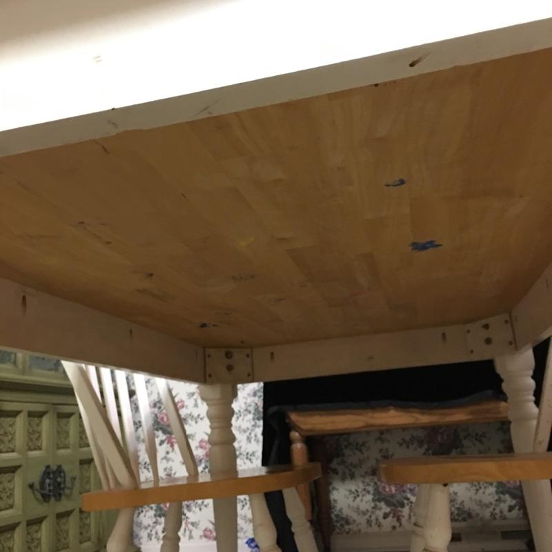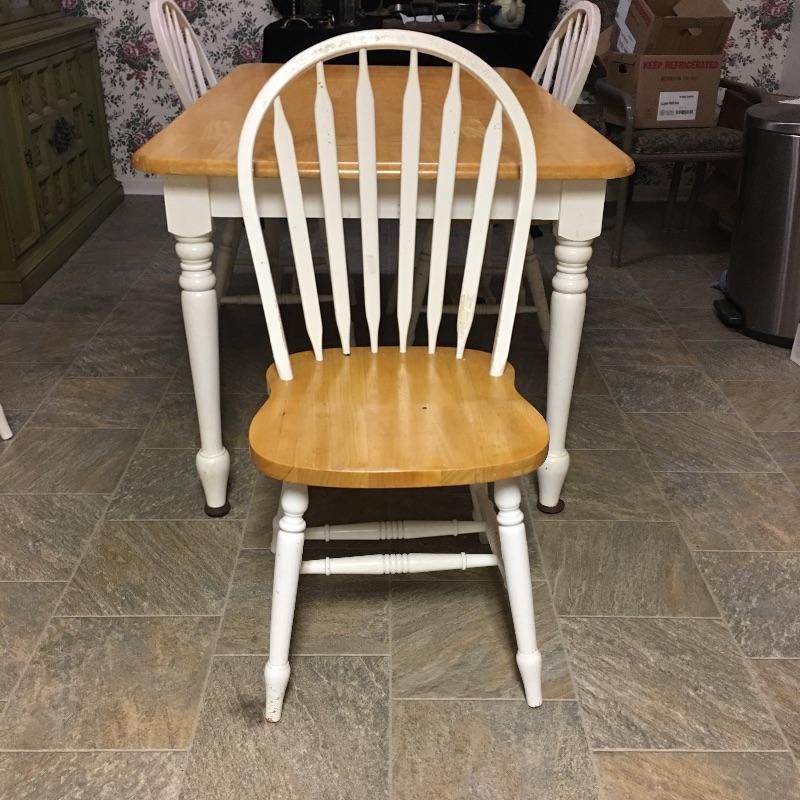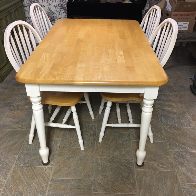 Finish your home with this selection of wooden furniture. Lot includes painted white and natural wood farm type table with four chairs, wood stool and an unfinished cabinet with an adjustable shelf. Table and chairs have scratches and wear, see pictures. Table measures 36” x 60” x 30” and cabinet measures 16.75” x 25.5” x 34.5”.