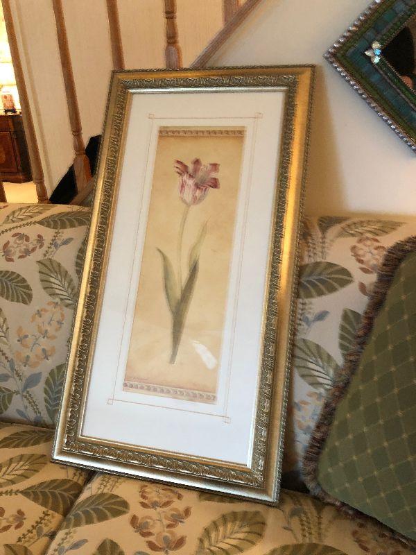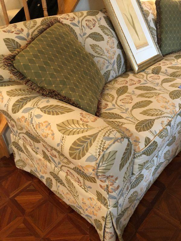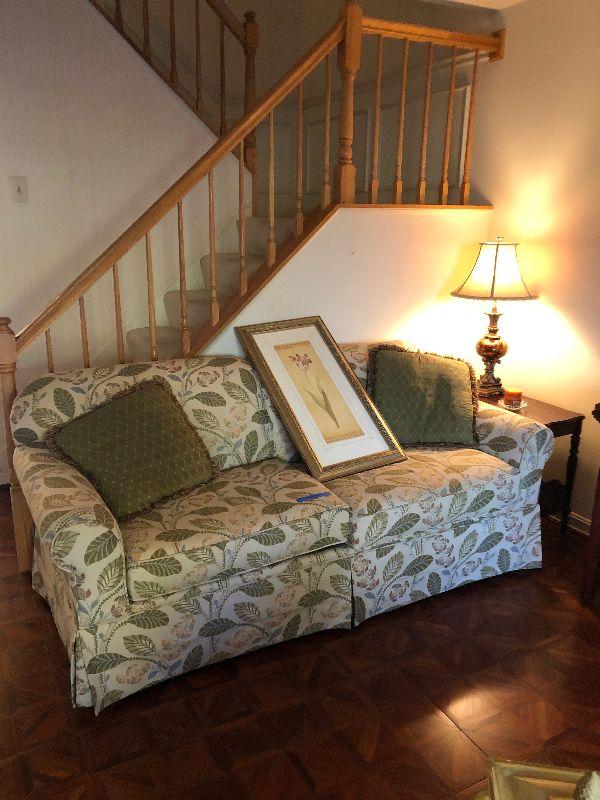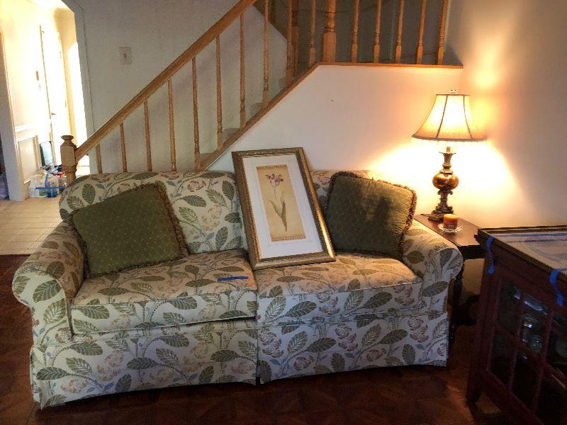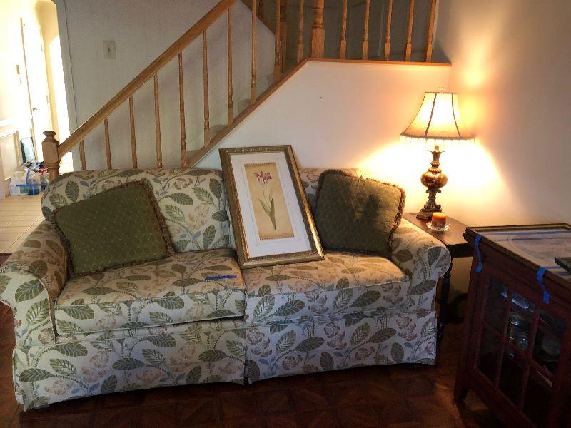80" Long Floral Sofa with Contrasting Pillows, End Table, Lamp, Floral picture and Candle.