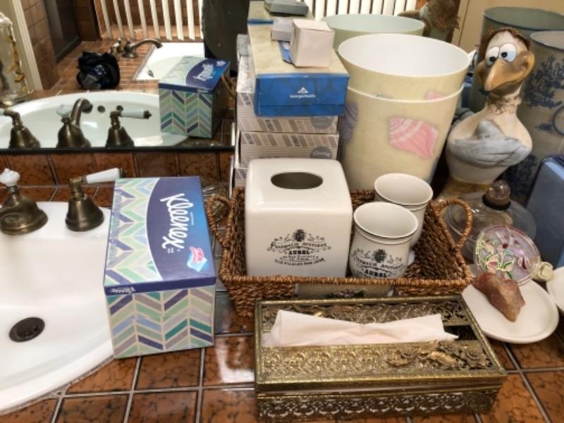 Lot 18. Four bath waste baskets, 3 tissue holders, tissue, night lights, soap, powder jars, decorative bottles, soap dish, etc.--WAS $45““NOW $22.50