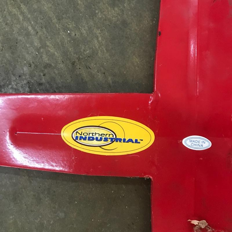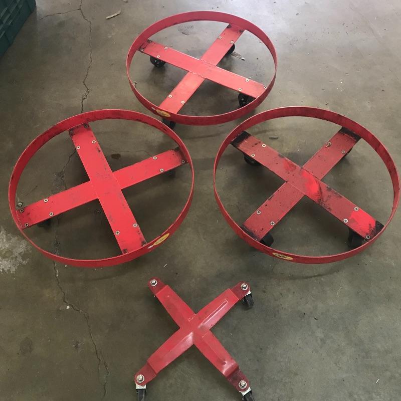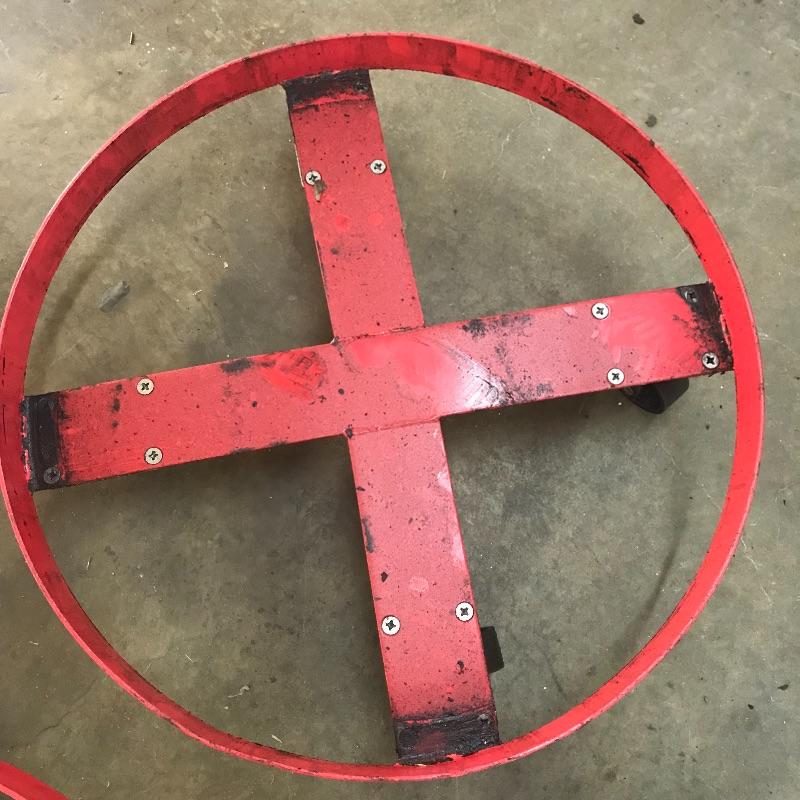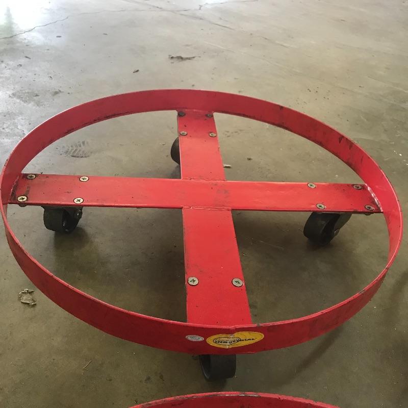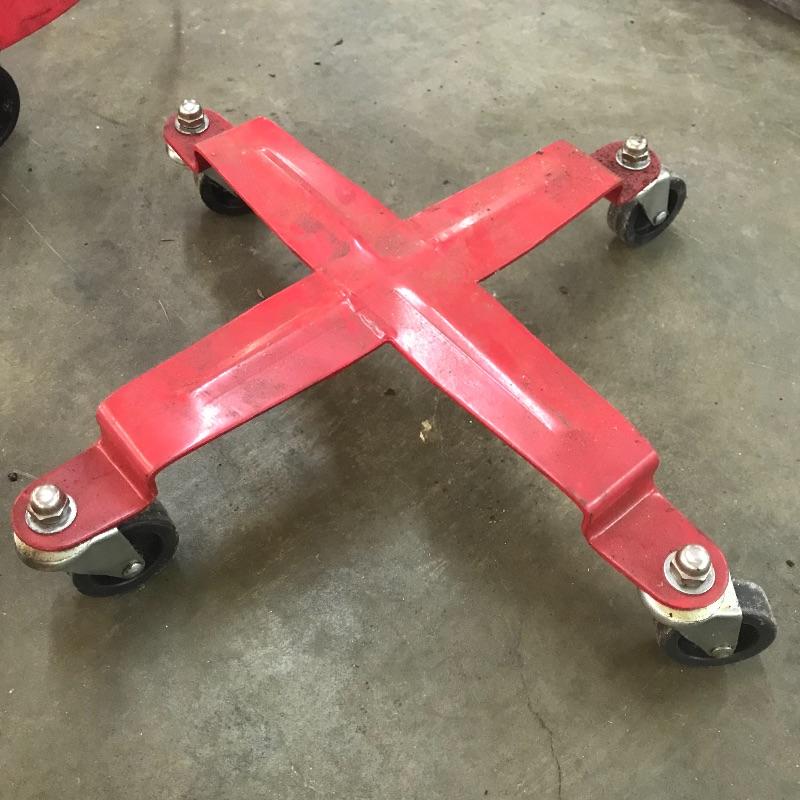 Casters make everything easier! Four cherry red Northern Industrial casters. Three large round casters have a 24” diameter and stand 6” high on hard plastic wheels. The small X caster is 17”sq. See photos. No shipping.