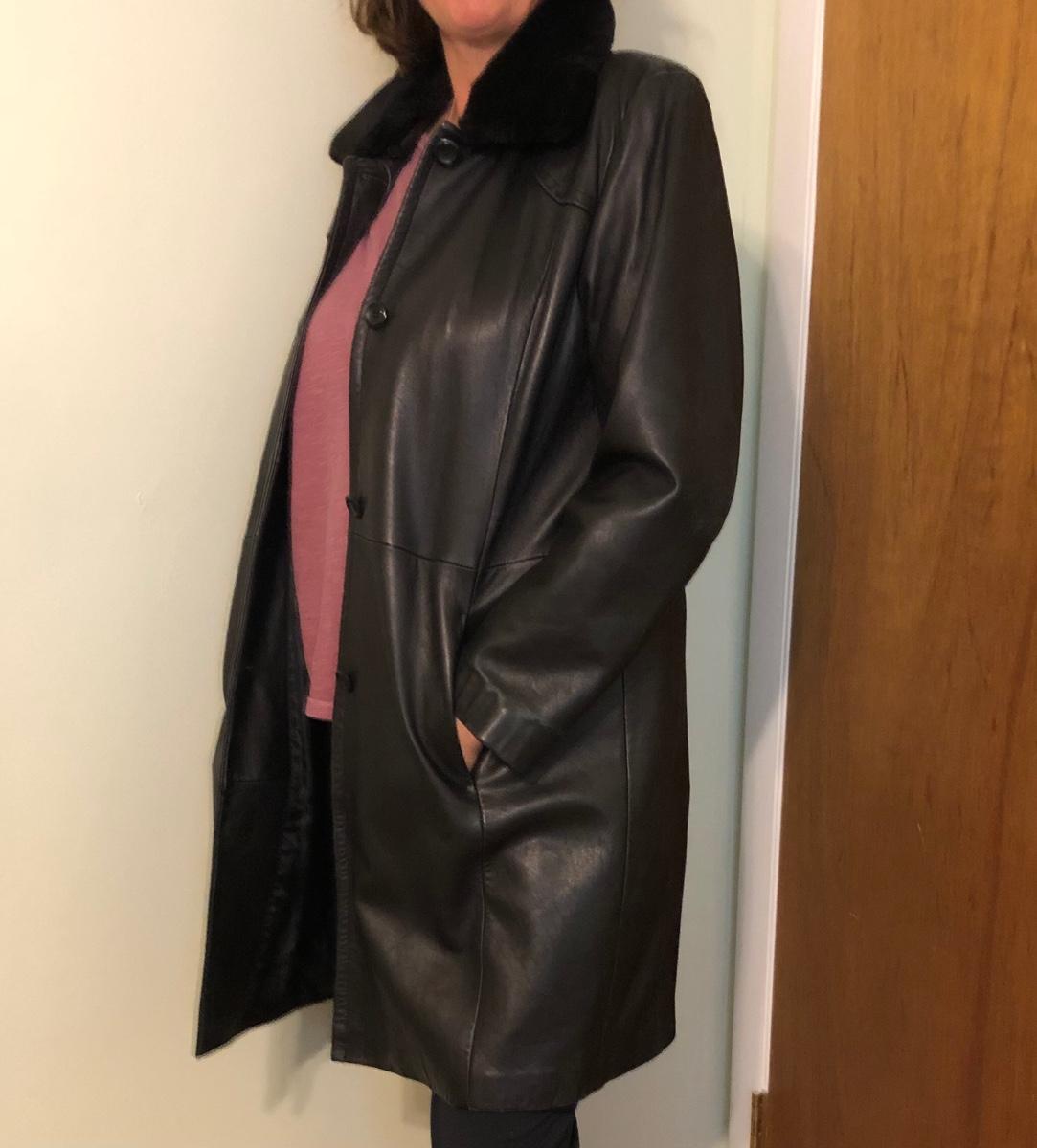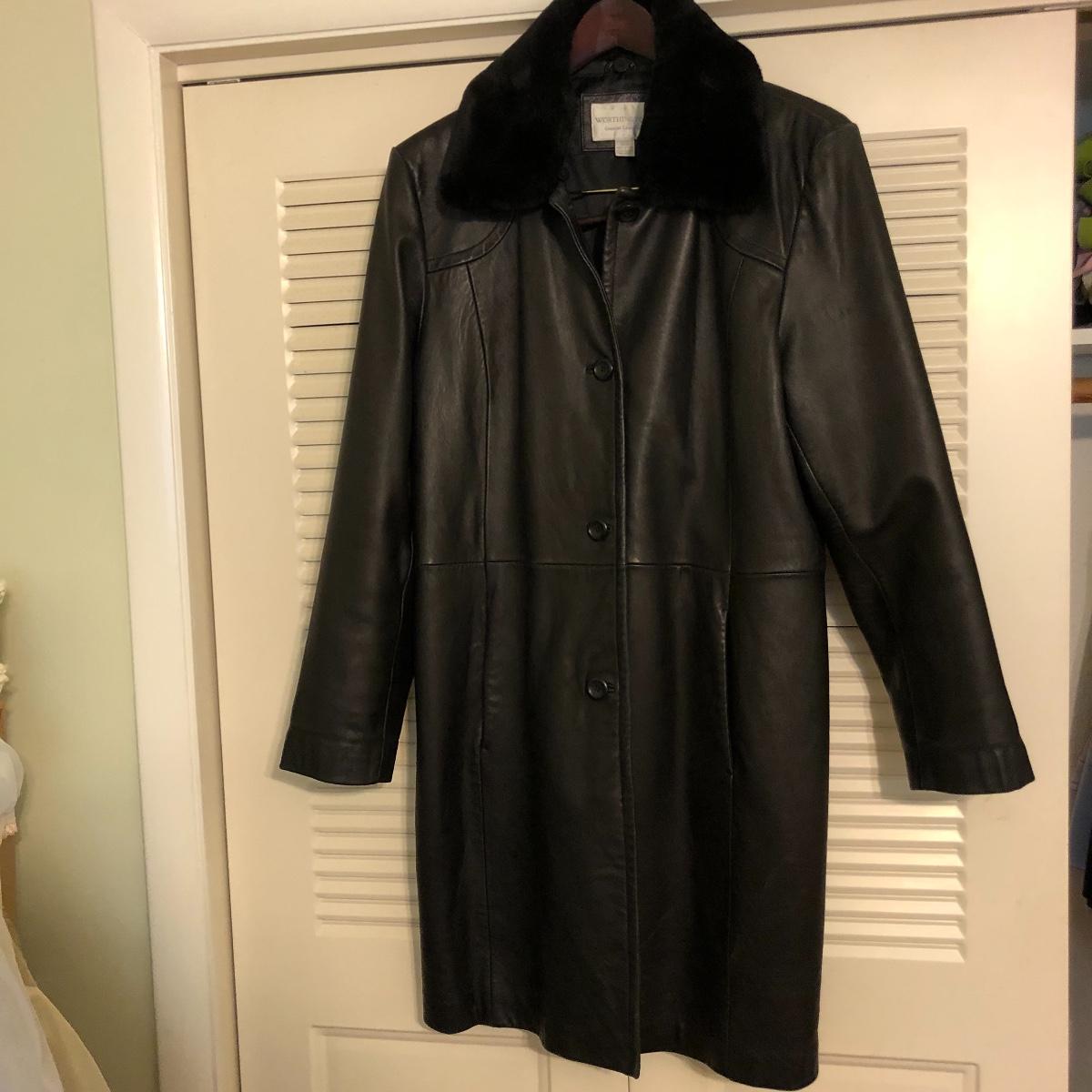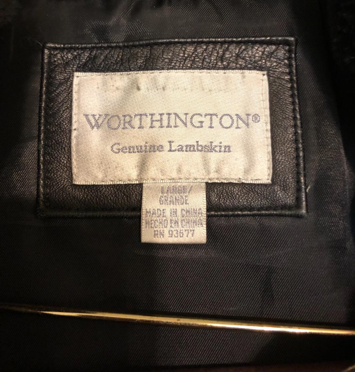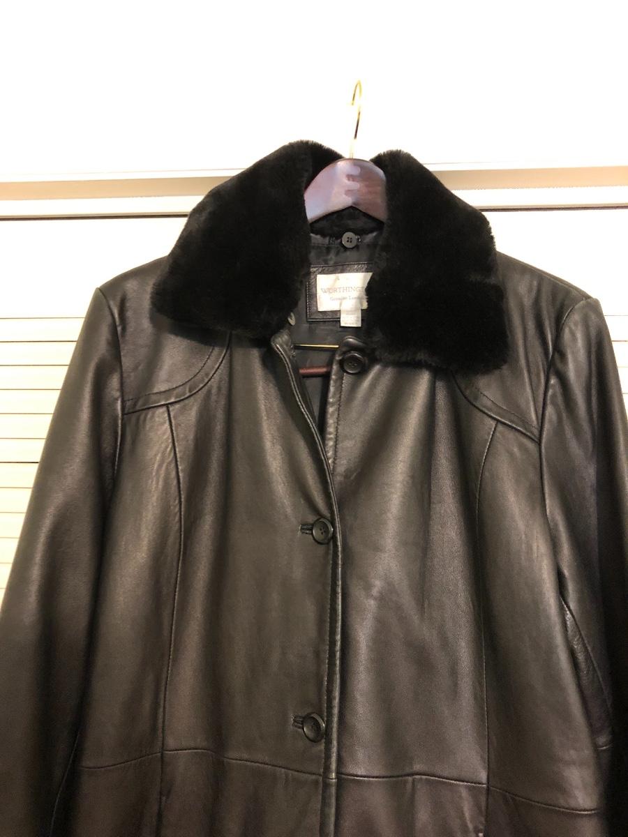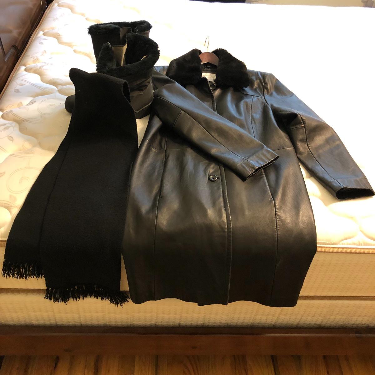 This size large, black Worthington lambskin jacket is soft as butter and extremely lightweight and comfortable. The faux fur collar is detachable. We have paired this jacket with a black scarf and a pair of size 9.5 rain resistant black boots with faux fur lining.