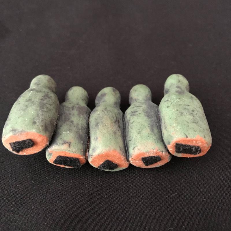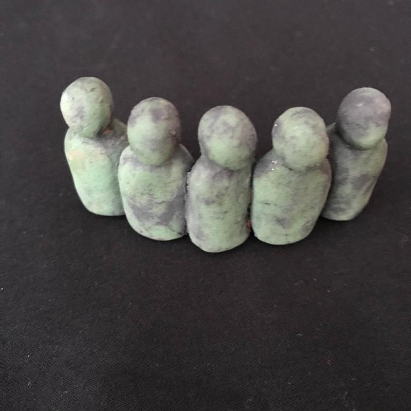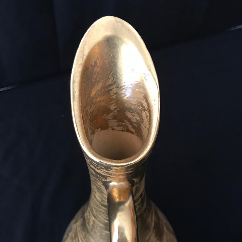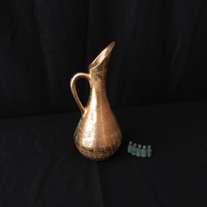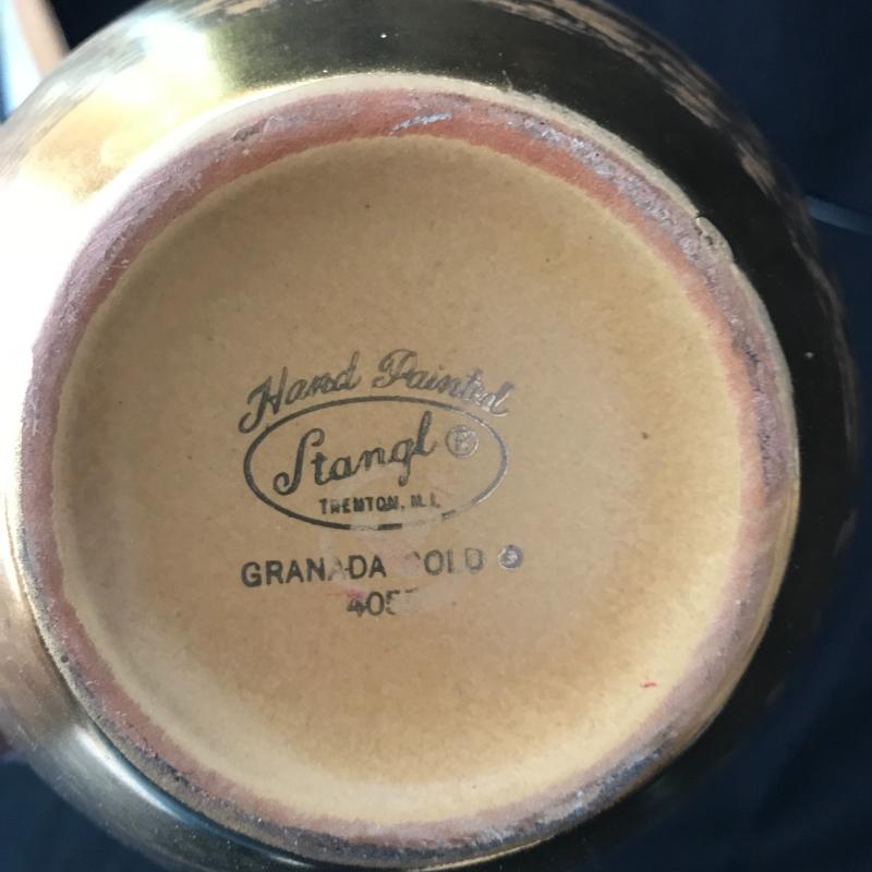Hand painted Stangl Pottery stands approx 12” tall. Has an antique gold finish. Accompanied by a small unique green clay figurines 2.5”w x 1.5”h that resembles a crowd of five with felt on the base. Shipping available.