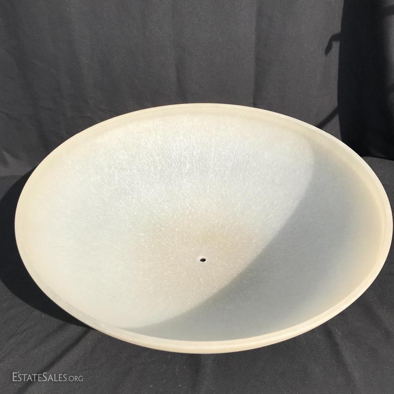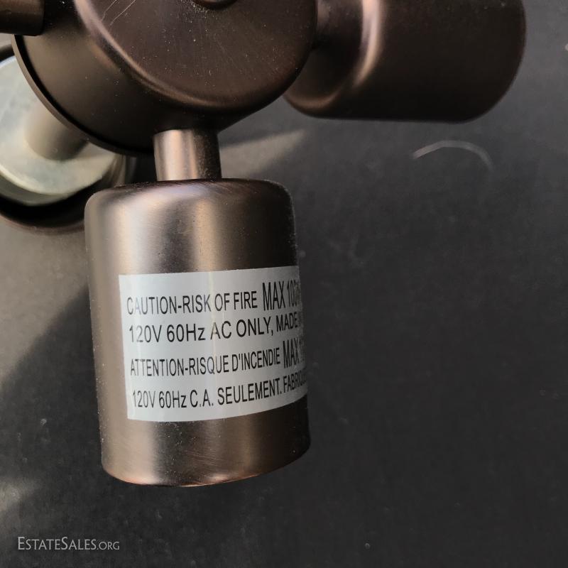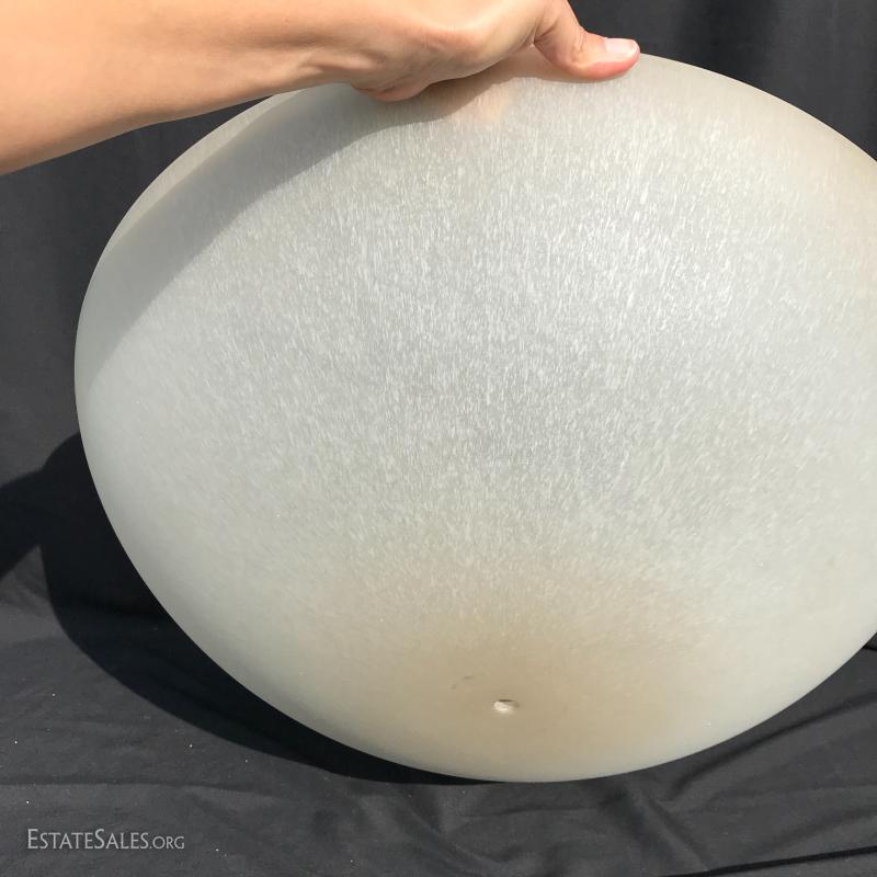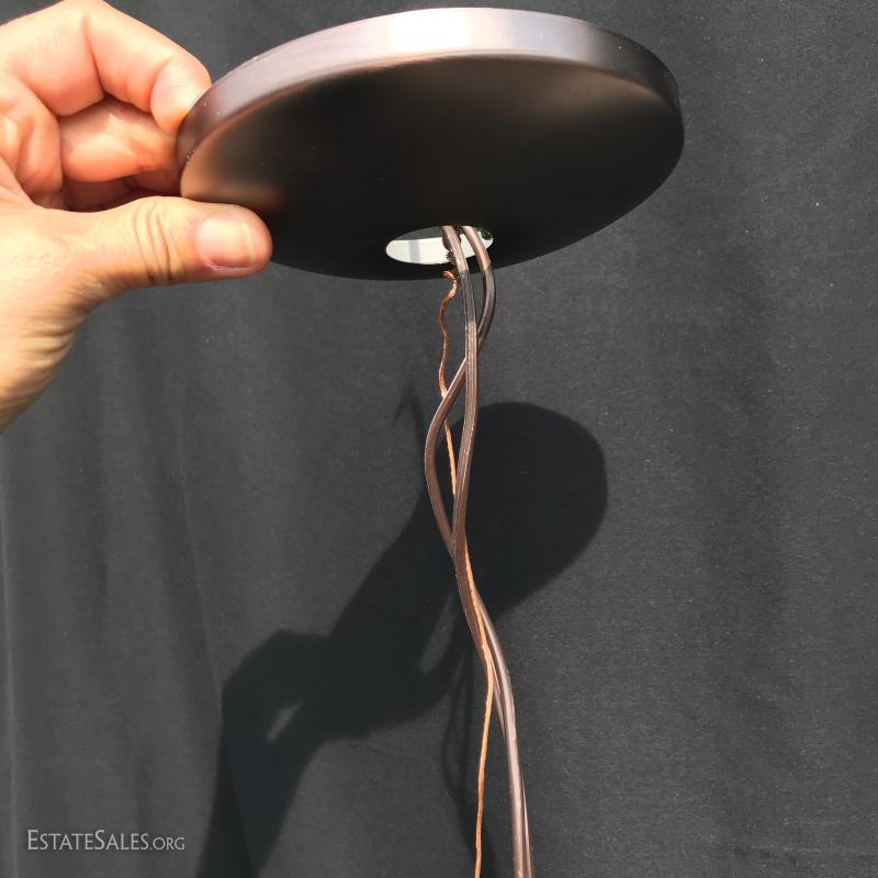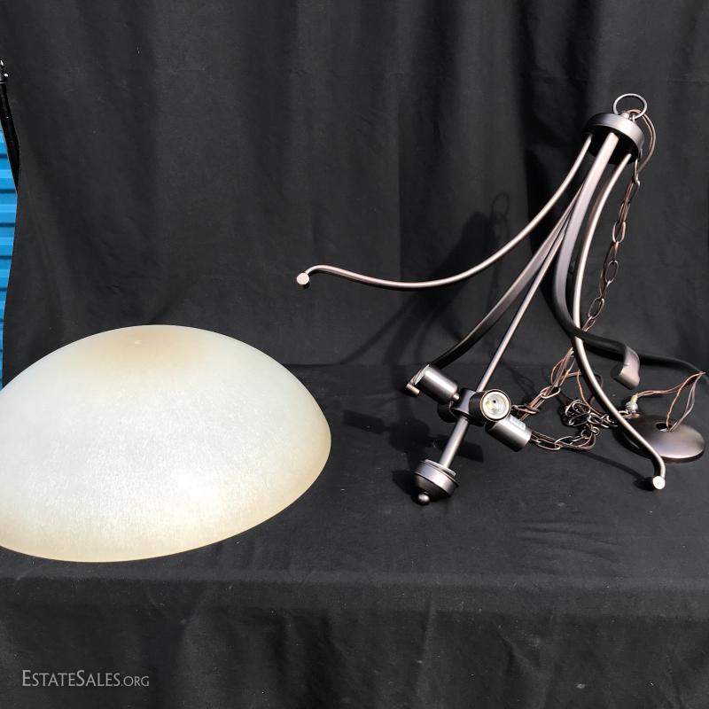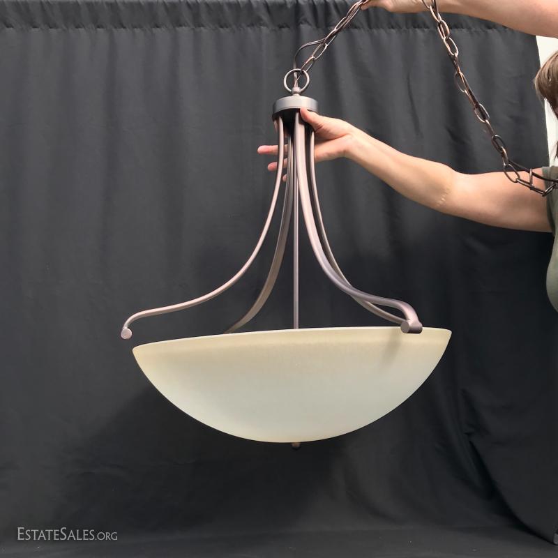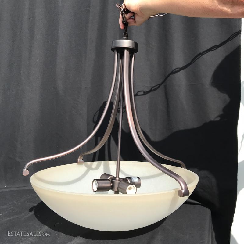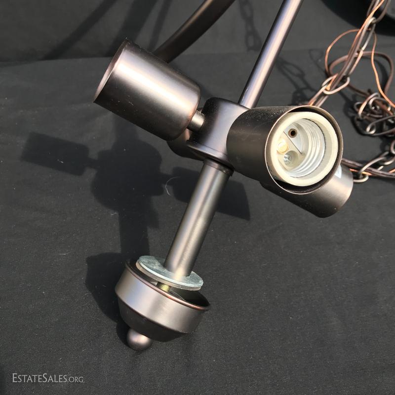 Four-bulb hanging lamp with brushed bronze finish. Large half-moon glass shade is 22” in diameter. Chain and base are 78” long. Adjustable. No shipping. Local pick up only in Asheville, NC,