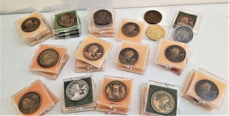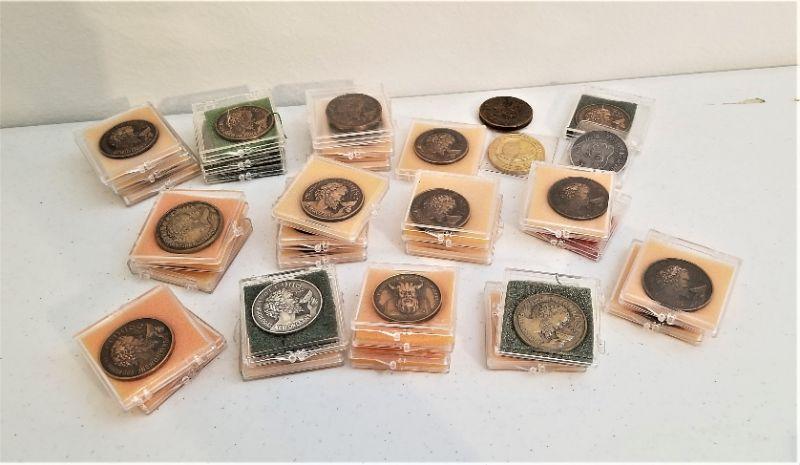 A grouping of 33 Bacchus Mardi Gras "Heavy" doubloons - most in cases. Starting from 1972 and going forward. Pewter and Bronze.