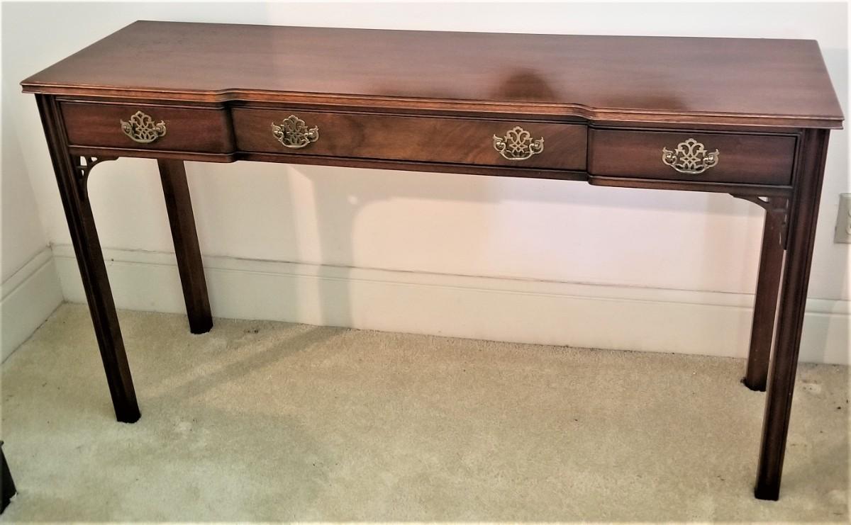 From the American Masterpiece Collection by Hickory Furniture Co, lovely traditional console or sofa table (finished all the way around), 3 drawers, brass hardware - just a touch of Asian styling. 16" deep, 54" across, 30" tall. This one is a real beauty.