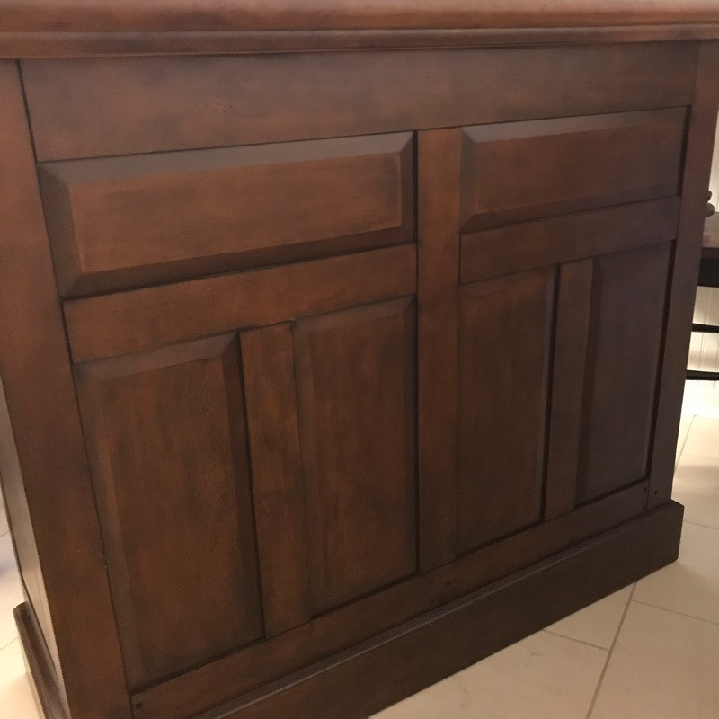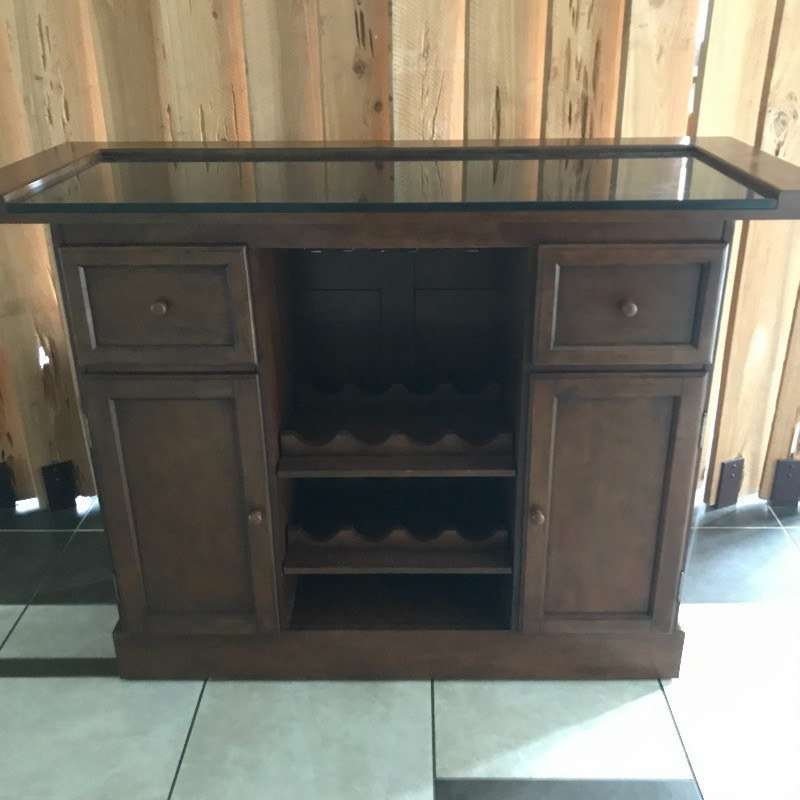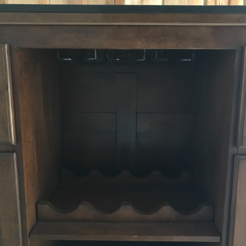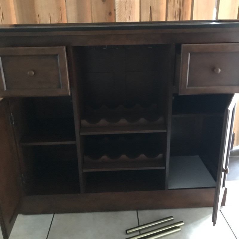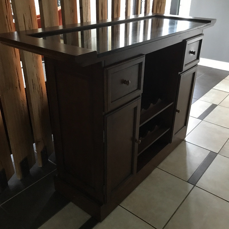 Invite your friends over for a cold beverage and show off this gorgeous solid wood bar with marble top. You could also flip it around and use it for storage or as a side table. This versatile piece is elegant and in great condition with just a few knicks on the wood. Manufacture by Powell Limited. It comes with some brass pieces that can make a foot ledge on bar but one piece is broken so it would need to be fixed to use. Shelves can be adjusted. Also has built in wine glass holders that can be removed . It is heavy so please bring help to move. 60” x 24” x 42” tall.