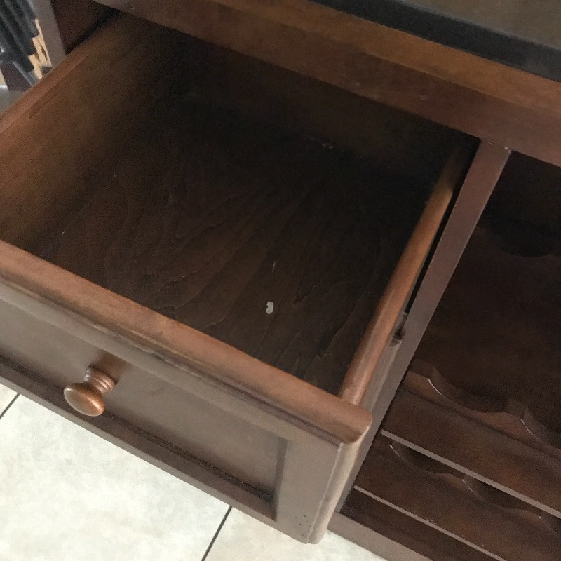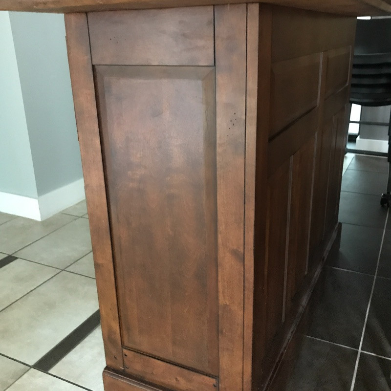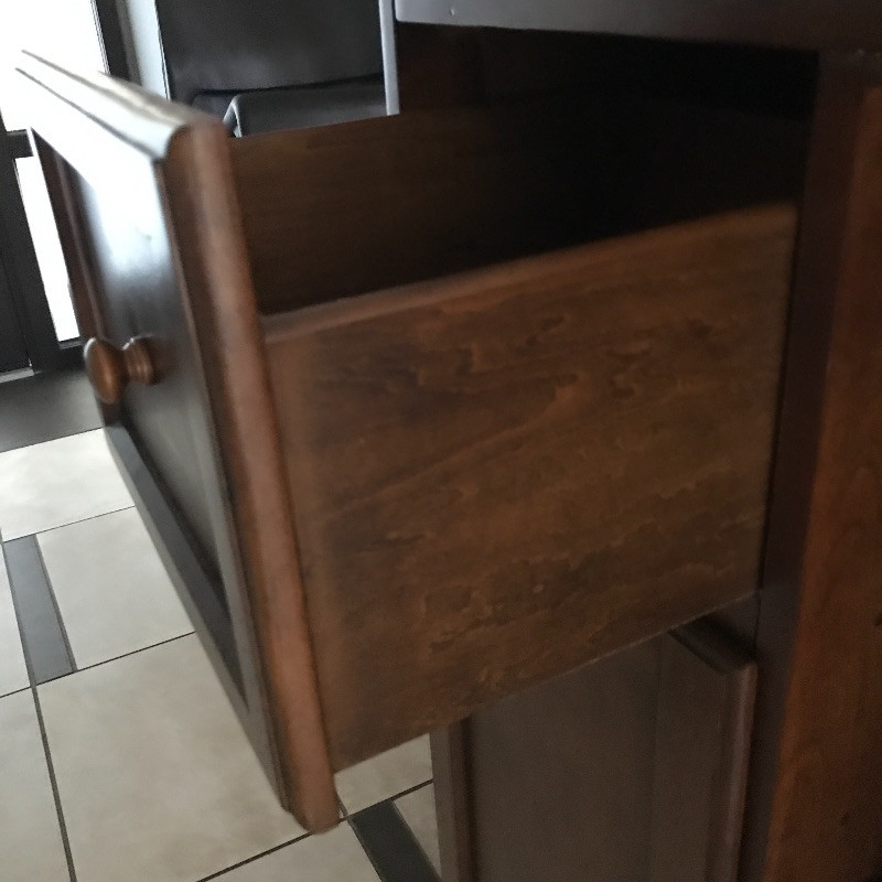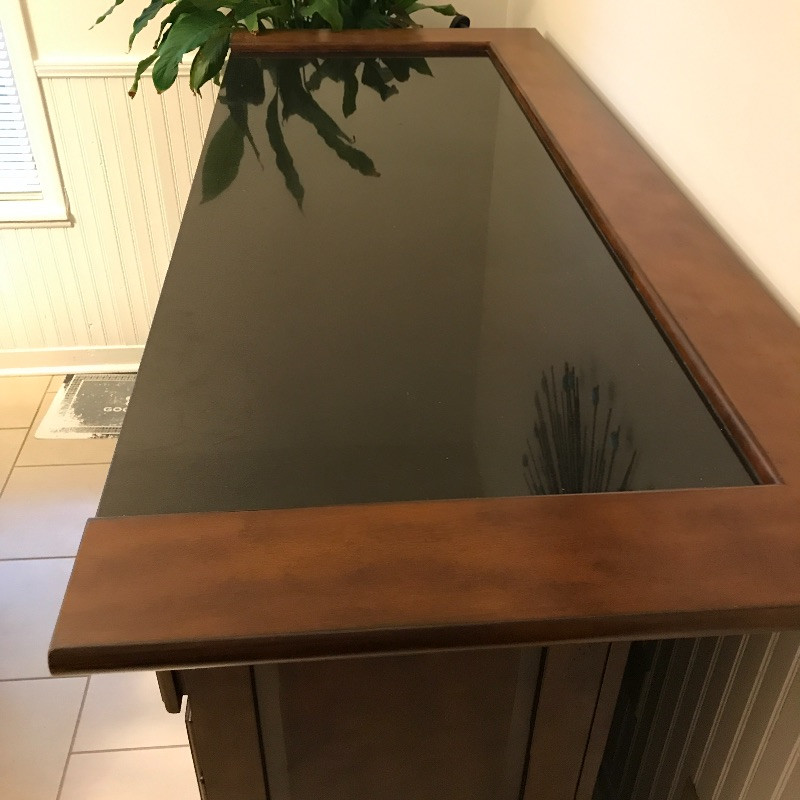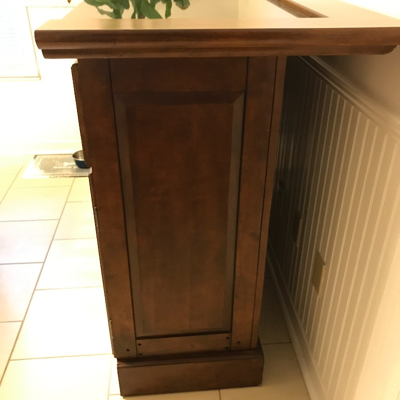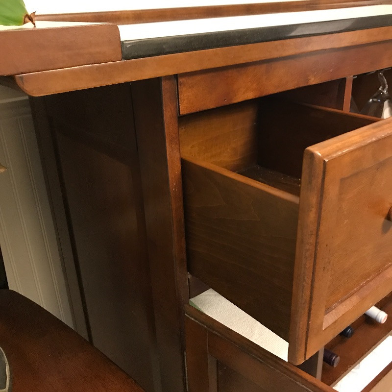 Invite your friends over for a cold beverage and show off this gorgeous solid wood bar with marble top. You could also flip it around and use it for storage or as a side table. This versatile piece is elegant and in great condition with just a few knicks on the wood. Manufacture by Powell Limited. It comes with some brass pieces that can make a foot ledge on bar but one piece is broken so it would need to be fixed to use. Shelves can be adjusted. Also has built in wine glass holders that can be removed . It is heavy so please bring help to move. 60” x 24” x 42” tall.