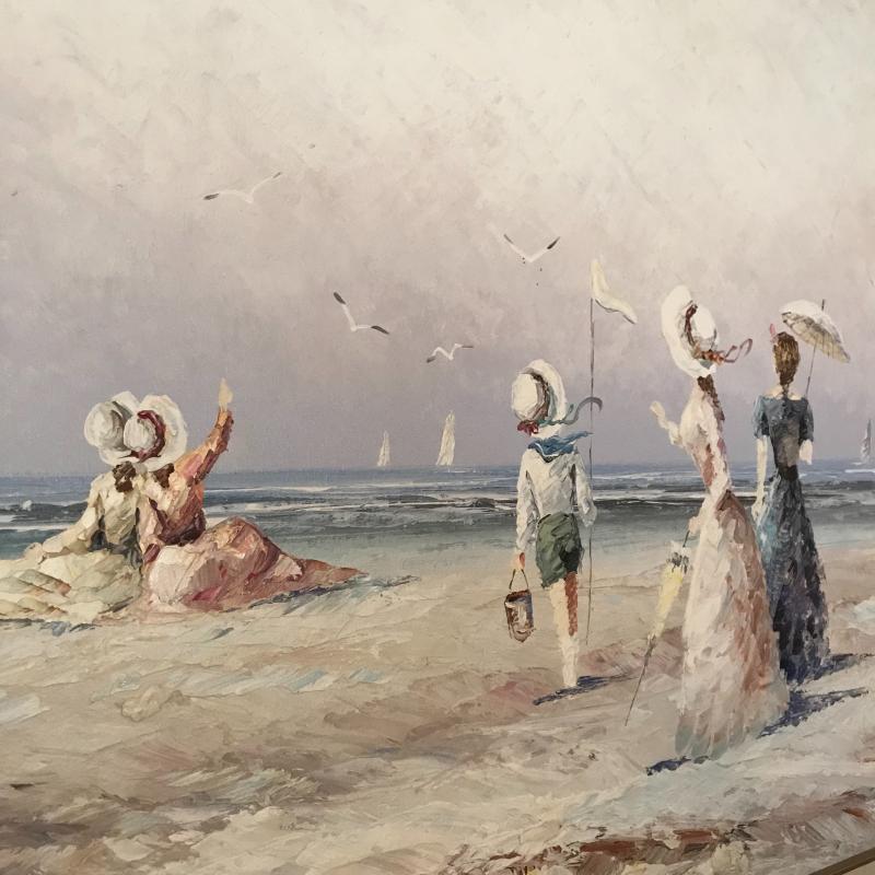 Gorgeous old-fashioned depiction of a day at the beach. Signature appears to be Marie Charlot, also appears to be an oil painting on canvas. The art is approx. 40.75” x 29” in frame and in great condition. Shipping available, please call UPS for a quote prior to bidding.
