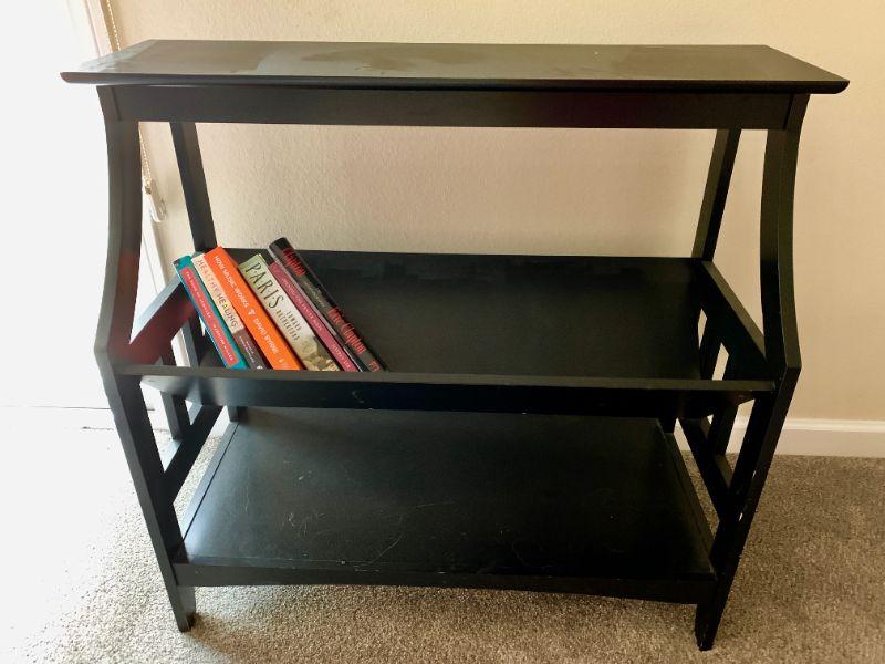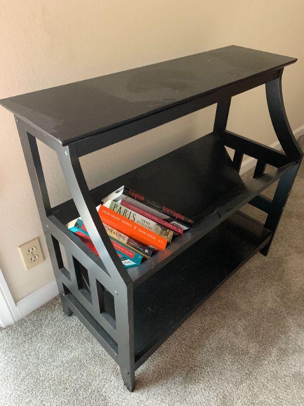 Black finish, wooden book shelf w/bin shelf. 34"W x 15"D x 31.5"H