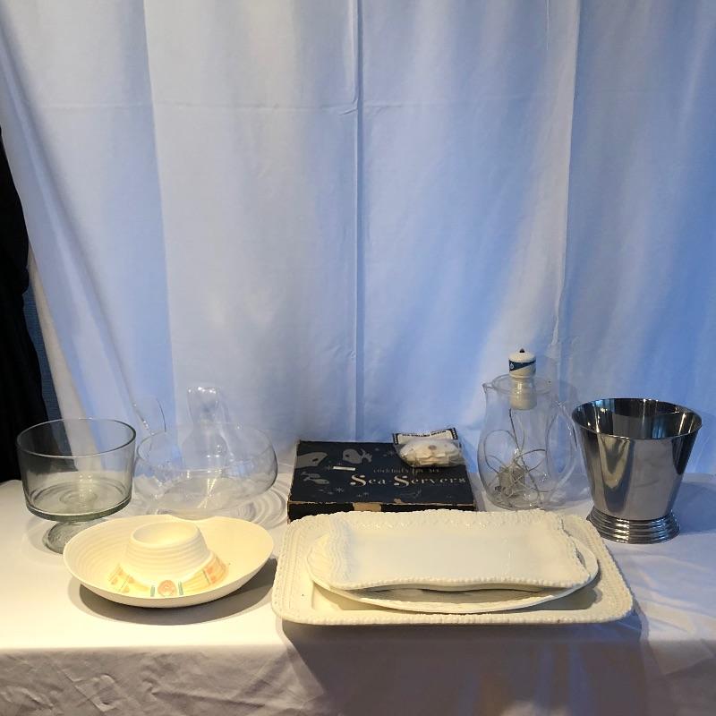 If you’re looking to host a lot of guests this holiday season, this lot is the one for you! With items such as a sombrero-shaped platter for dipping chips, sea-shell shaped cocktail servers, and multiple glass punch/serving bowls, this lot really is one-of-a-kind! It also comes with three white ceramic serving platters, the largest measuring 21.5” wide x 17” deep, as well as two drink dispensers, one for hot beverages and the other is glass. Local pickup only.