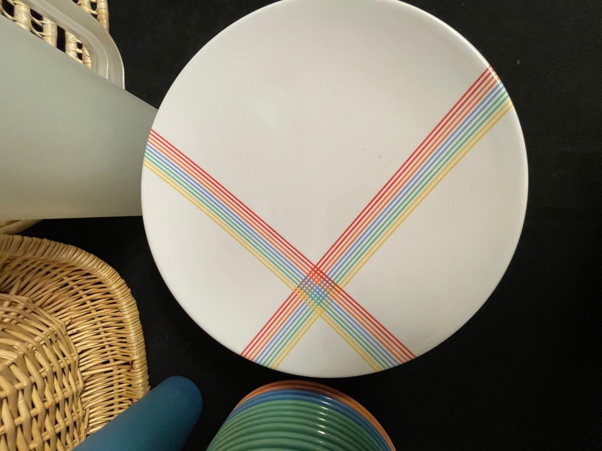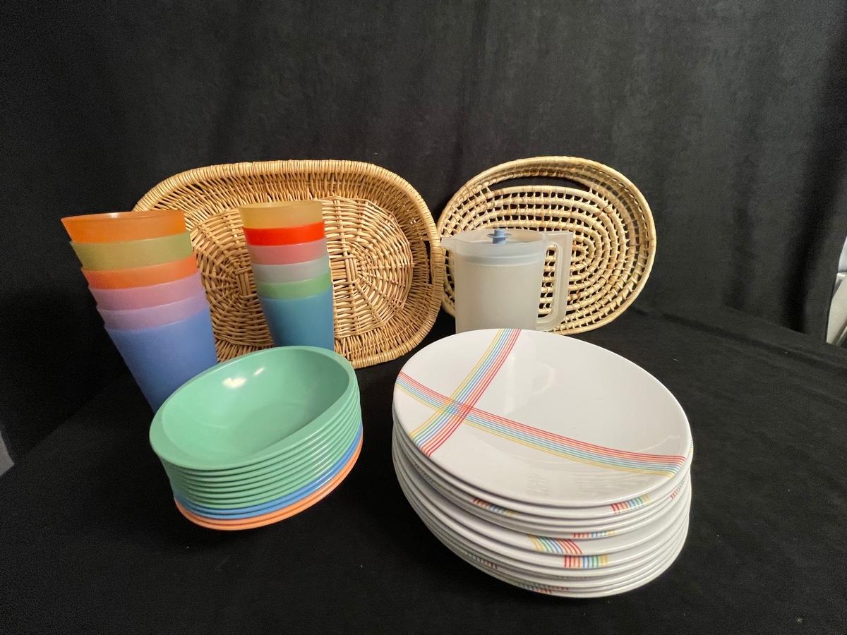 Set of 12 plastic bowls and rainbow-colored plastic plates, plastic tumblers and two wicker serving trays.