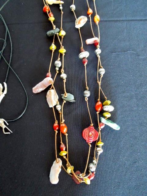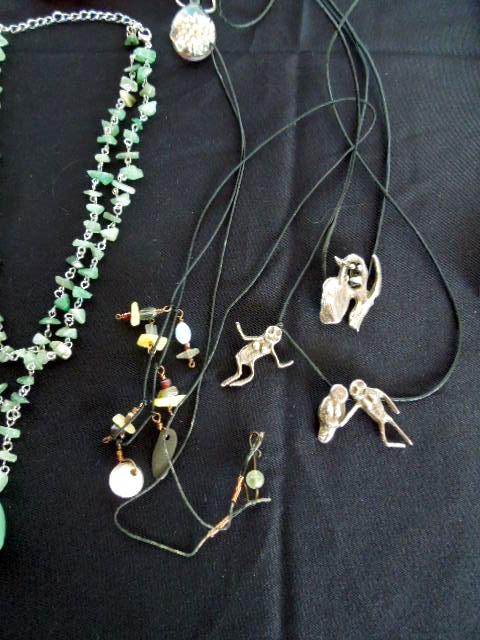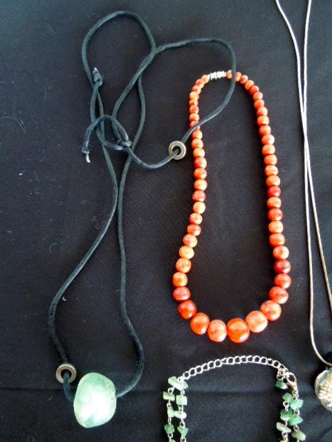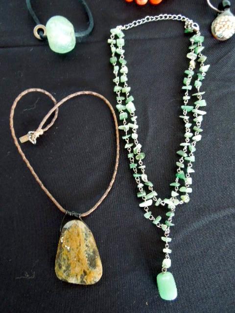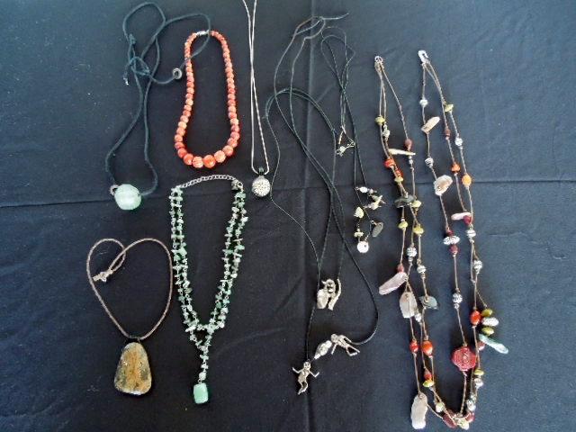 These pieces are all made of polished semi-precious stones or glass. The large aqua colored bauble on black string is beach glass. None of the metal appears to be silver. 8 necklaces total.