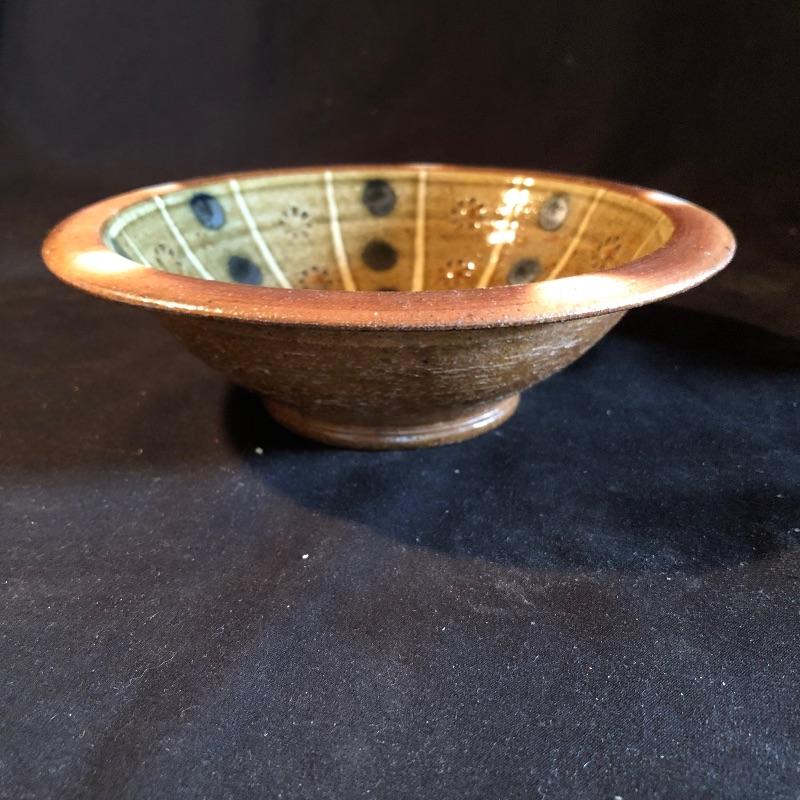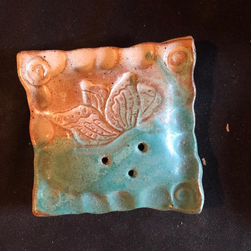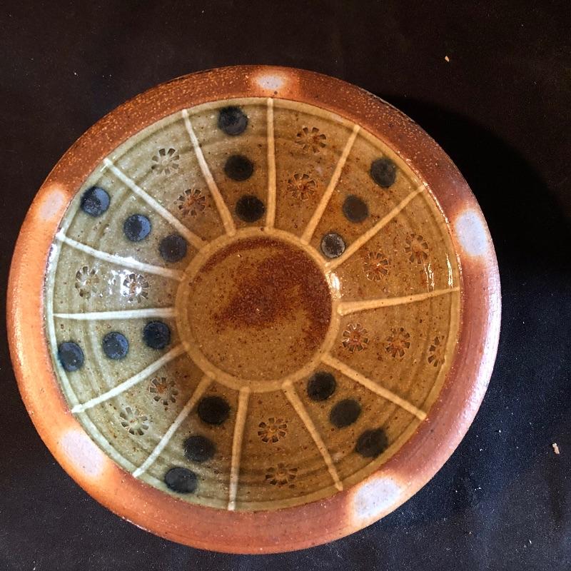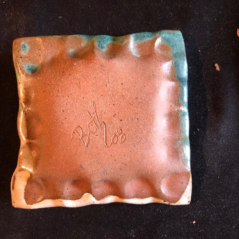 This lot includes 7 handmade pottery items, with two vases, a small bowl lined with flower designs on the inside rims, a small candle holder, and two small circular dishes, and a small ravioli-shaped item that is perfect for decoration. Shipping available.