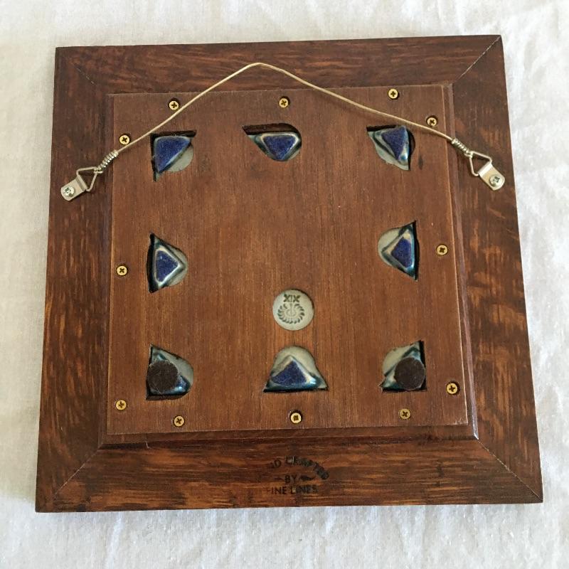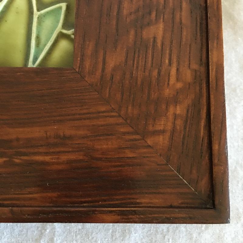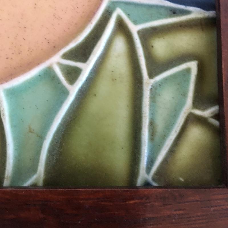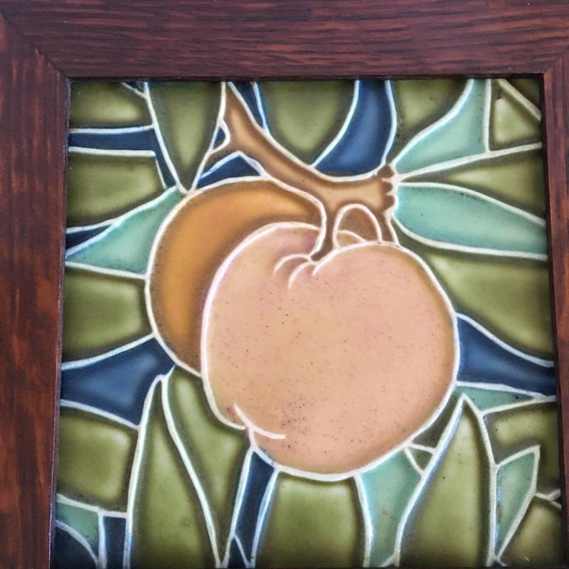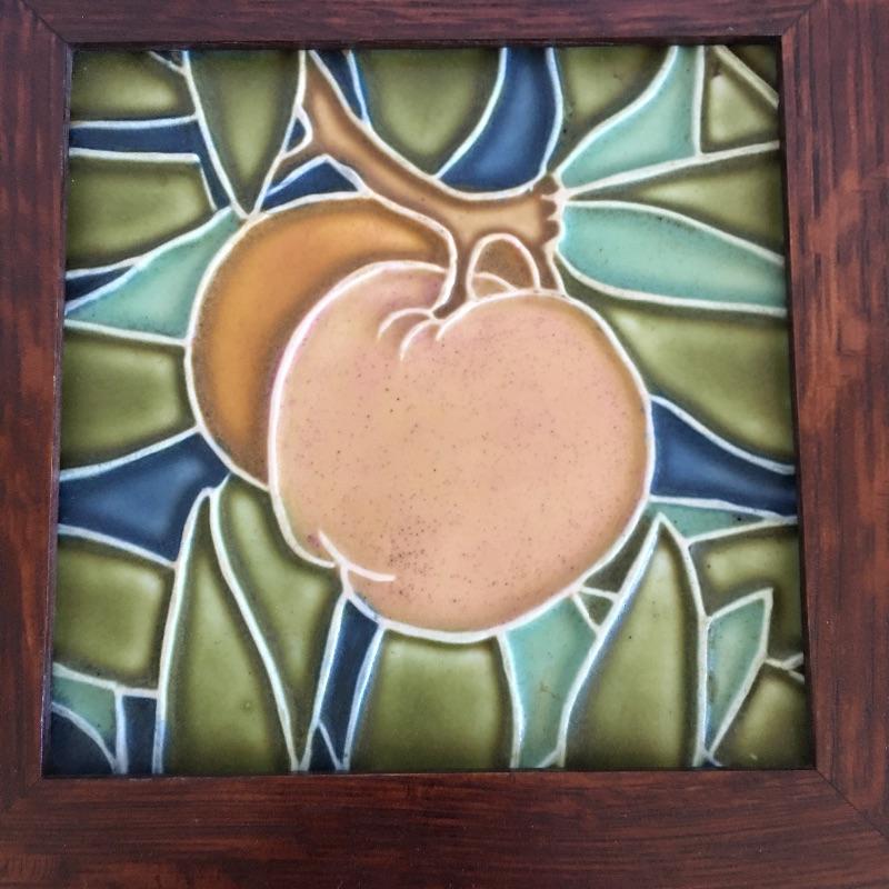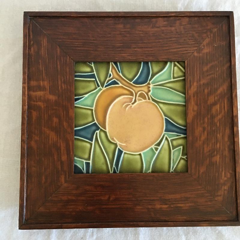 Elegantly styled Rookwood footed apple trivet from 1919 in browns, greens and blue that is marked on the back with the Rookwood logo, XIX and is beautifully framed by Fine Lines. Frame measures 10.25” x 10.25”.