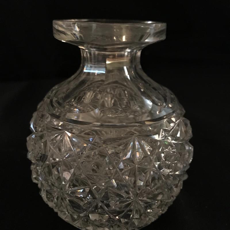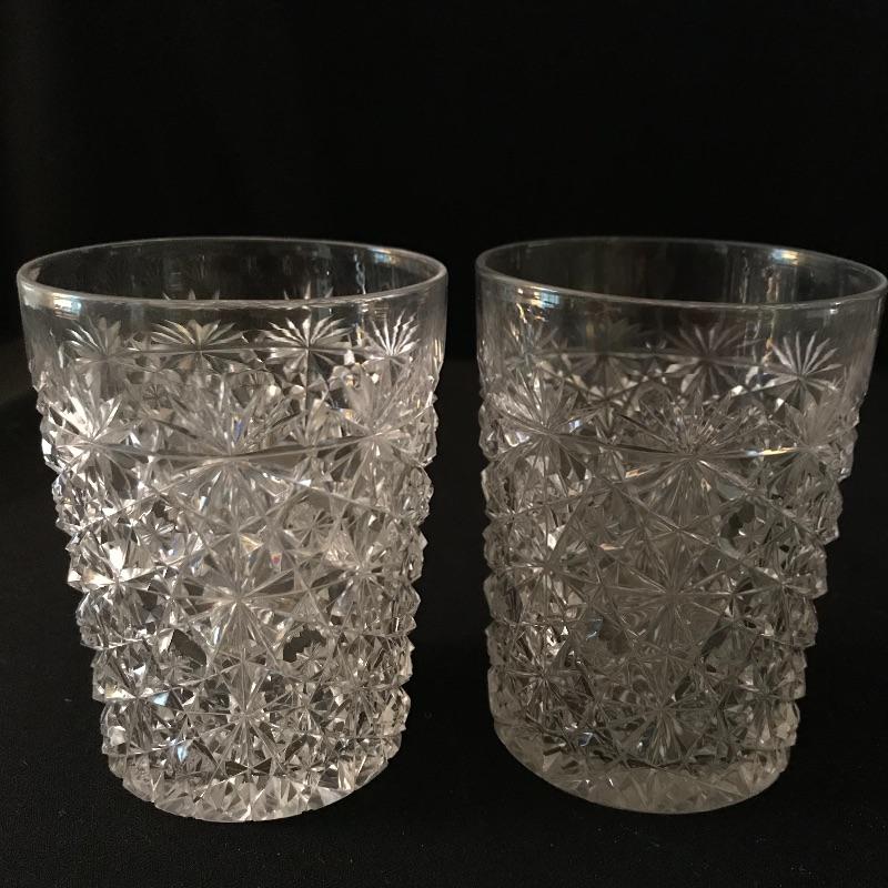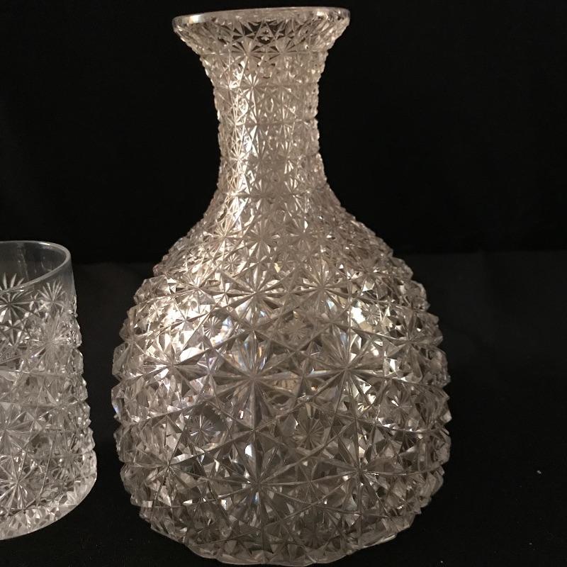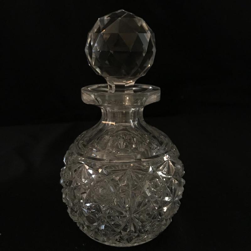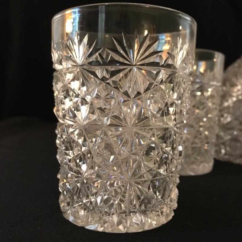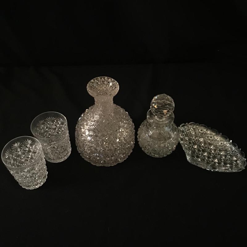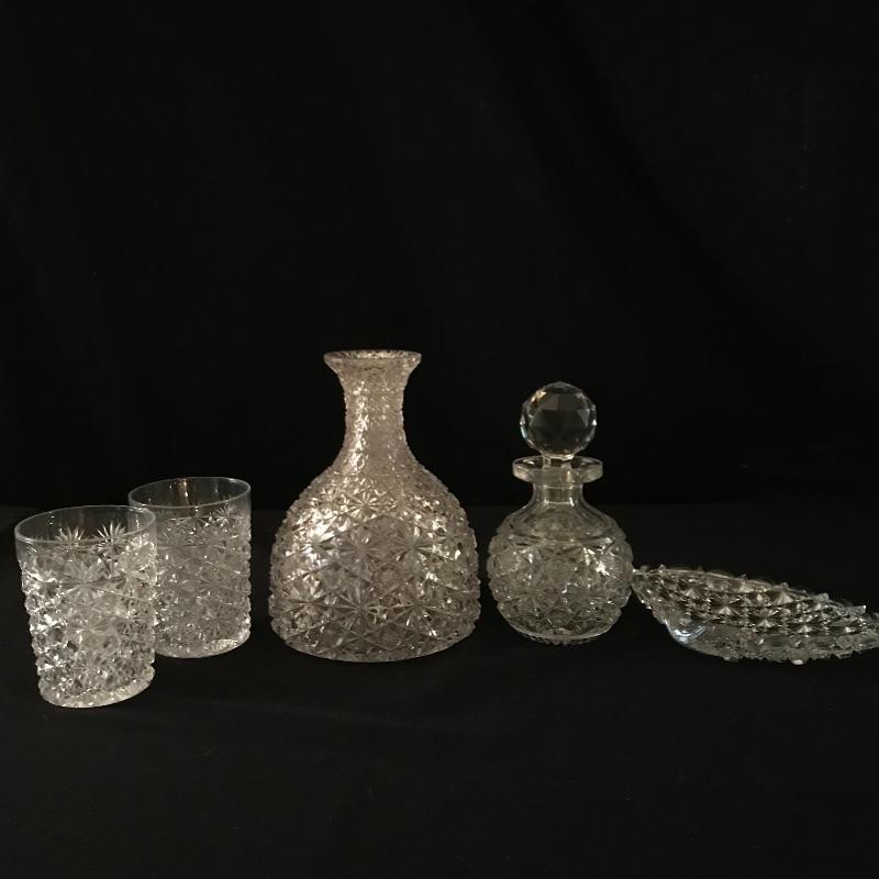 Fantastic collection of cut glass in Russian patterns. Invoices found in estate suggest artist J. Hoare, but stamp or signature was not yet located. Two tumblers, a carafe measuring approximately 5.25”d x 7”, one cologne with top and an exquisite clam shell. Shipping available.