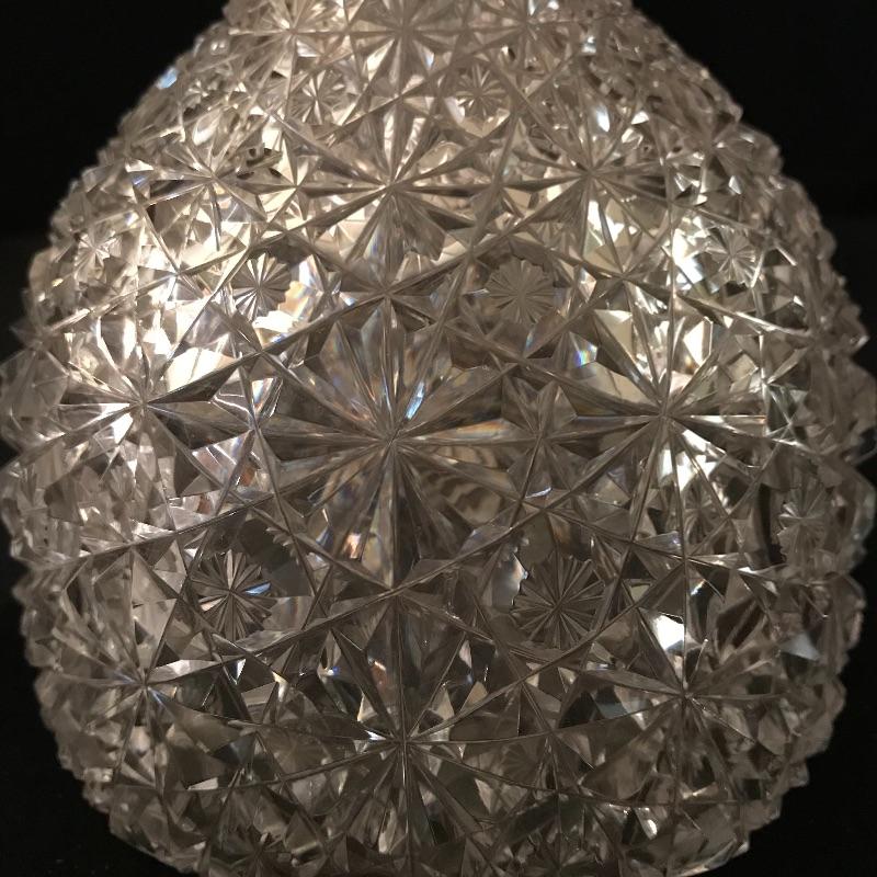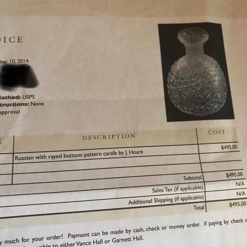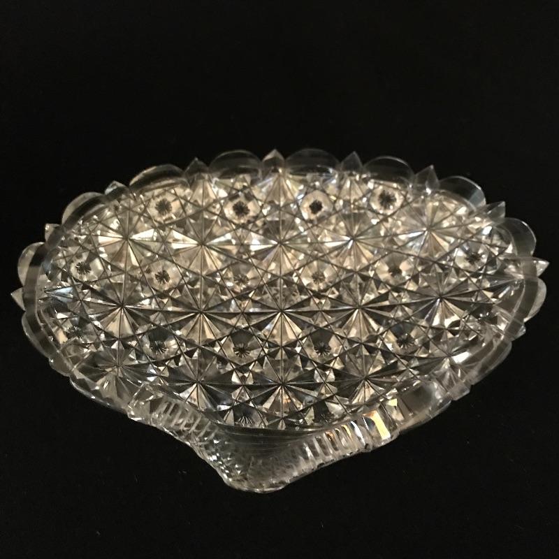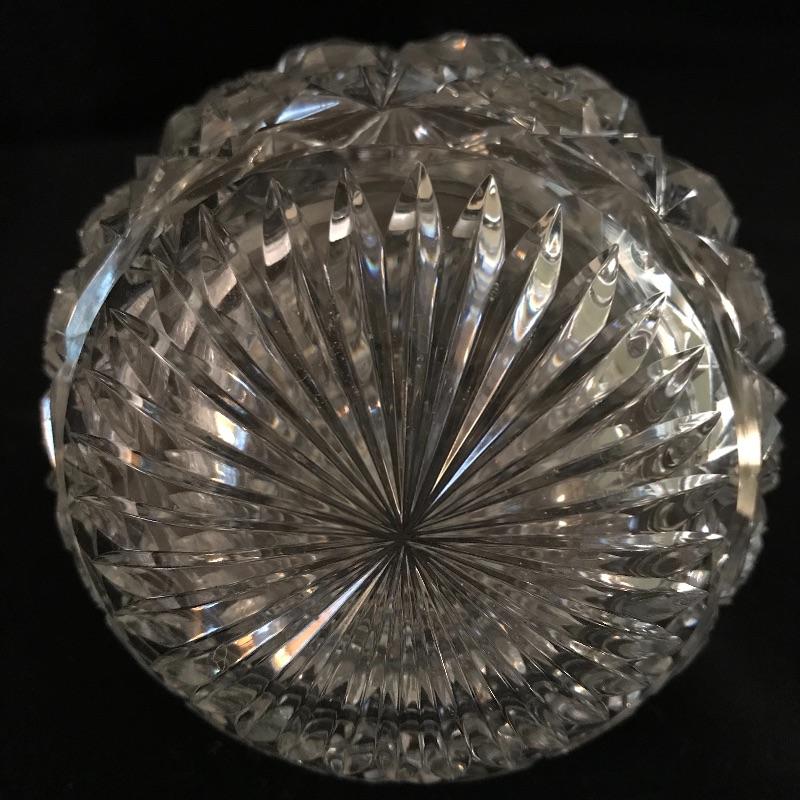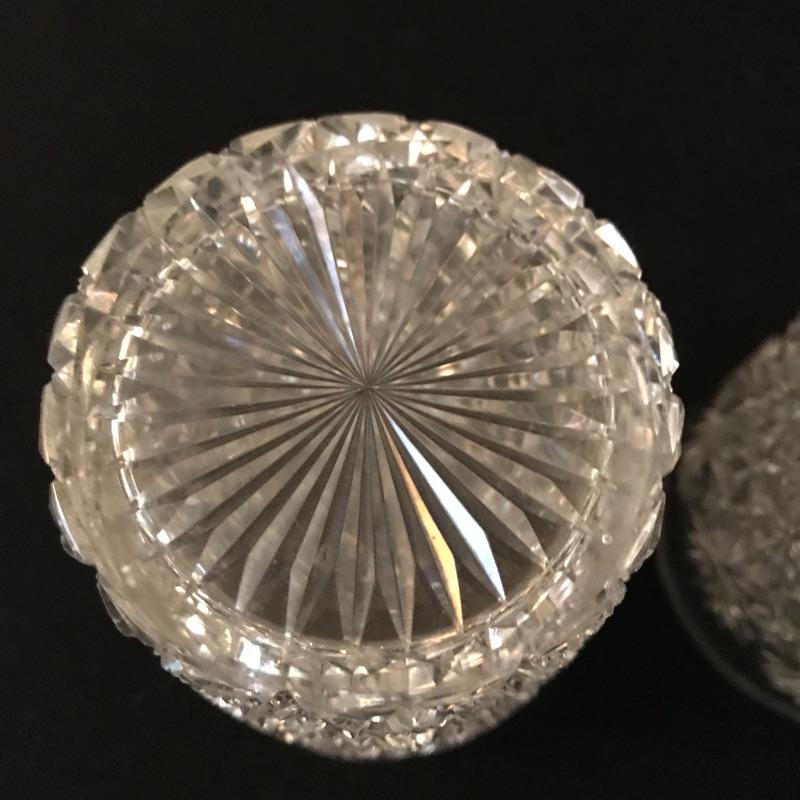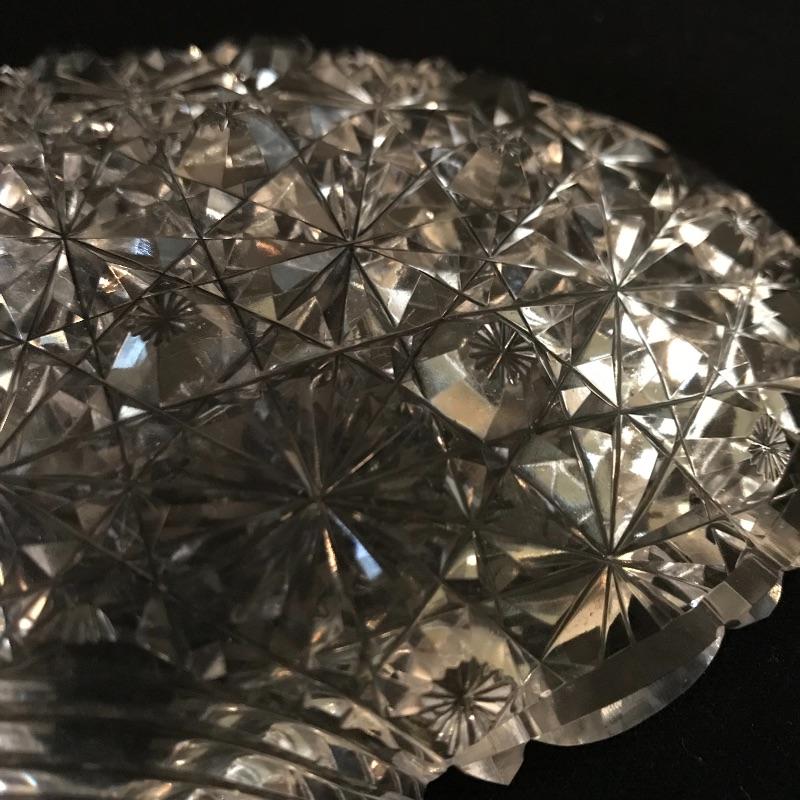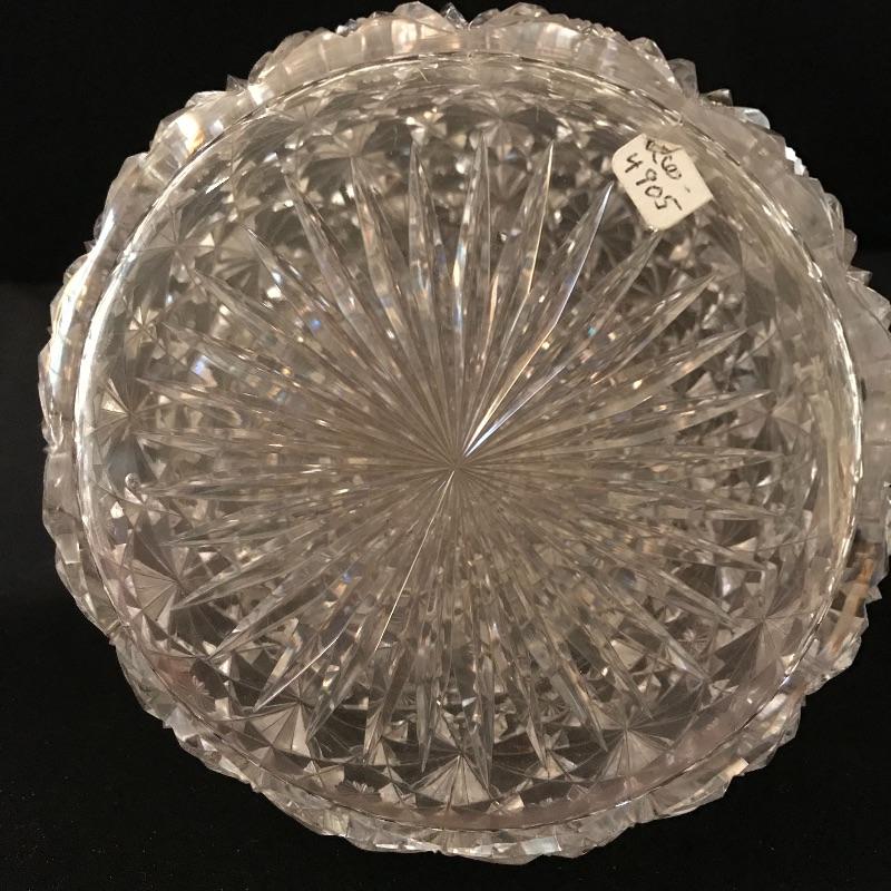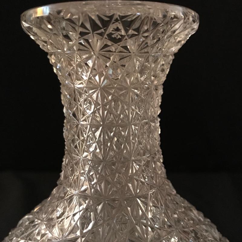 Fantastic collection of cut glass in Russian patterns. Invoices found in estate suggest artist J. Hoare, but stamp or signature was not yet located. Two tumblers, a carafe measuring approximately 5.25”d x 7”, one cologne with top and an exquisite clam shell. Shipping available.