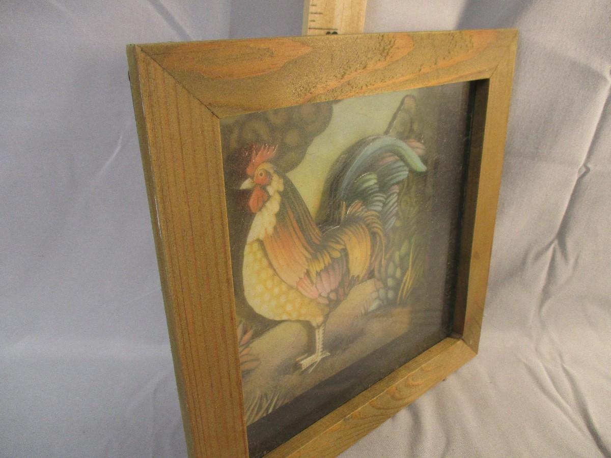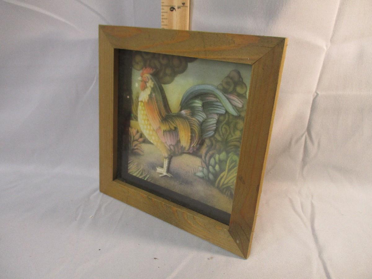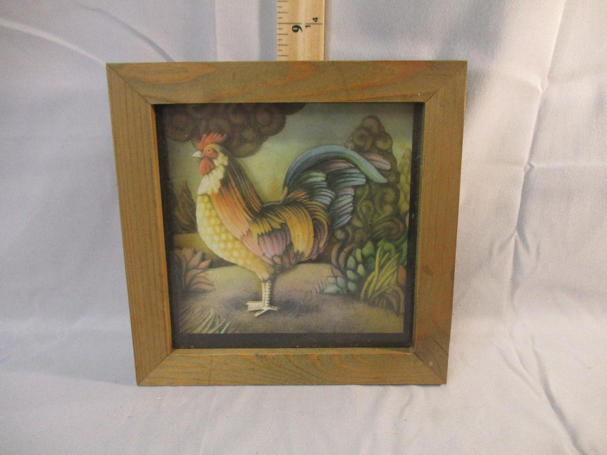 This picture is in excellent condition and measures about 8" square. The rooster picture inside is made of multipe pieces of thin cardboard/heavy cardstock to give it a multi-dimensional look.