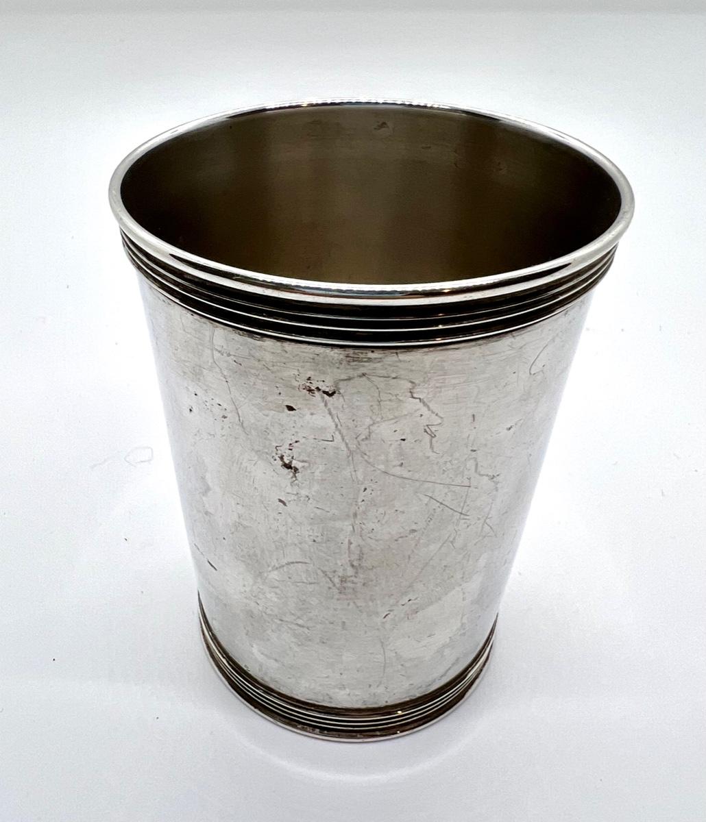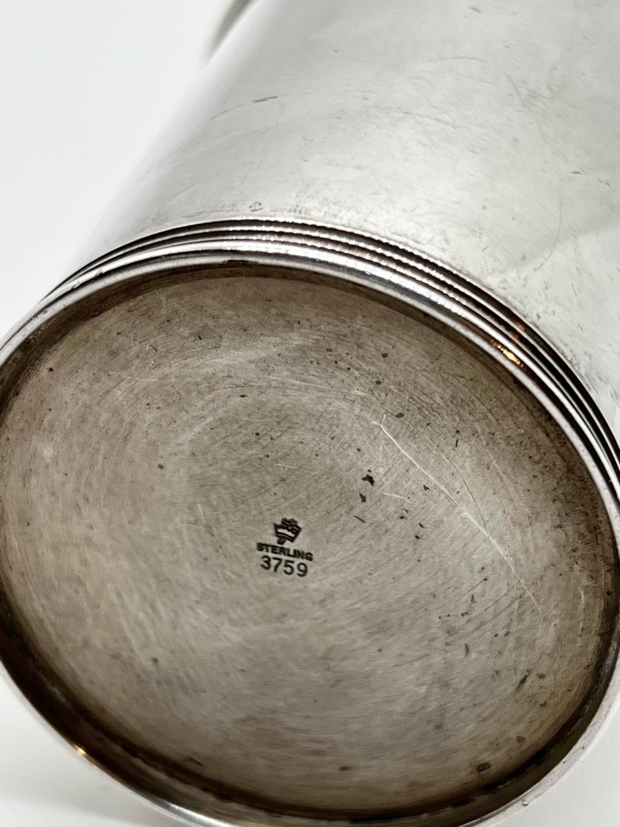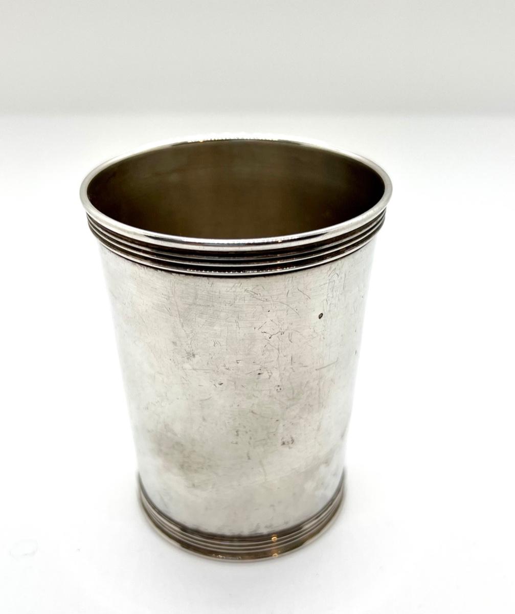 LOT 18 - Sterling Silver Cup, weighing 122 Grams. It is not weighted. Cup measure just over 3 3/4 inches tall and is 2 3/4 inches round in diameter at the top. This is part of the Nancy Ince Estate. Nancy is granddaughter of Thomas H Ince, a Hollywood film actor, producer and director from the 1920’s and Elinor Ince, an actress. She also was wife to Dick Probert, founder of Avalon Air of Catalina Island. This item can be viewed at our Green + Cate Showroom in Sebastopol on December 2nd -December 5th between the hours of 9am-5pm.