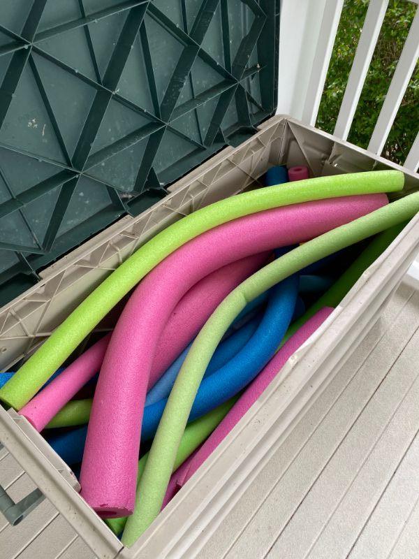 Suncast Green and Beige Outdoor Storage Chest with pool noodles