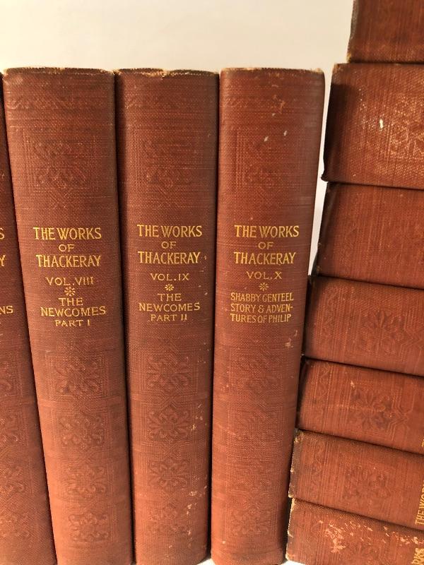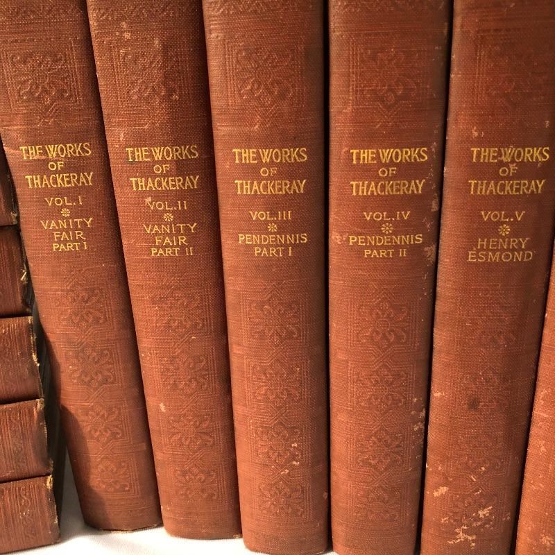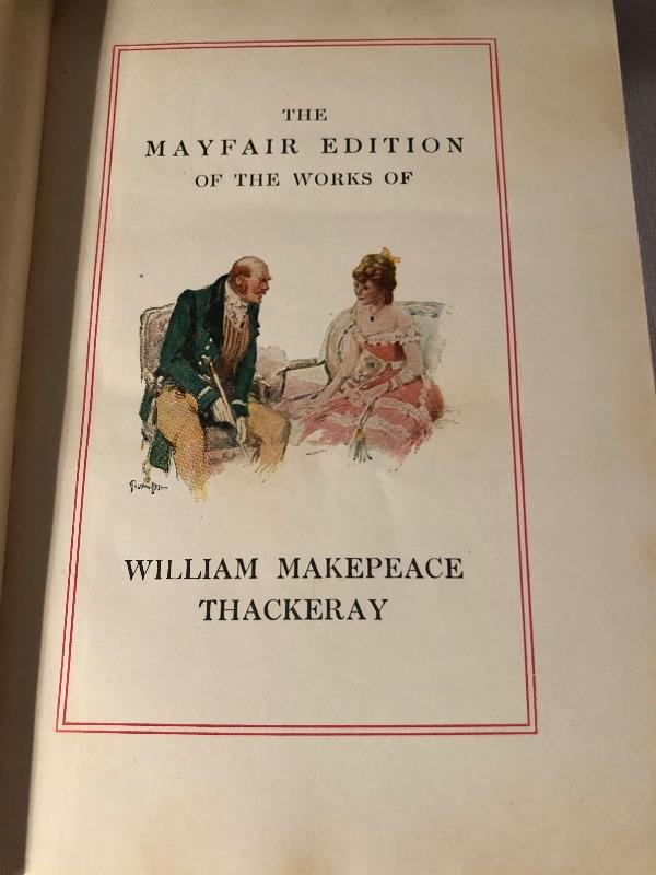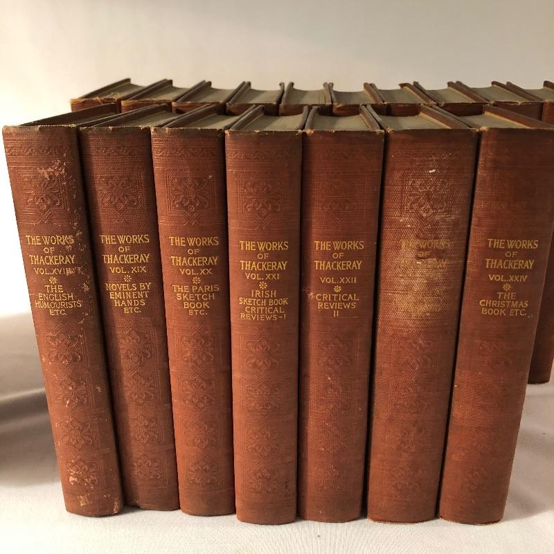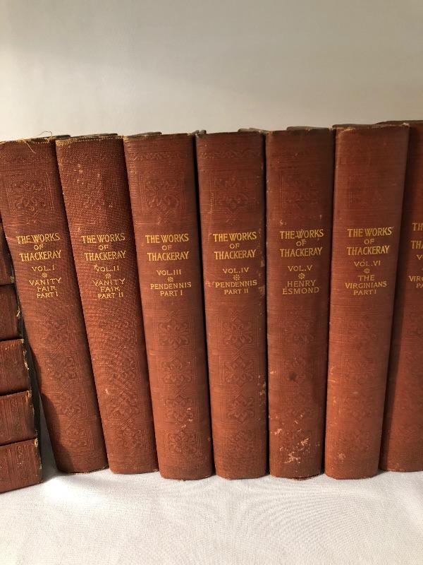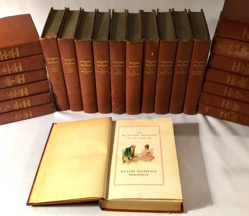 Twenty four volumes of The Works of Thackeray, The Mayfair Edition. These handsome and partially illustrated books seem to be in great condition with minor shelf-life wear. This witty satirist was considered second only to Dickens when we was alive.