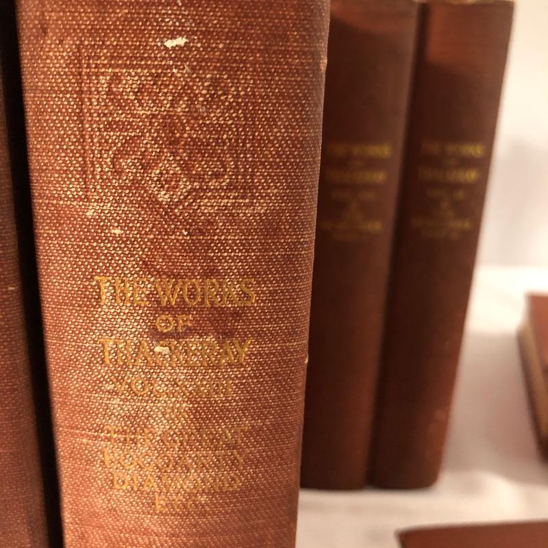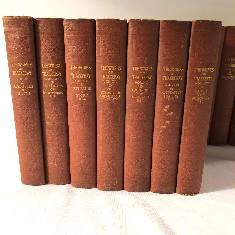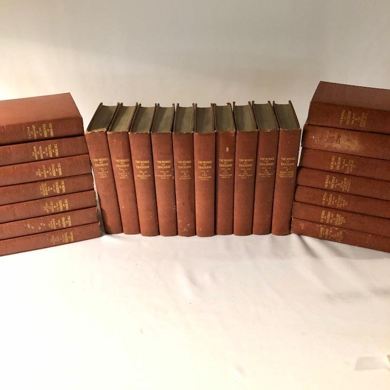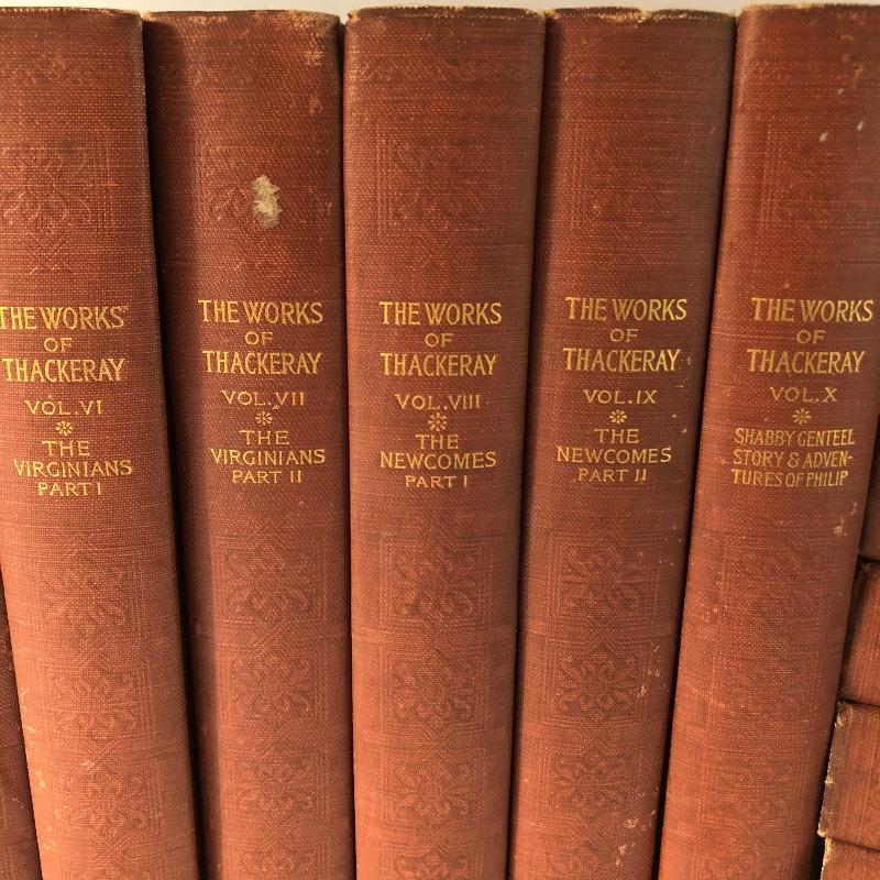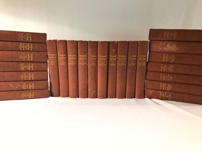 Twenty four volumes of The Works of Thackeray, The Mayfair Edition. These handsome and partially illustrated books seem to be in great condition with minor shelf-life wear. This witty satirist was considered second only to Dickens when we was alive.