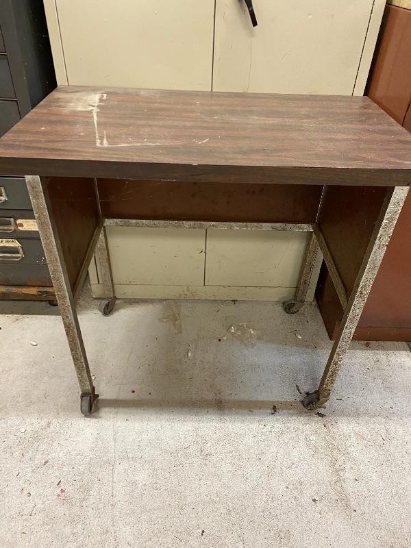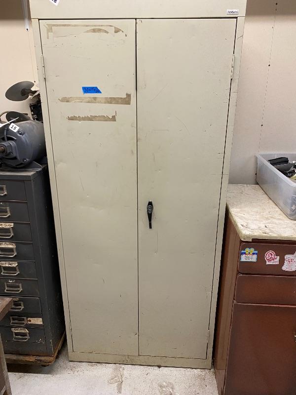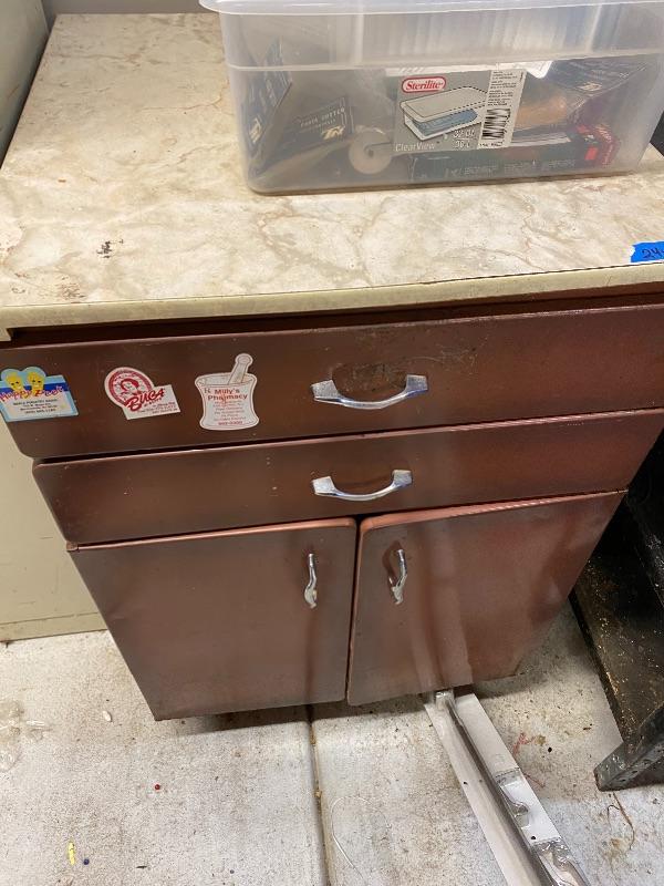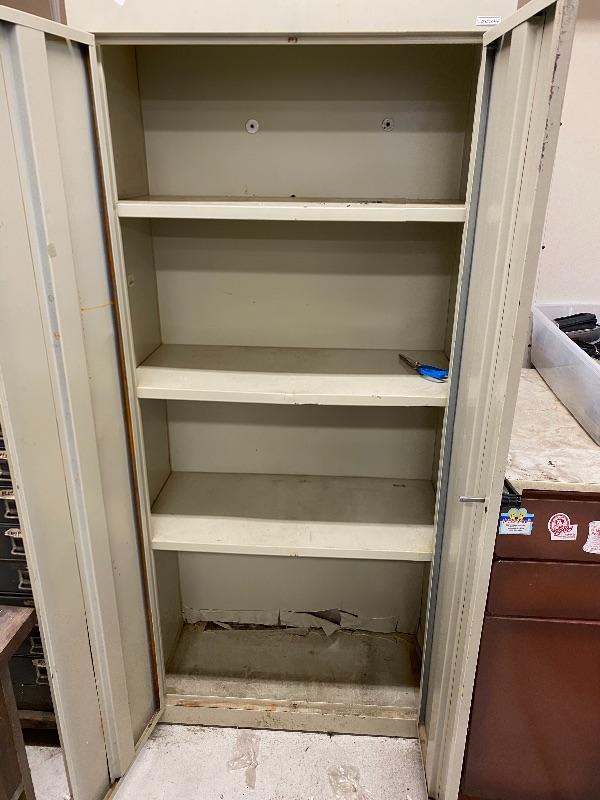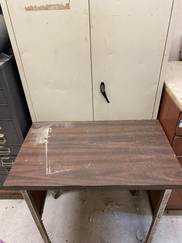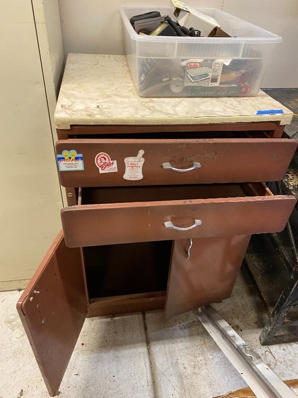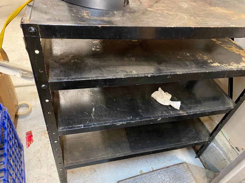 Tall white tool cabinet 30x15x66, brown cabinet 24x24.5x36 with 2 drawers and countertop, rectangular work table on wheels, black metal shelf.