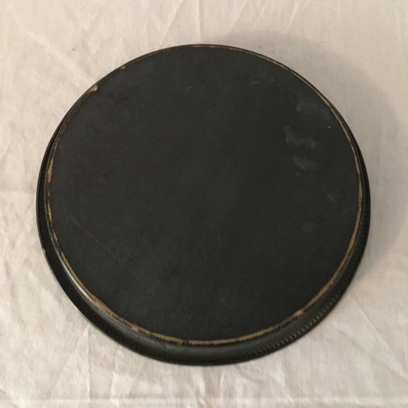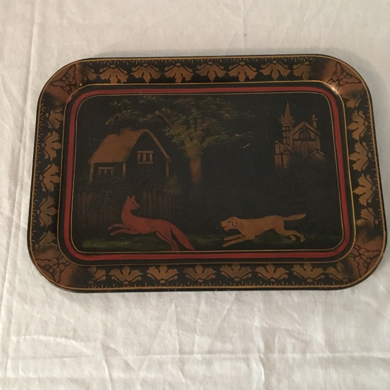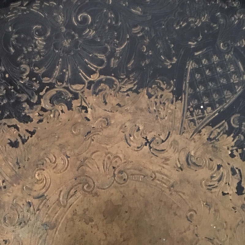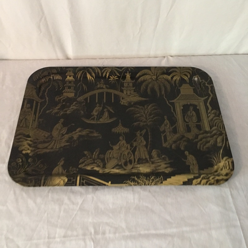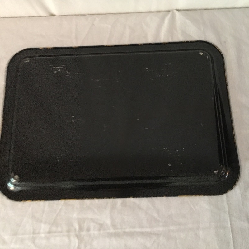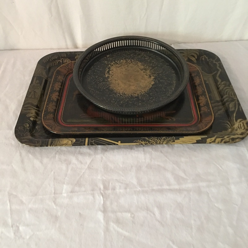Trio of trays includes two rectangular black trays with Asian inspired designs and one round black painted tray that looks like brass underneath, see pictures.