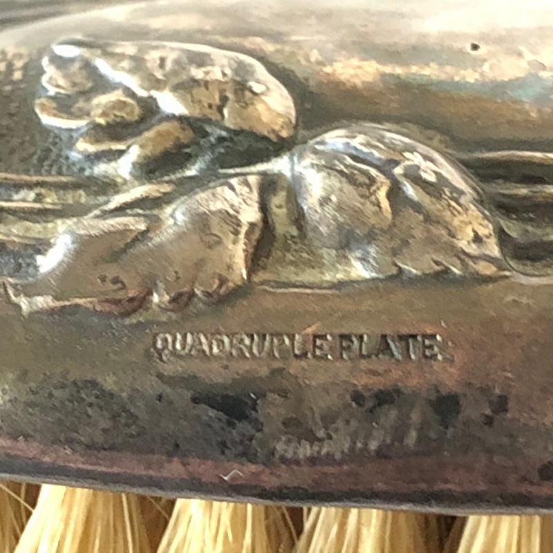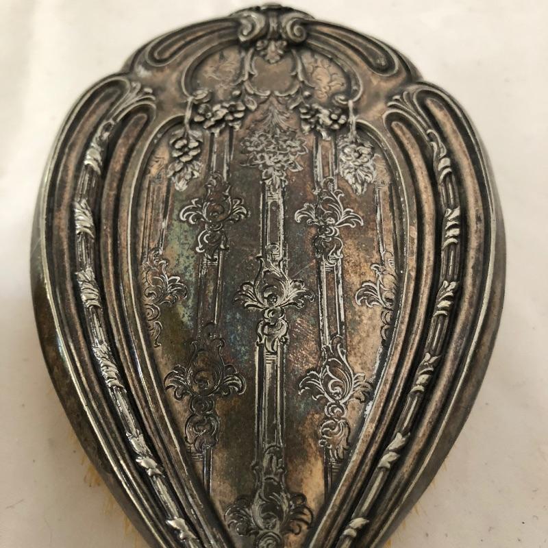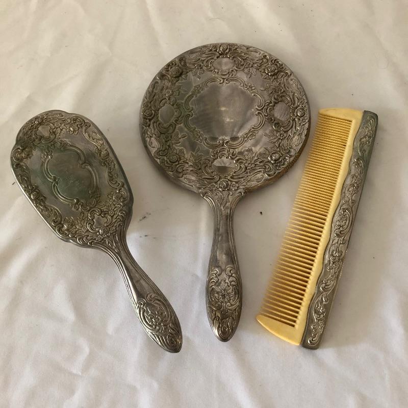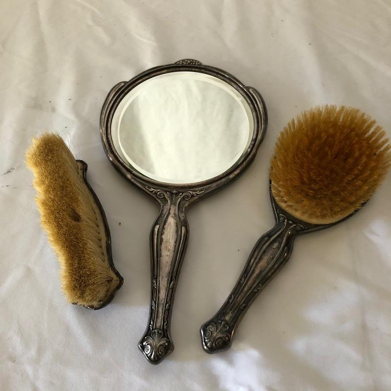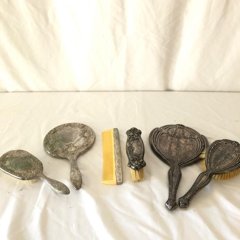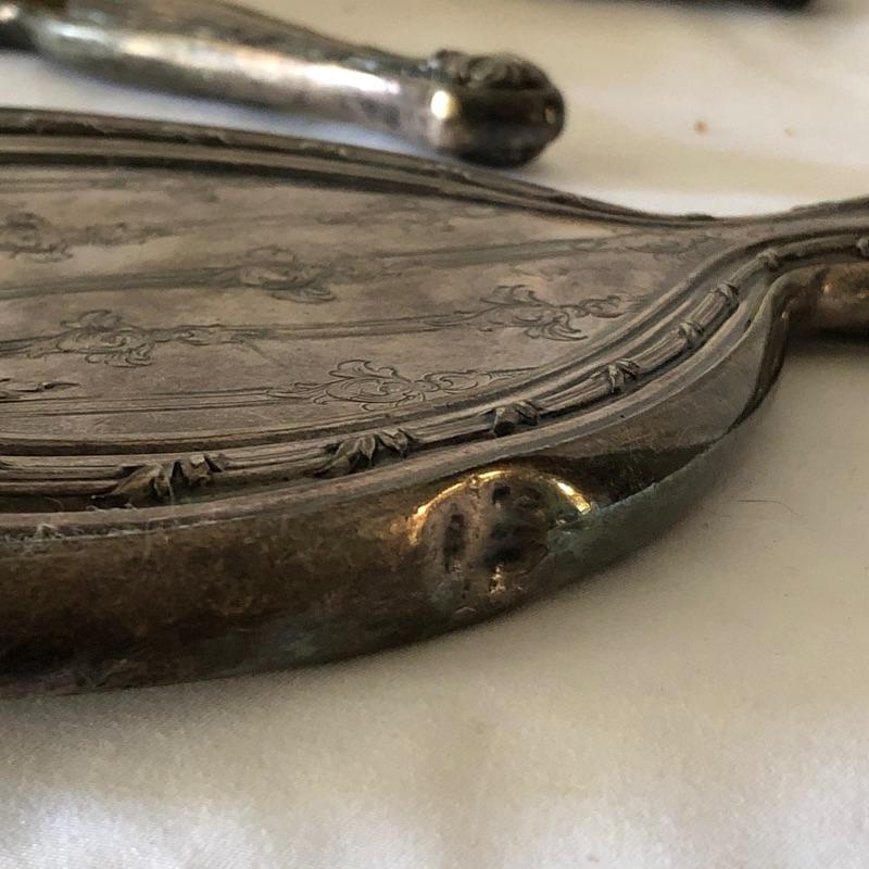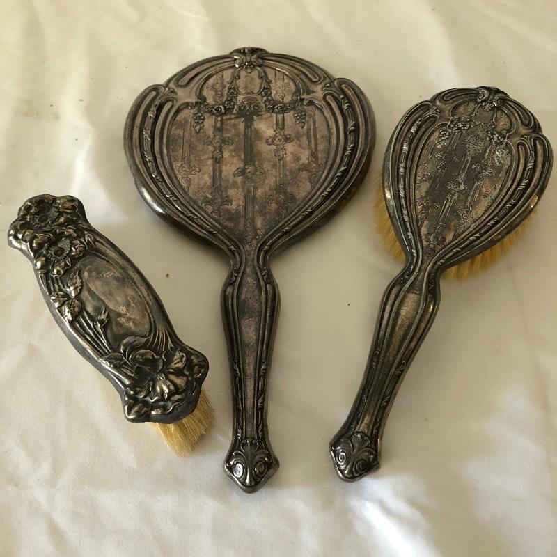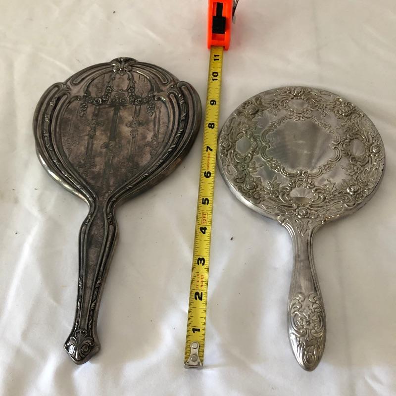 Both of these sets are as beautiful as each other. The brighter colored set is much heavier, but no markings were found. The brush in particular has some green marks that appear to be from oxidation and may not come clean; this set includes a mirror, comb and brush. The mirror has a very small chip, see image. The other set is quadruple silver-plate and includes a mirror and two brushes.