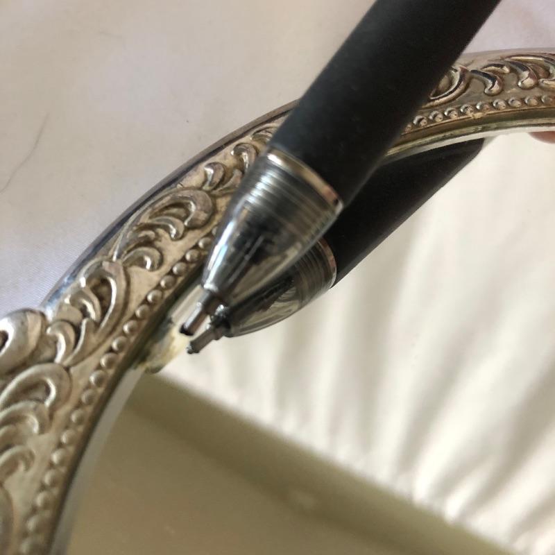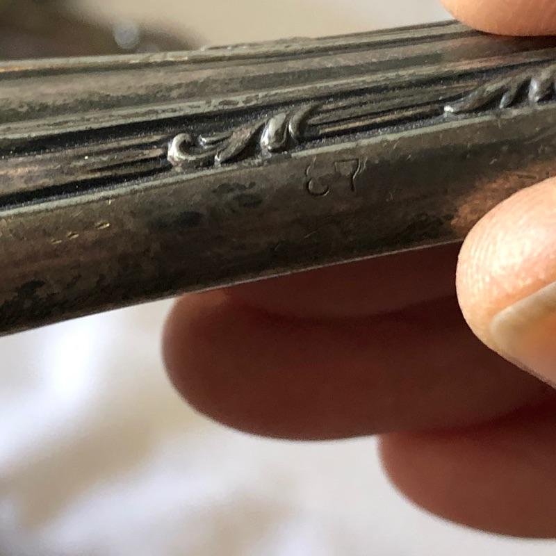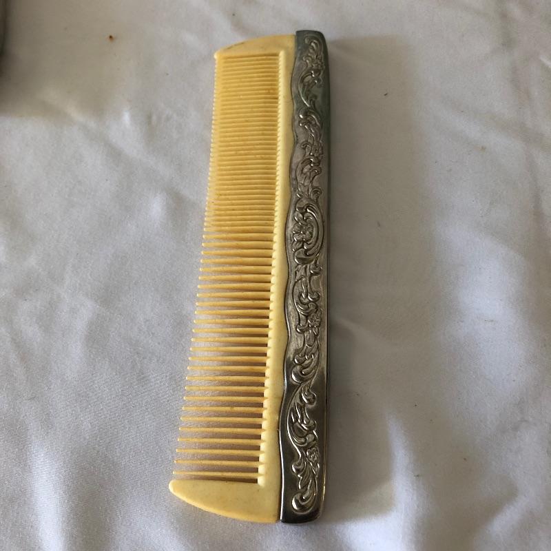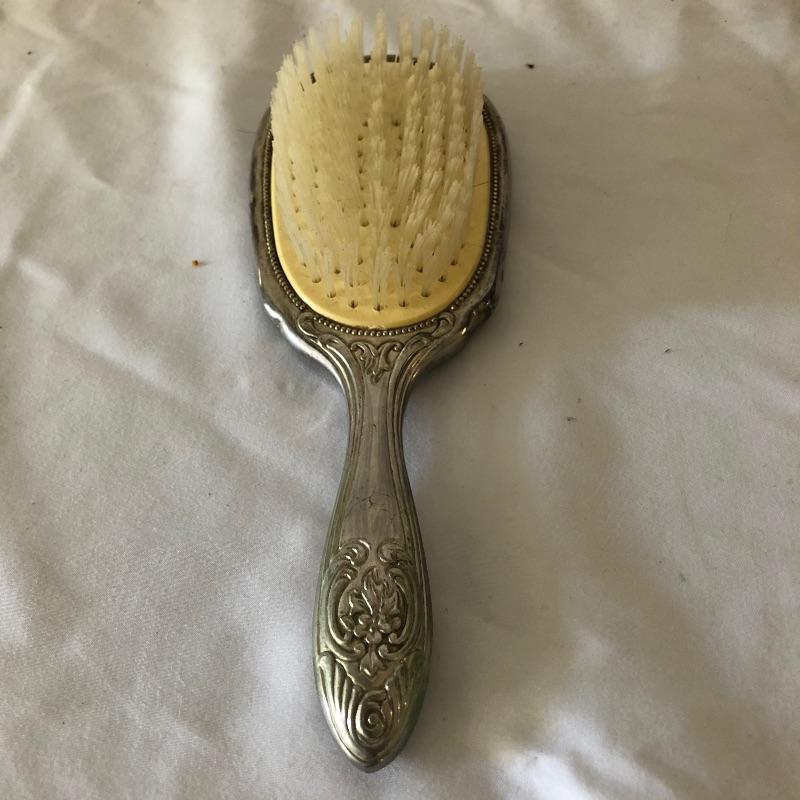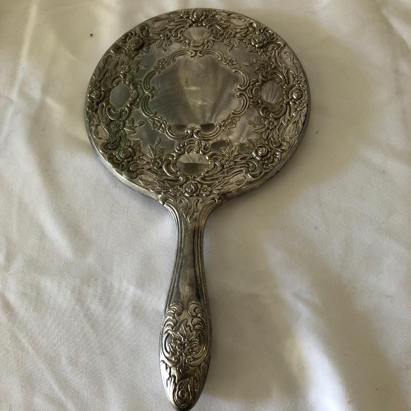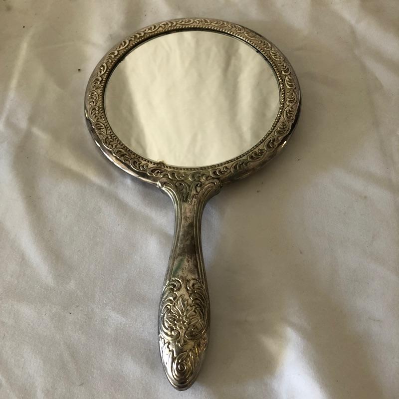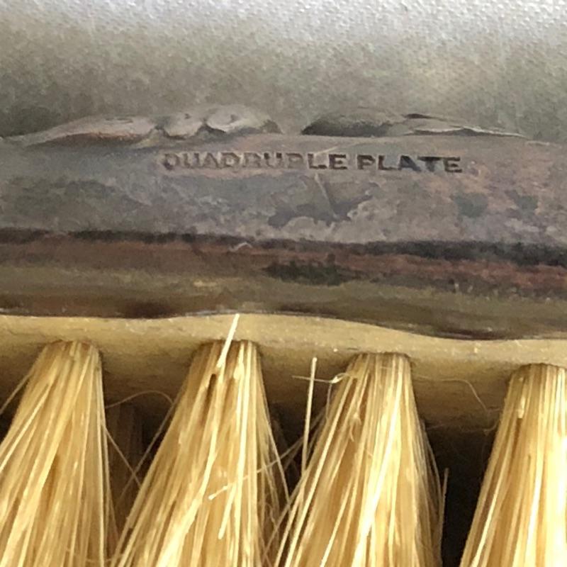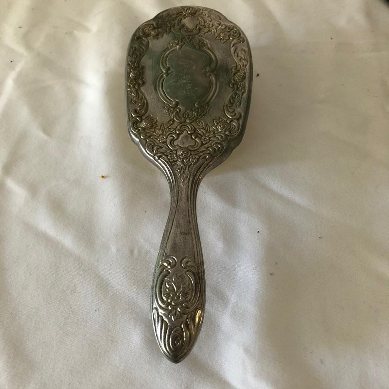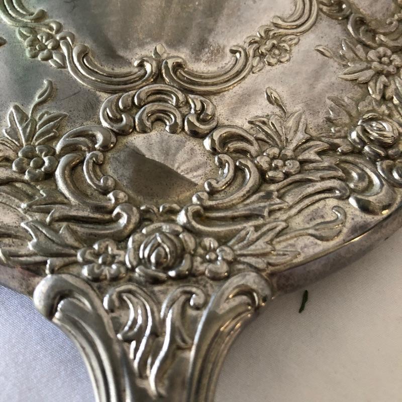 Both of these sets are as beautiful as each other. The brighter colored set is much heavier, but no markings were found. The brush in particular has some green marks that appear to be from oxidation and may not come clean; this set includes a mirror, comb and brush. The mirror has a very small chip, see image. The other set is quadruple silver-plate and includes a mirror and two brushes.