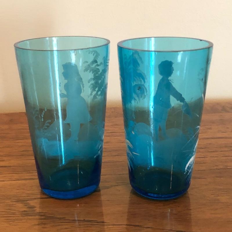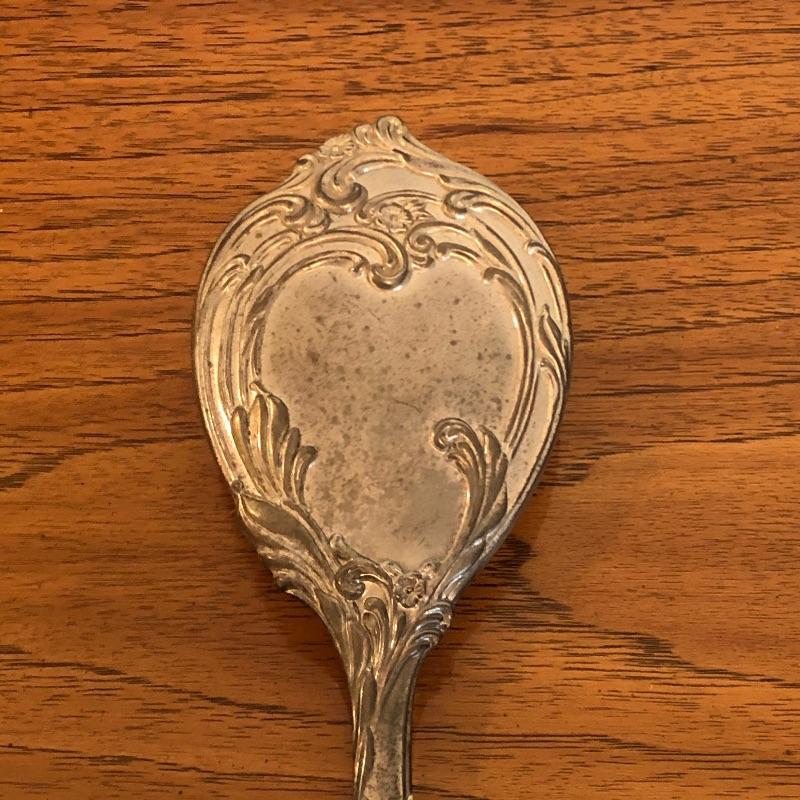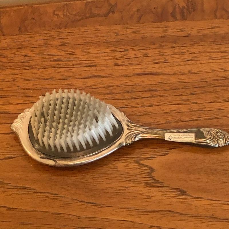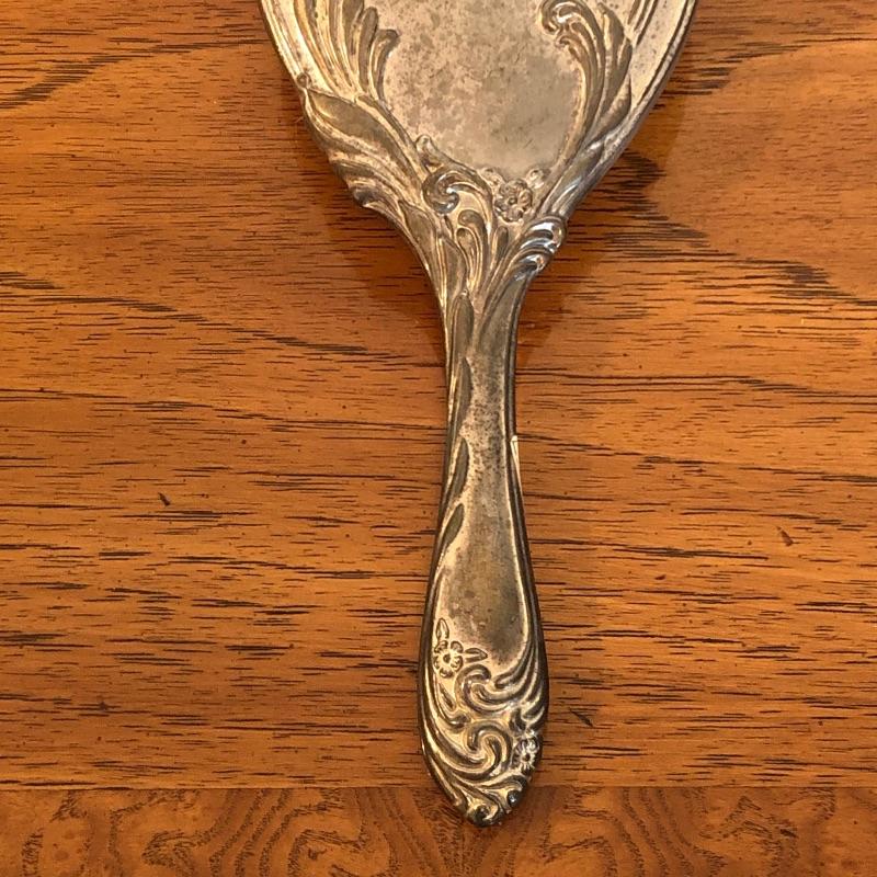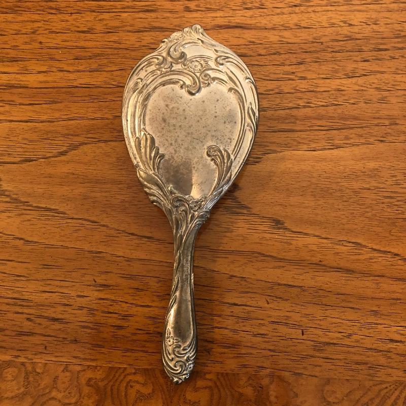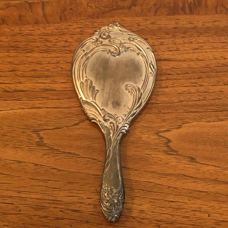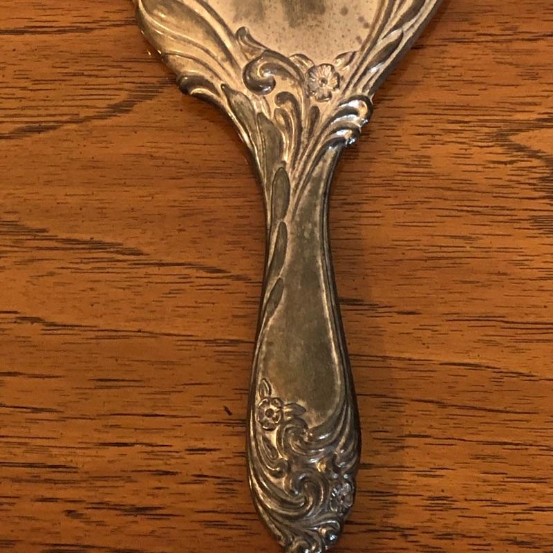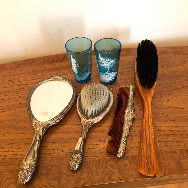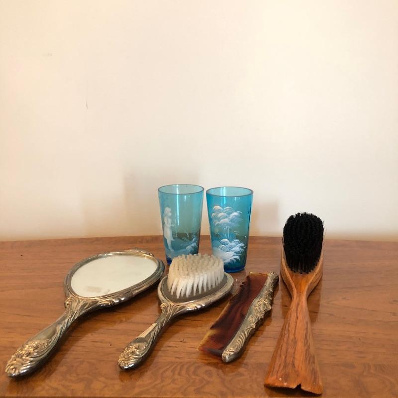 Unique vanity items and a pair of gorgeous small blue decorative etched glasses. The silver plate mirror, brush and comb are heavy. The wooden brush has a nick in the shoe horn part of the handle see photos.