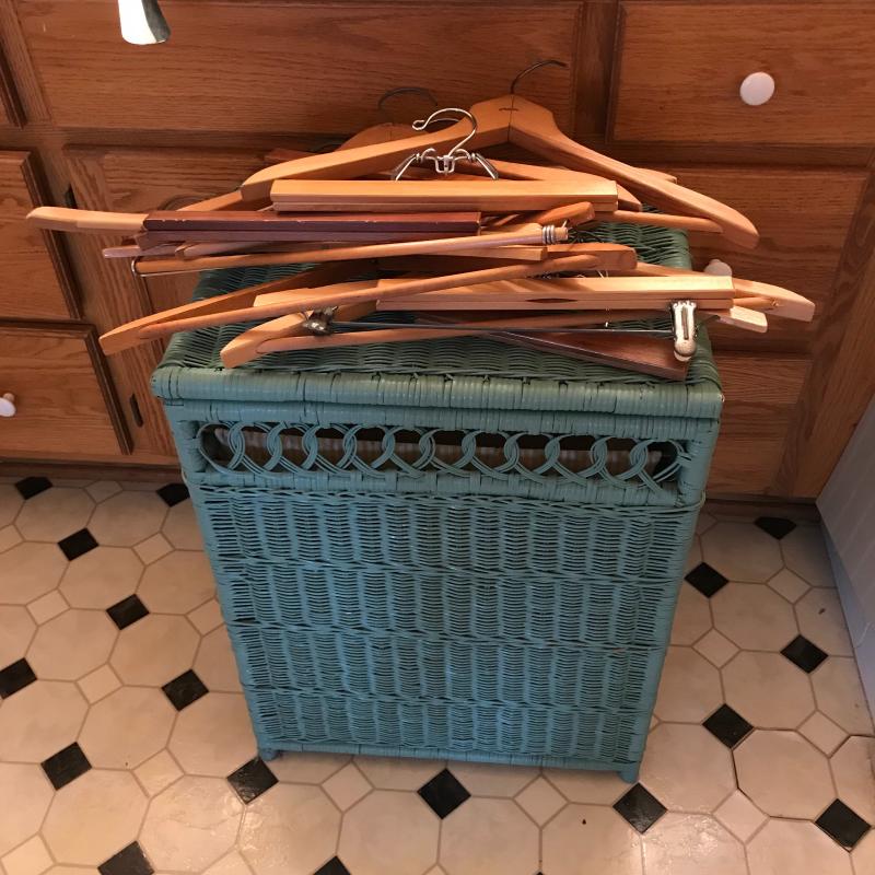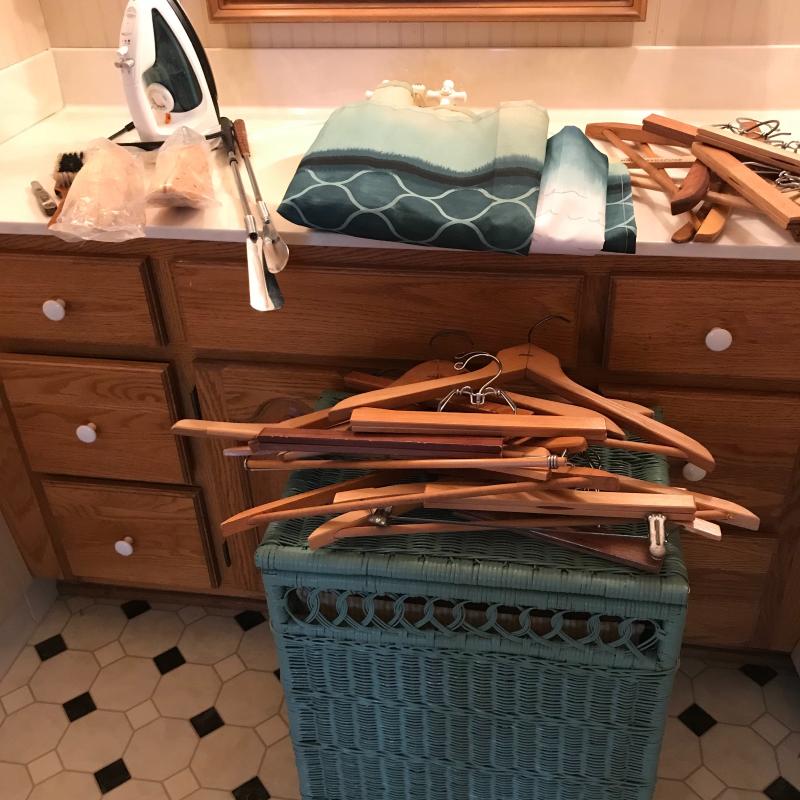 This lot contains unique and practical items for all your laundering needs. Includes many wooden hangers, shoe horns and forms, a lint brush, a shower curtain, an iron, and an awesome wicket vintage laundry hamper. No shipping available. Local pickup only in Flatrock, NC.