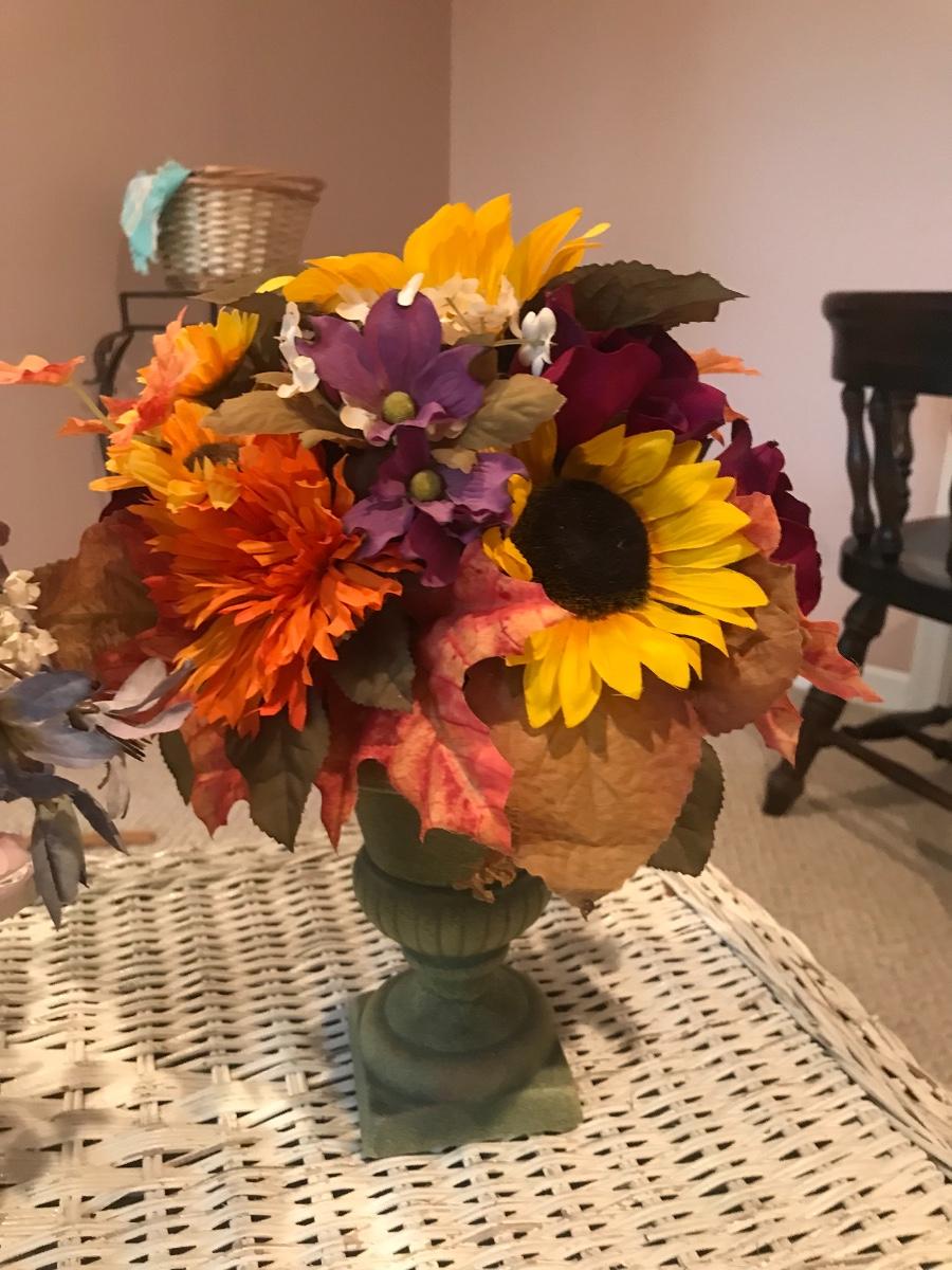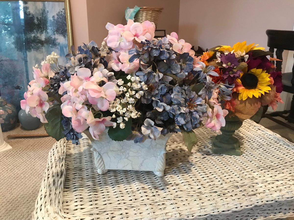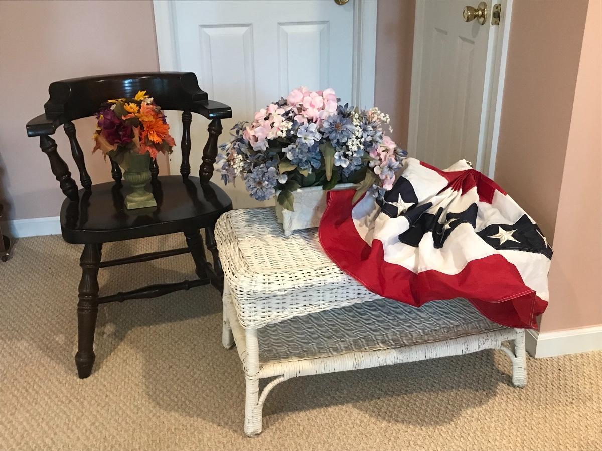 Two faux flower arrangements, a vintage wicker table, and a patriotic banner. Please see all pictures as they are the best representation of the items. The pictures show condition, measurements if taken, and what is included in the lot. Due to the large amount that we photograph and the time frame, we are not always able to take measurements. All items unless noted, are pre-owned and have been used. If you purchased furniture, you must bring help. We do not allow one person to carry large furniture out on their own. Bring help, tools and a truck for the safety of our client’s homes, and your personal safety. Company policy. Thank you.