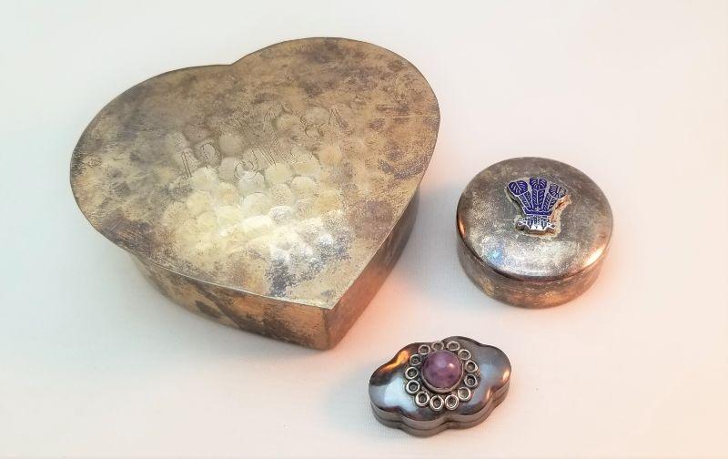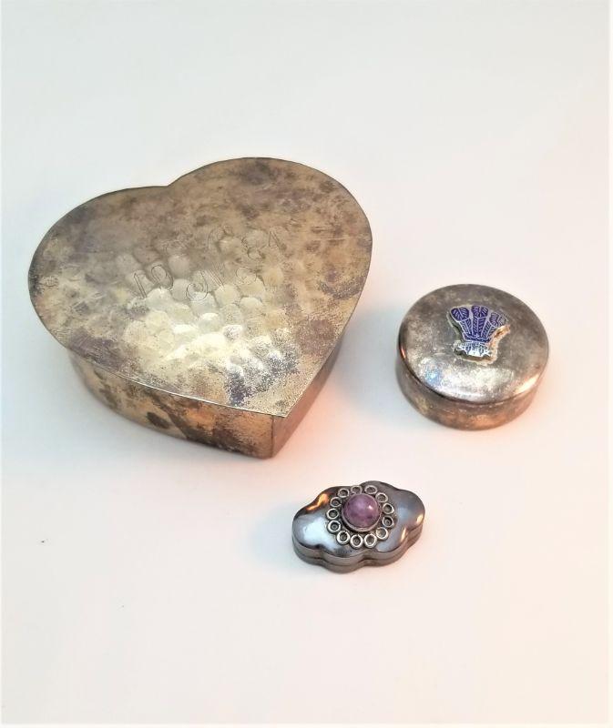 3 piece lot - silverplate trinket box - Krewe favor from Krewe of Mystery 1984 - small trinket box (Mystic Club, 1980 - enameled top - and small sterling silver pill box with a cabochon amethyst. Large trinket box is 3.5 inches across.