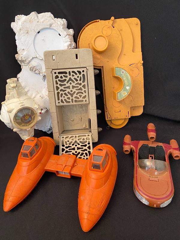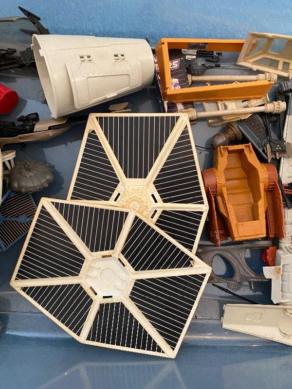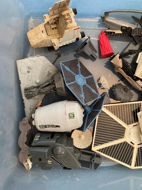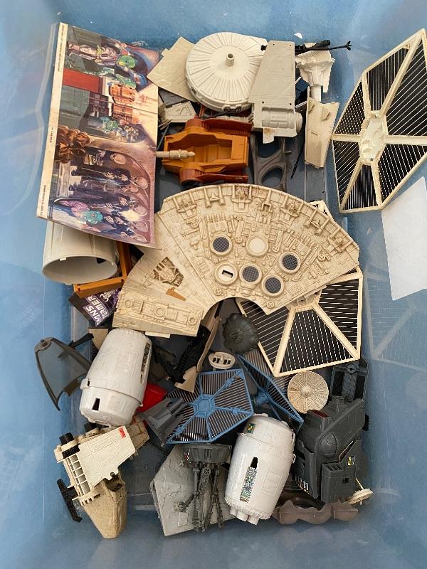 This is for a tote full of incomplete Star Wars vehicles that are incomplete, perfect for parts lot. Pics show content best. All collectibles have been photographed from every angle as they are the best representation of the item. While items may be listed as new, they are vintage or new old stock, and have been stored for some time. Please check all pictures for the edges of the packaging, as these are vintage the glue from the seal may have come loose, and if so, a picture will show. Please see pictures for exactly what you are getting and the condition. Anything extra about the condition will be noted at the beginning of the description. Thank you for looking and have fun bidding.
