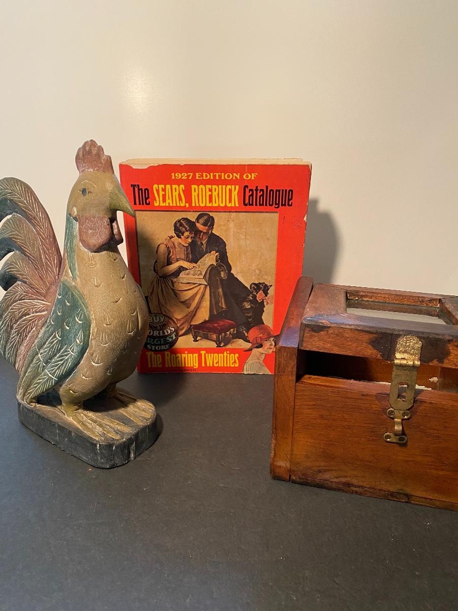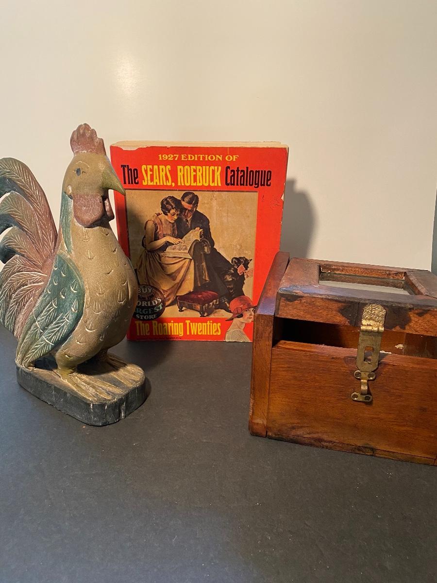 Lot 180: Primitive Candle Box, Sears Roebuck Catalog and Rooster