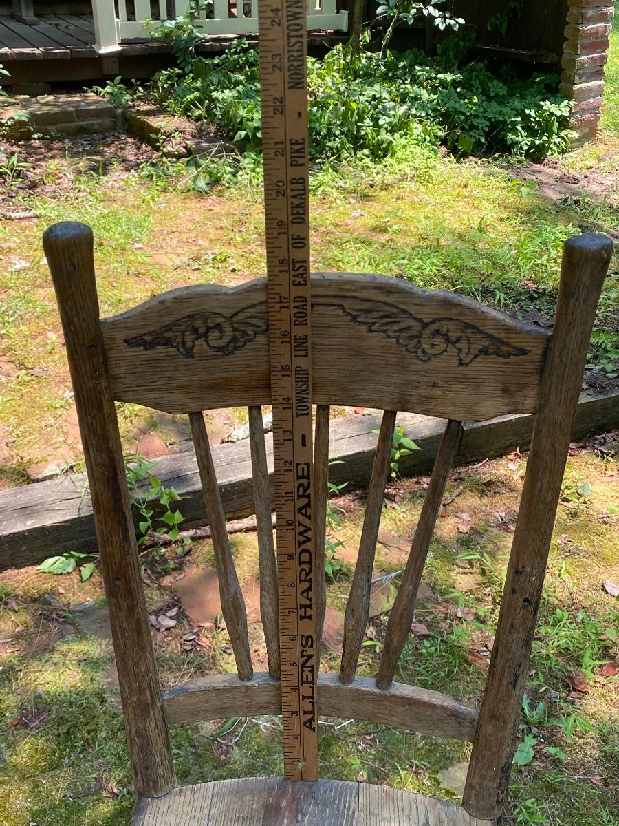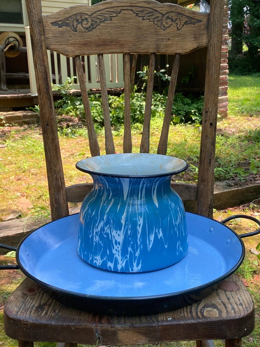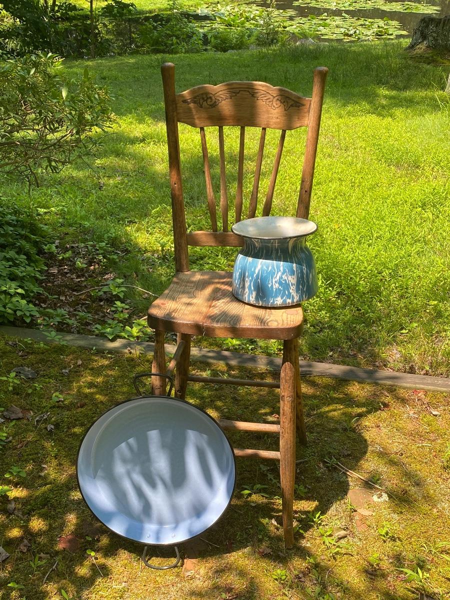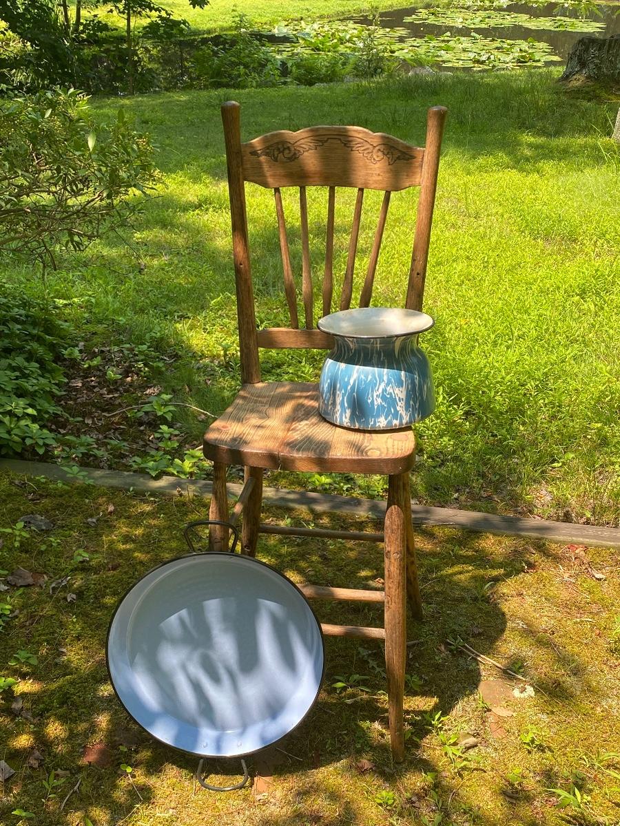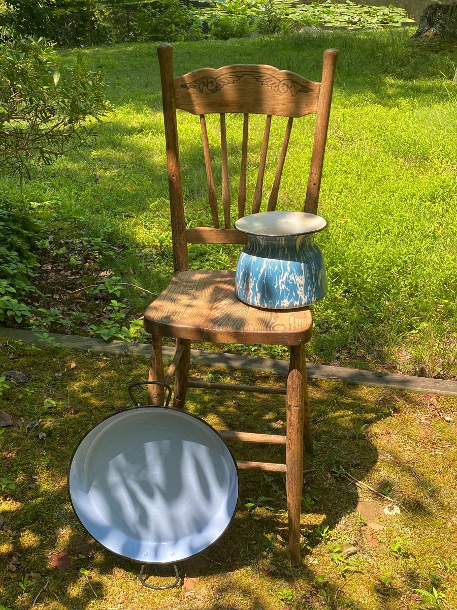 This chair is unique in that it is primitive and tall, would look amazing on porch to with a plant, while it is tall, it is thin. Also included is a large handled enamelware tray that still looks new and marbled enamelware urn that shows its age. Please see pictures as they are the best representation of the item, the condition of the item, and the size of the item.
