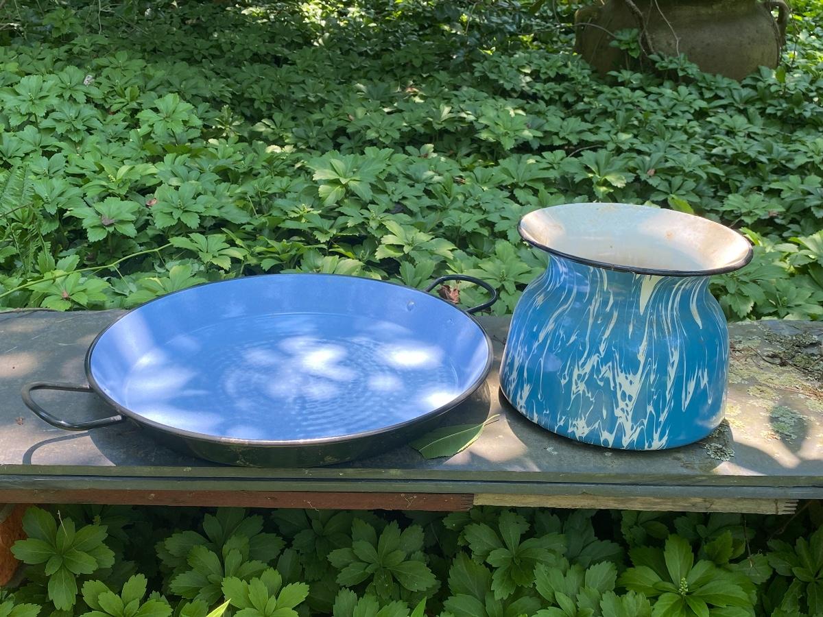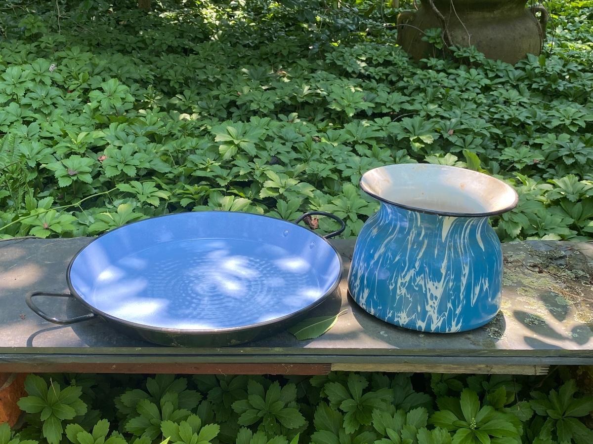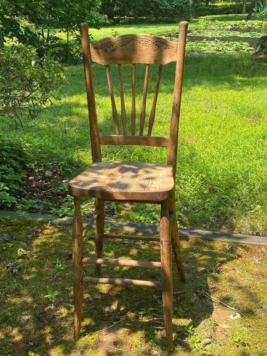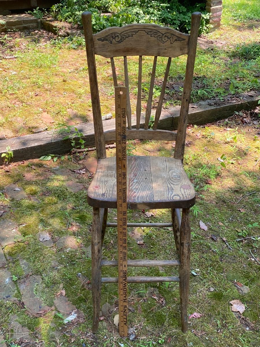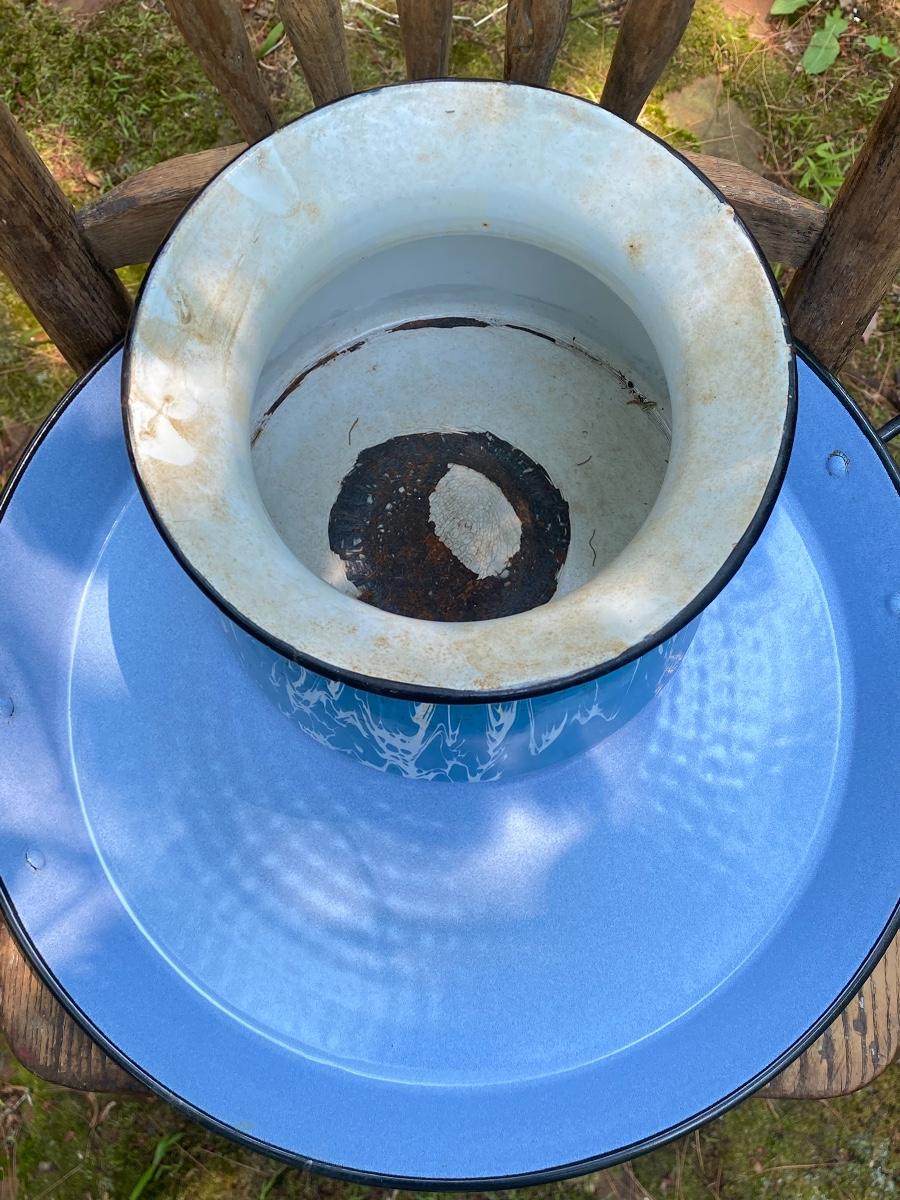 This chair is unique in that it is primitive and tall, would look amazing on porch to with a plant, while it is tall, it is thin. Also included is a large handled enamelware tray that still looks new and marbled enamelware urn that shows its age. Please see pictures as they are the best representation of the item, the condition of the item, and the size of the item.