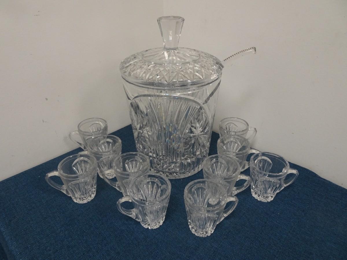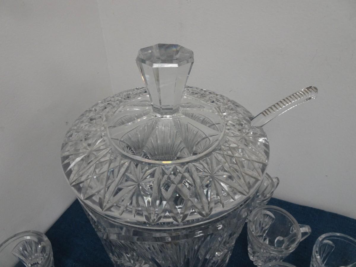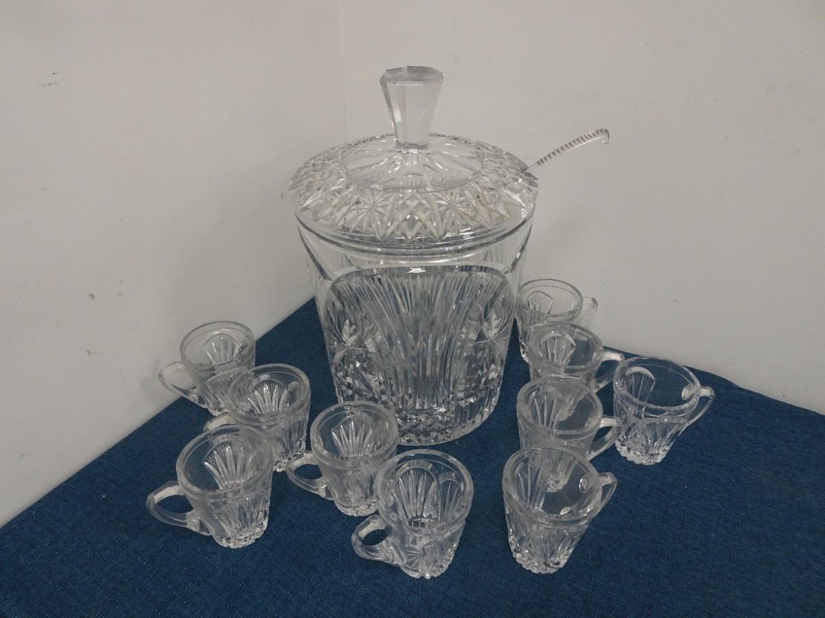 LOT 180. CRYSTAL LIDDED PUNCH BOWL WITH LADLE AND 8 CUPS
