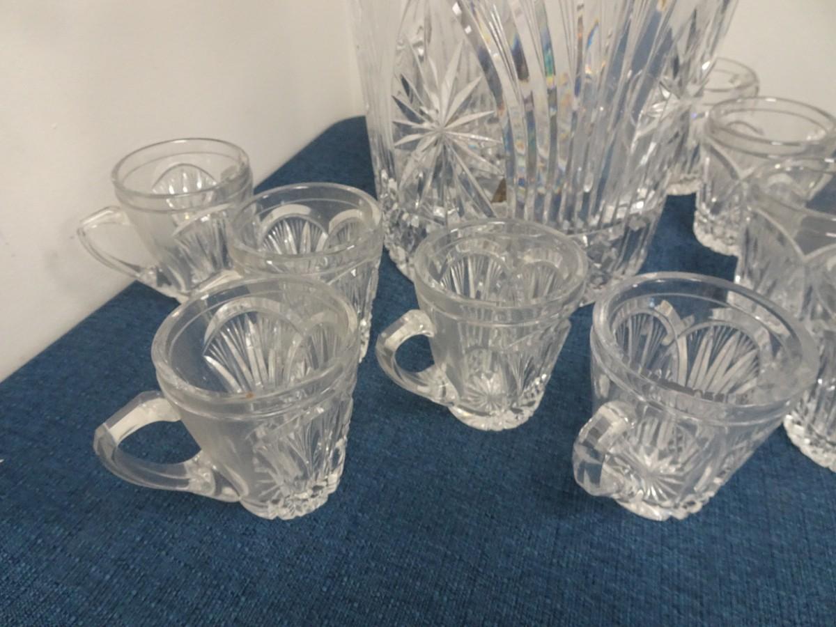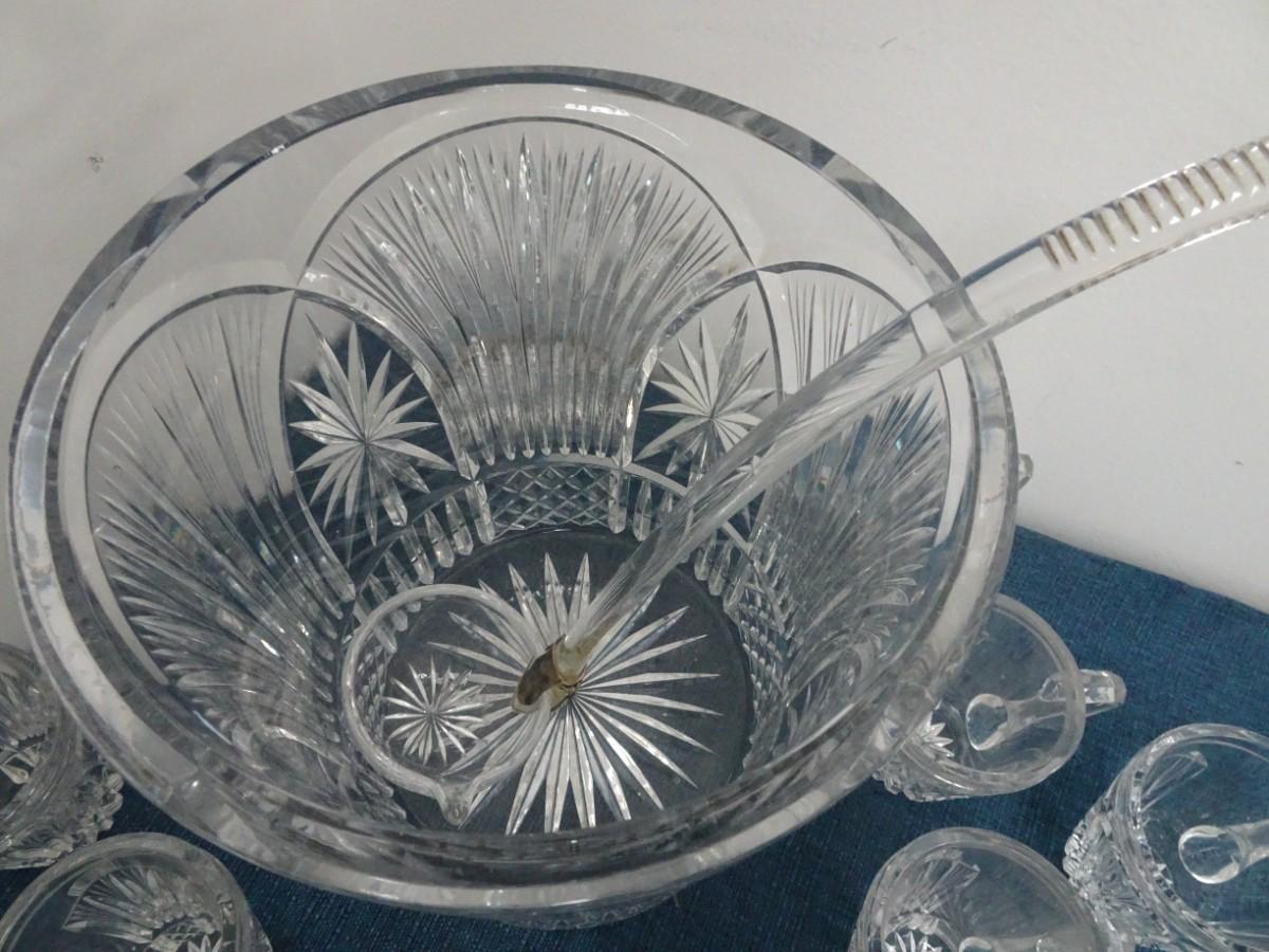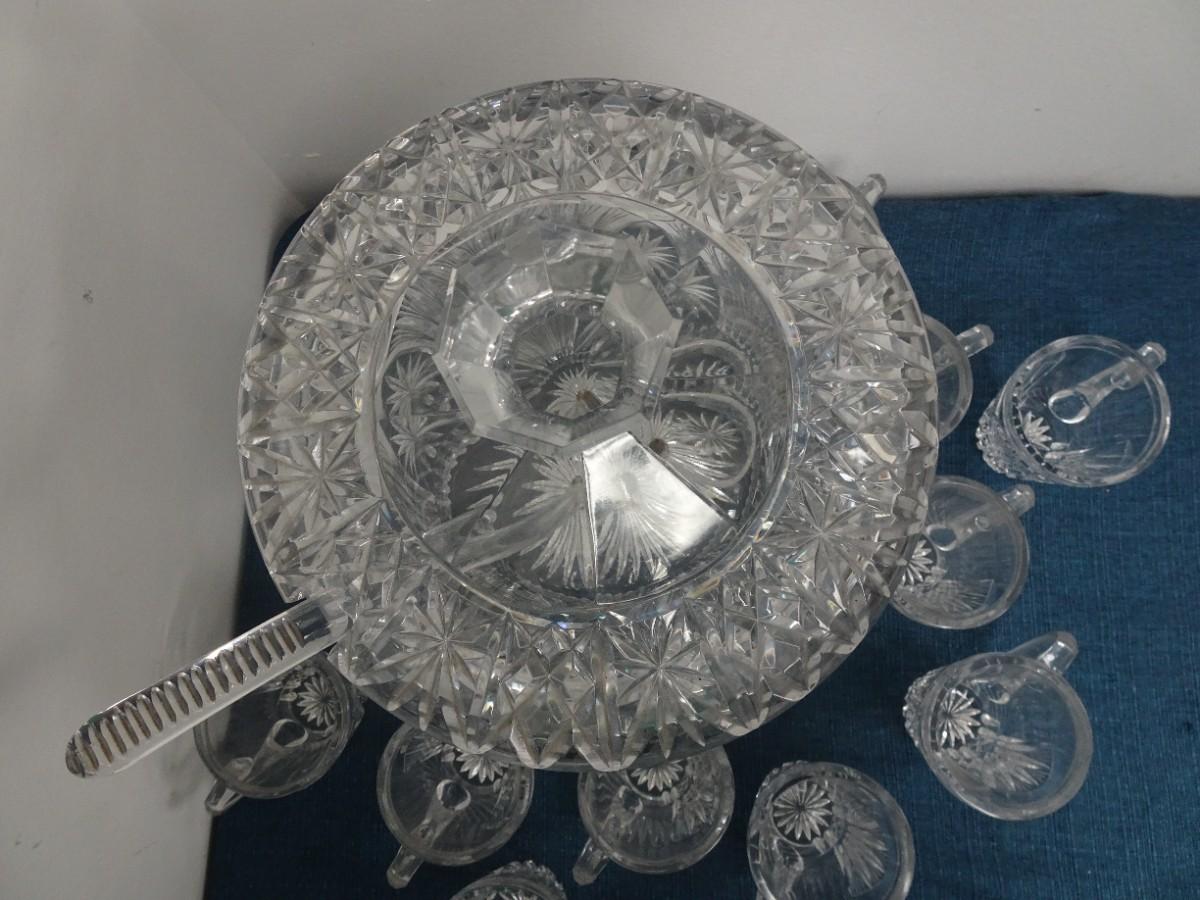 LOT 180. CRYSTAL LIDDED PUNCH BOWL WITH LADLE AND 8 CUPS