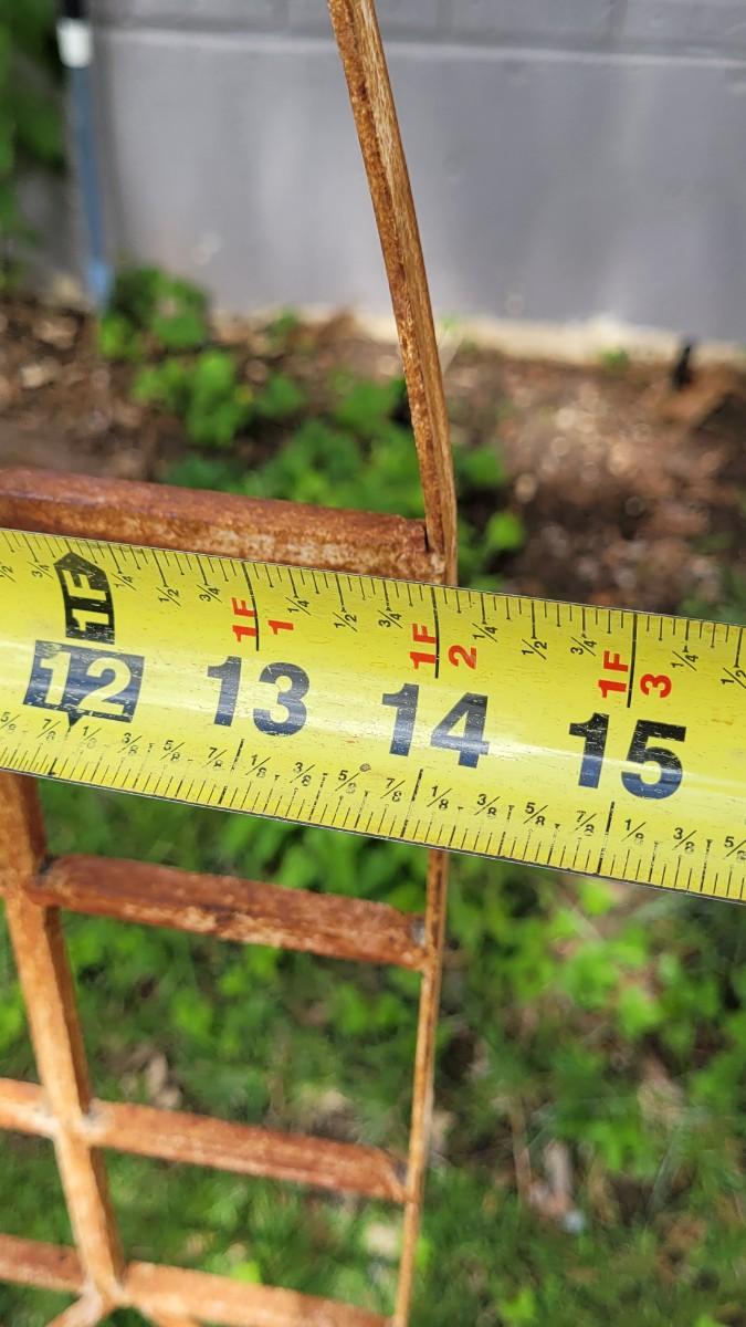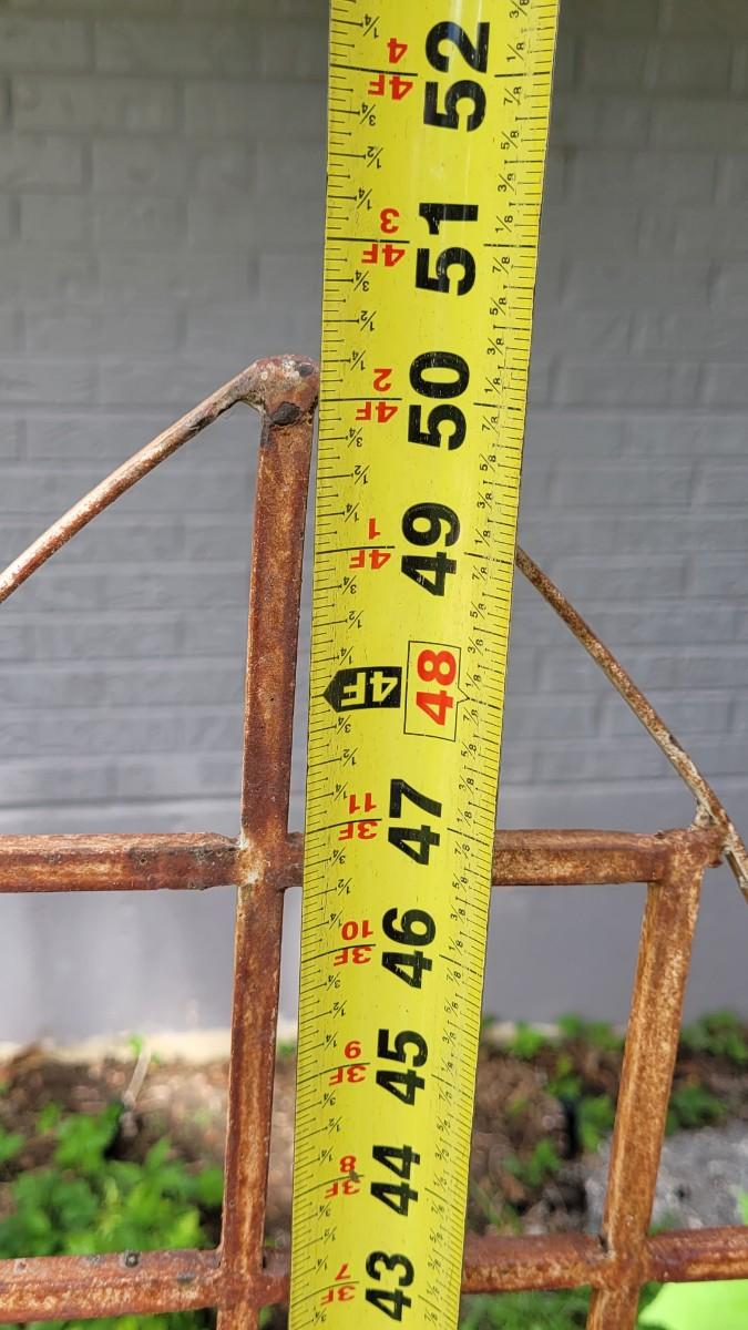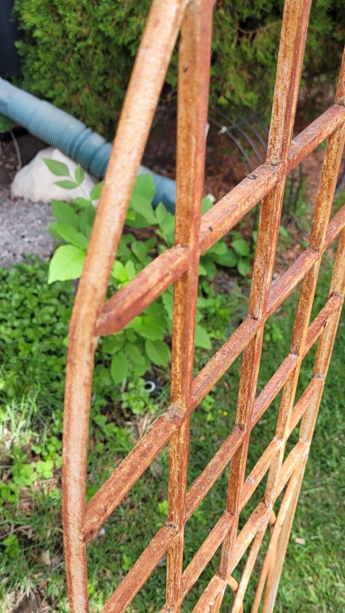 This sturdy metal Trellis is rusty white. It sticks into the ground easily and will complement many types of landscaping.