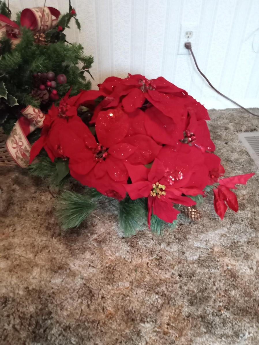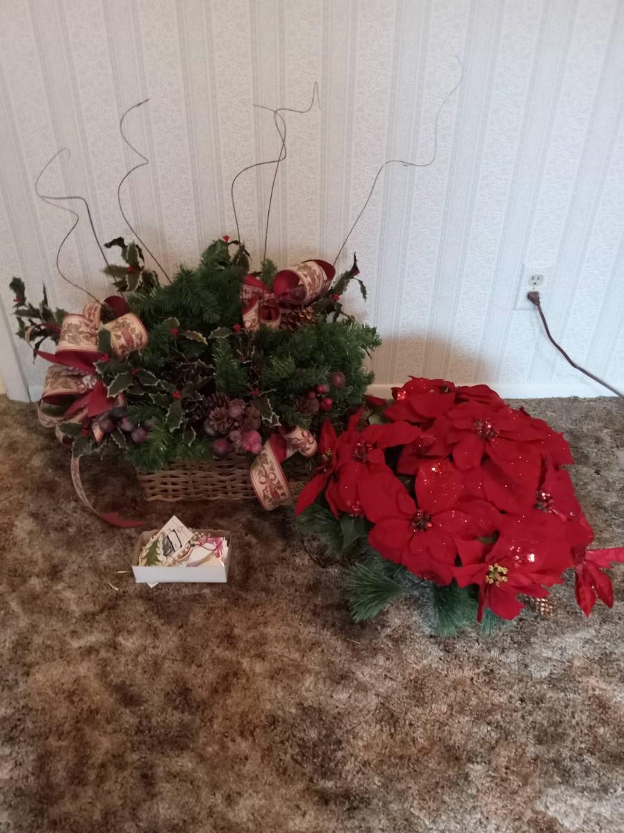 LOT 180 LARGE HOLIDAY CENTERPIECE, GIFT TAGS AND FAUX POINSETTIAS