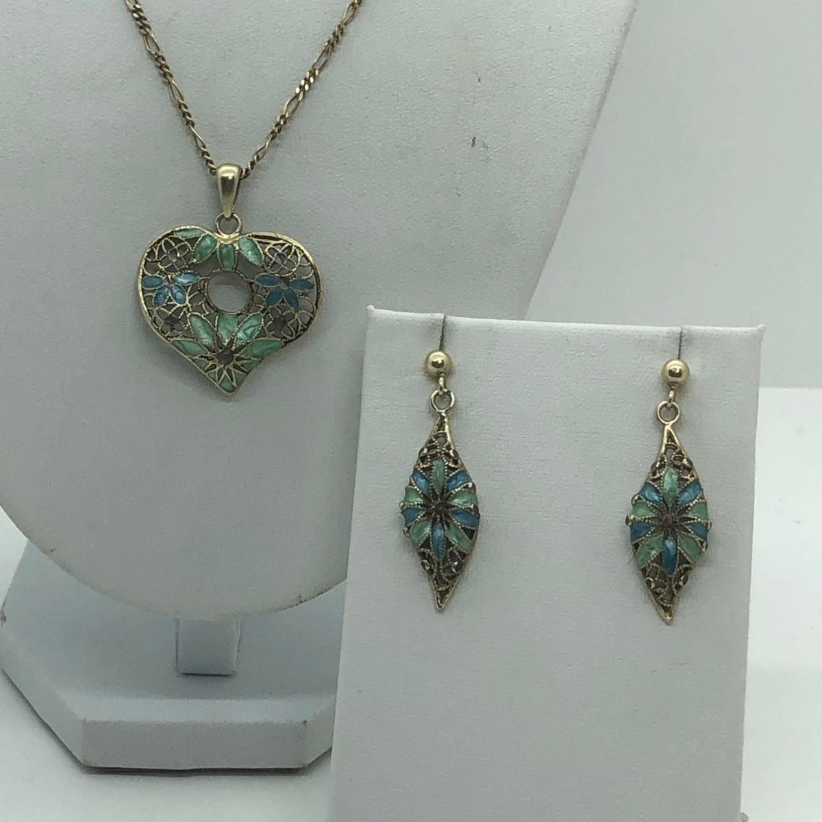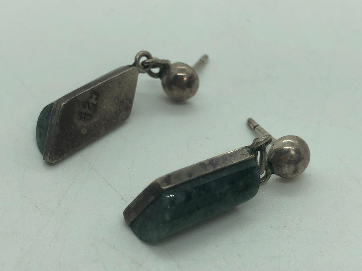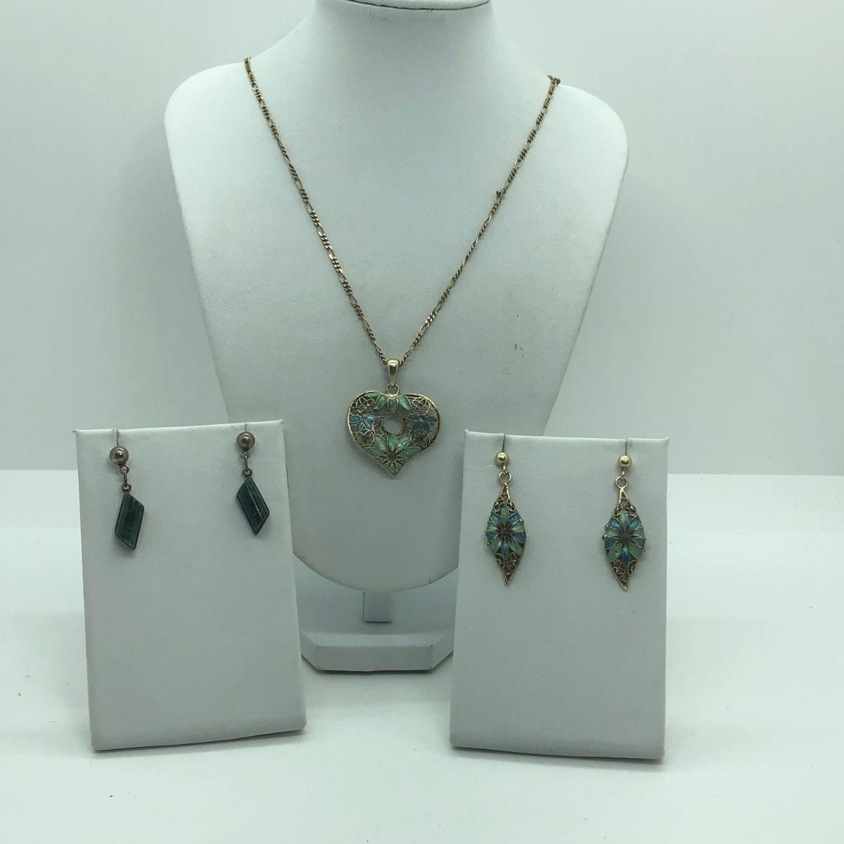 A matching necklace and earring set and another pair of earrings, also sterling silver.