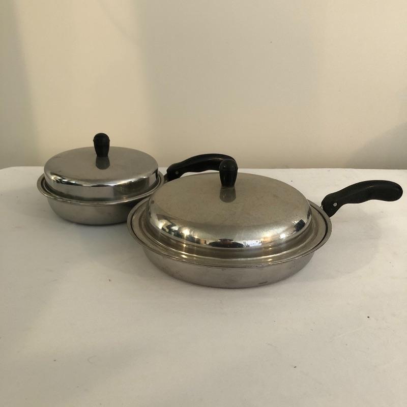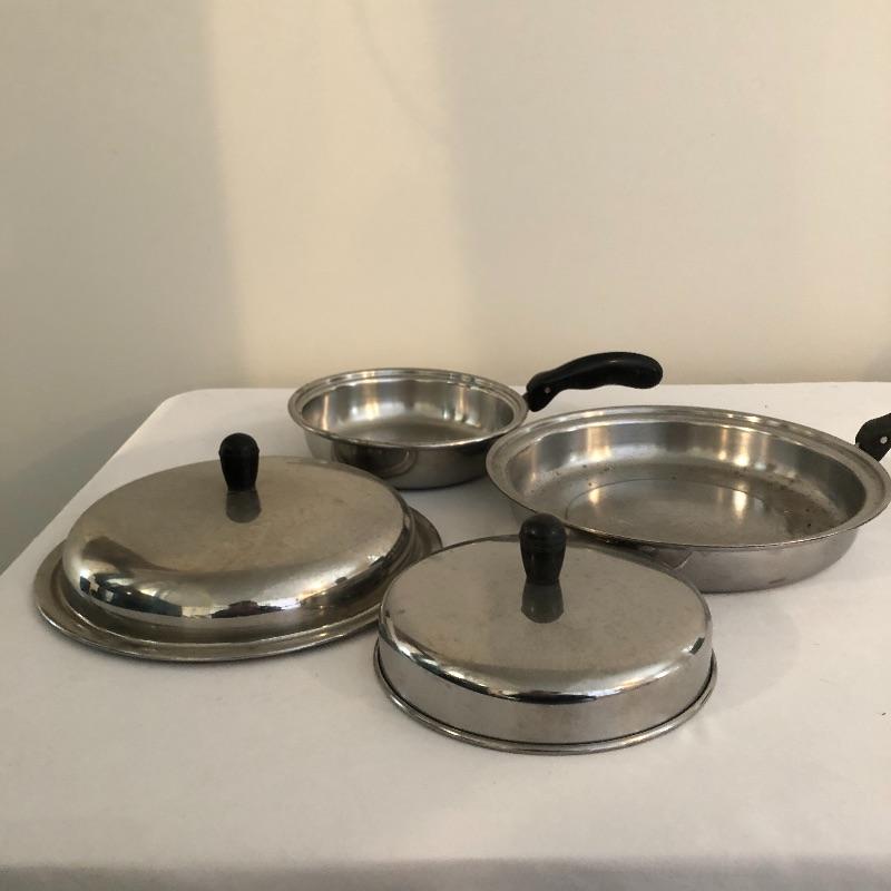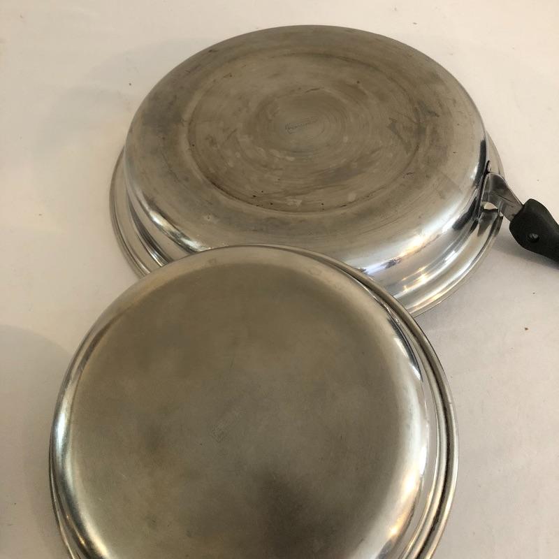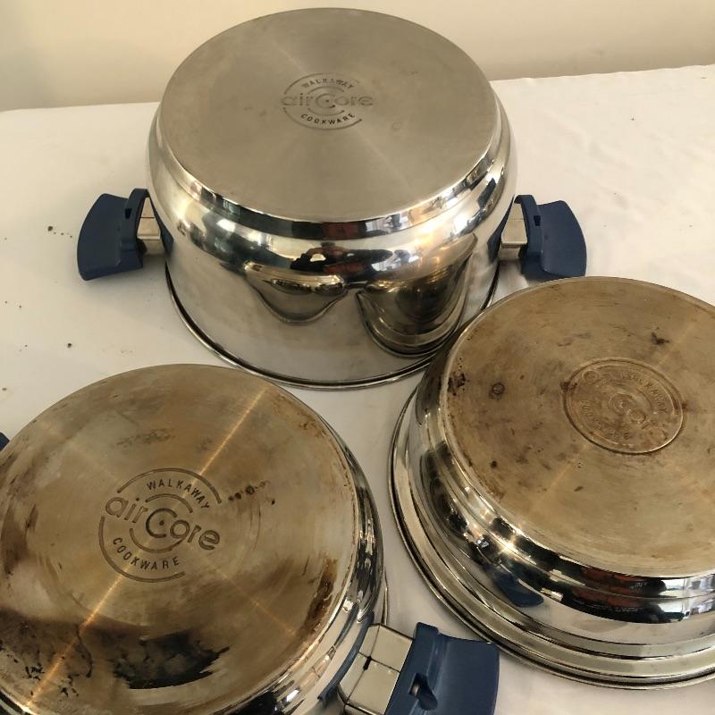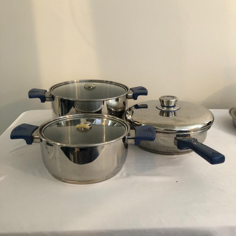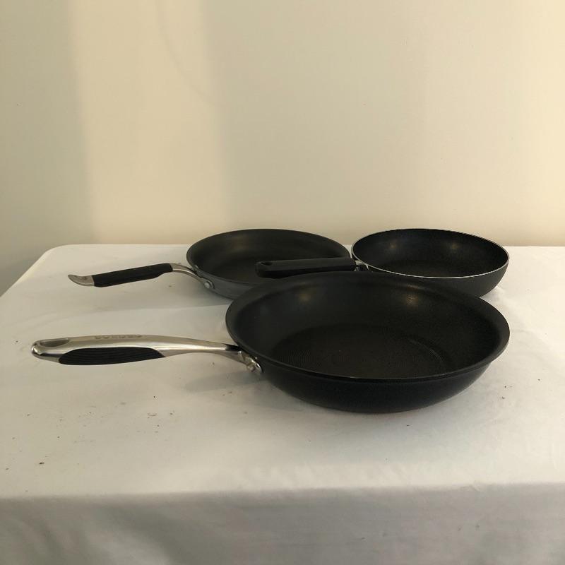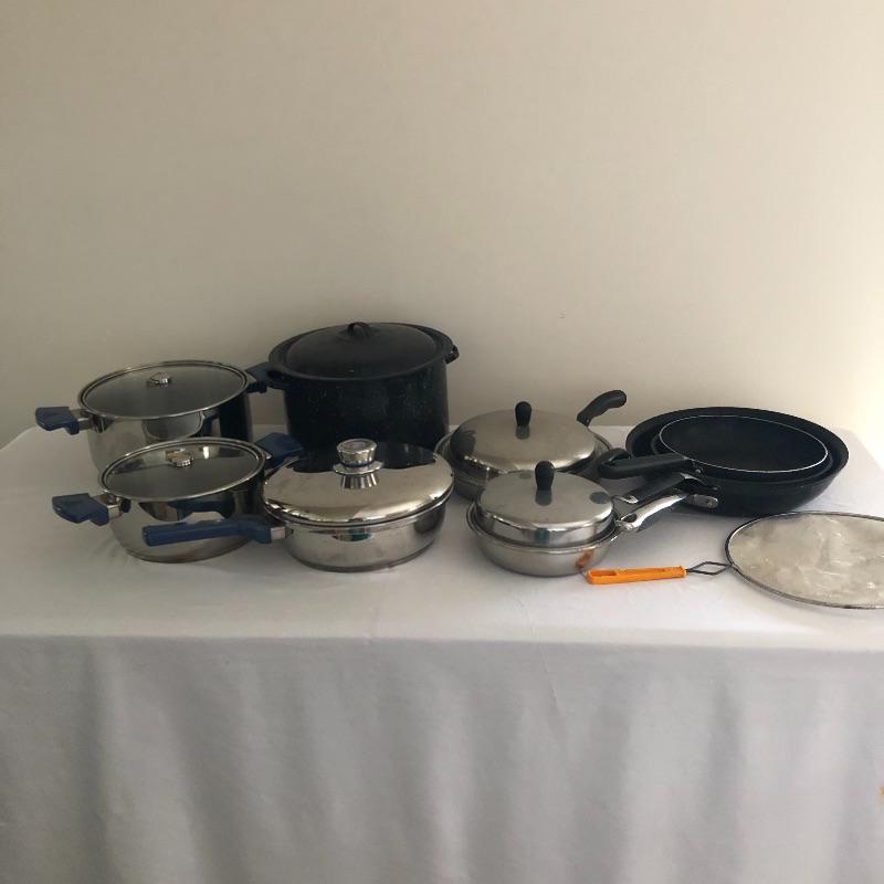 Get your kitchen kitted out with this selection of pots and pans. Lot includes three AirCore pots with lids, two Permanent pans with lids, large black enamel pot with lid, Gourmet pan, Calphalon pan and a Circulon pan. Largest pot measures 12.5”D x 7.5” tall. fry screen included too.